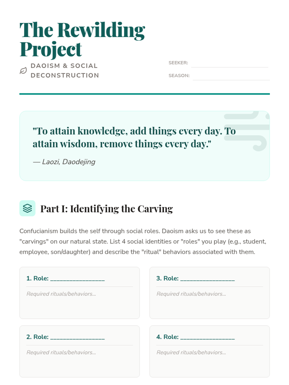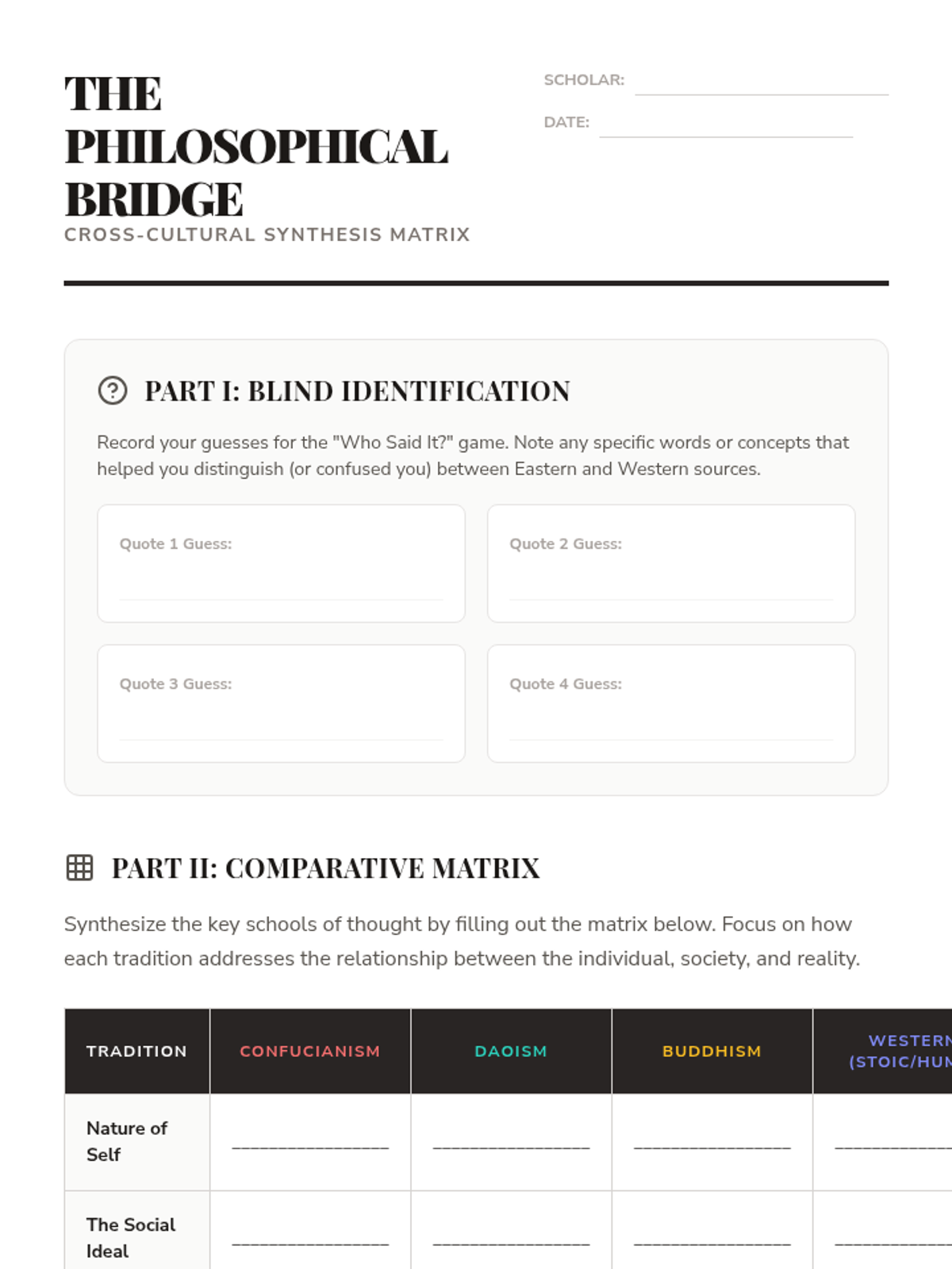 A comprehensive exploration of Eastern philosophical traditions, focusing on Confucianism, Daoism, and Buddhism. This sequence challenges Western notions of the self and social order through comparative analysis and primary source engagement.