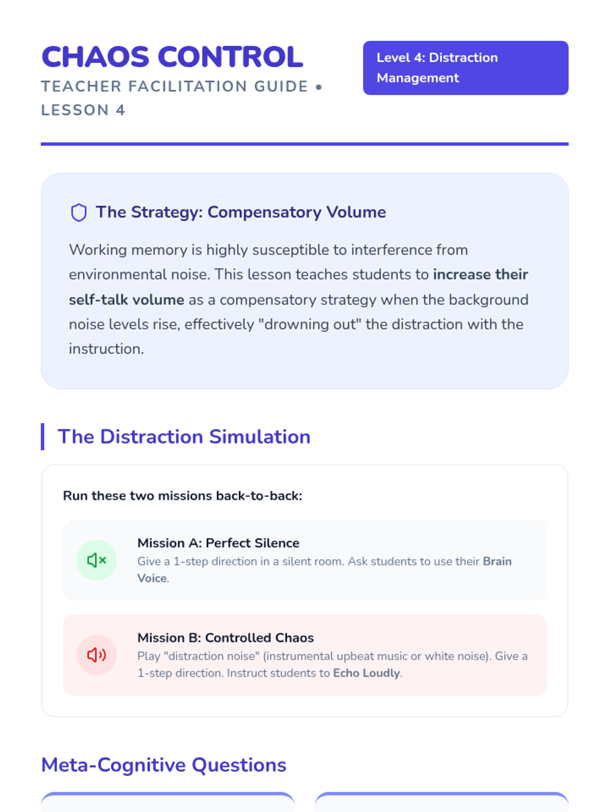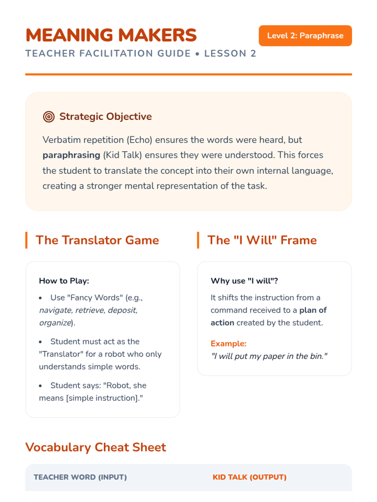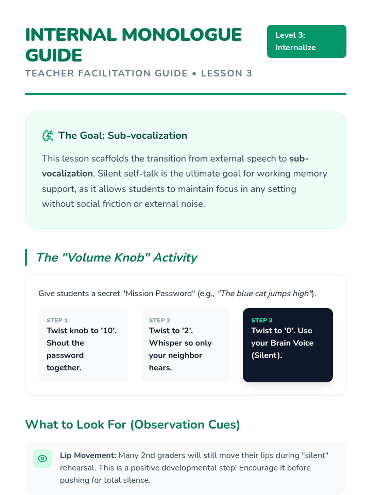 A sequence for 2nd-grade students focusing on verbal rehearsal and self-talk techniques to support working memory and single-step direction following. Students progress from loud repetition to silent inner speech, learning to monitor their focus and advocate for themselves.