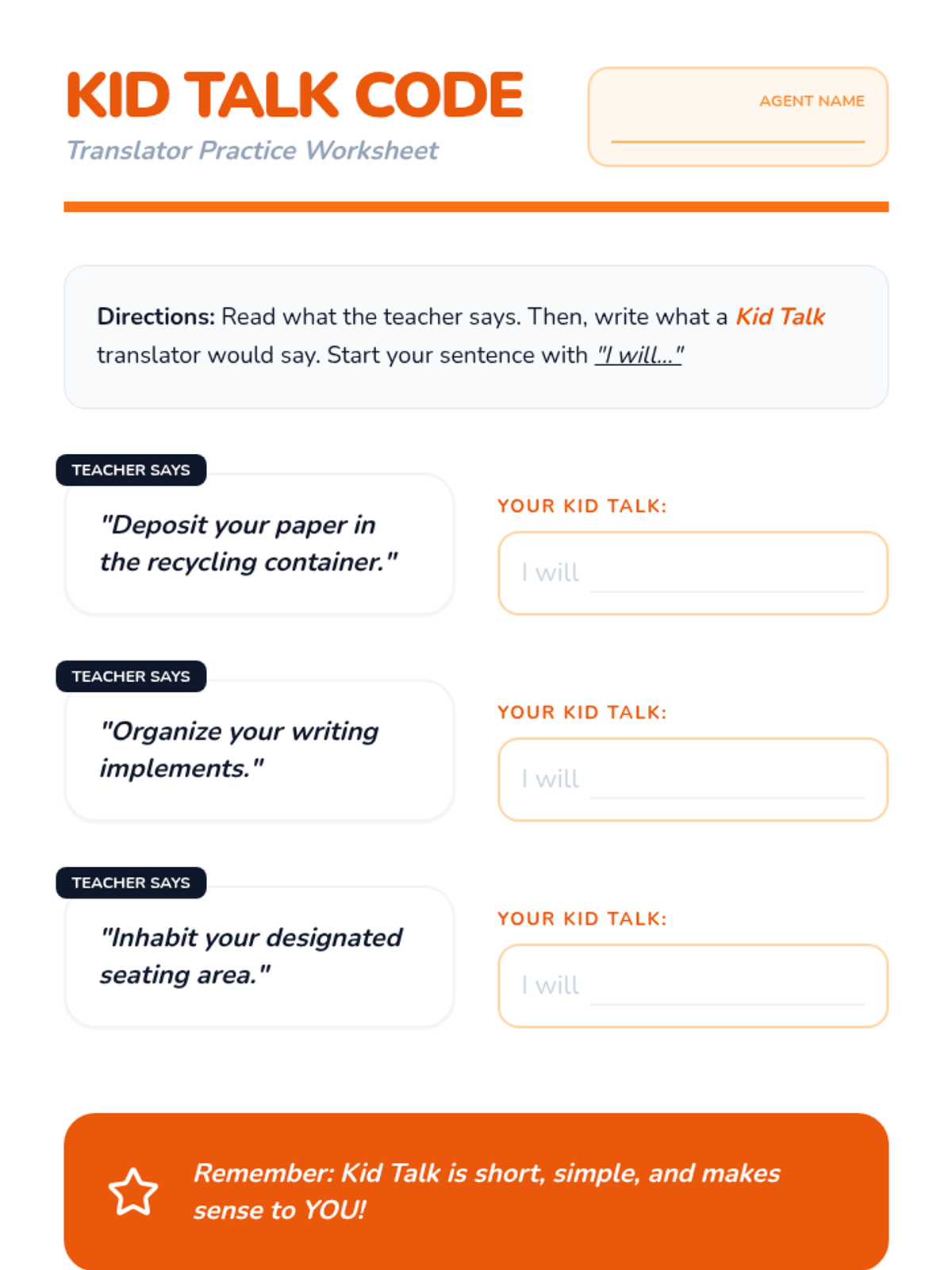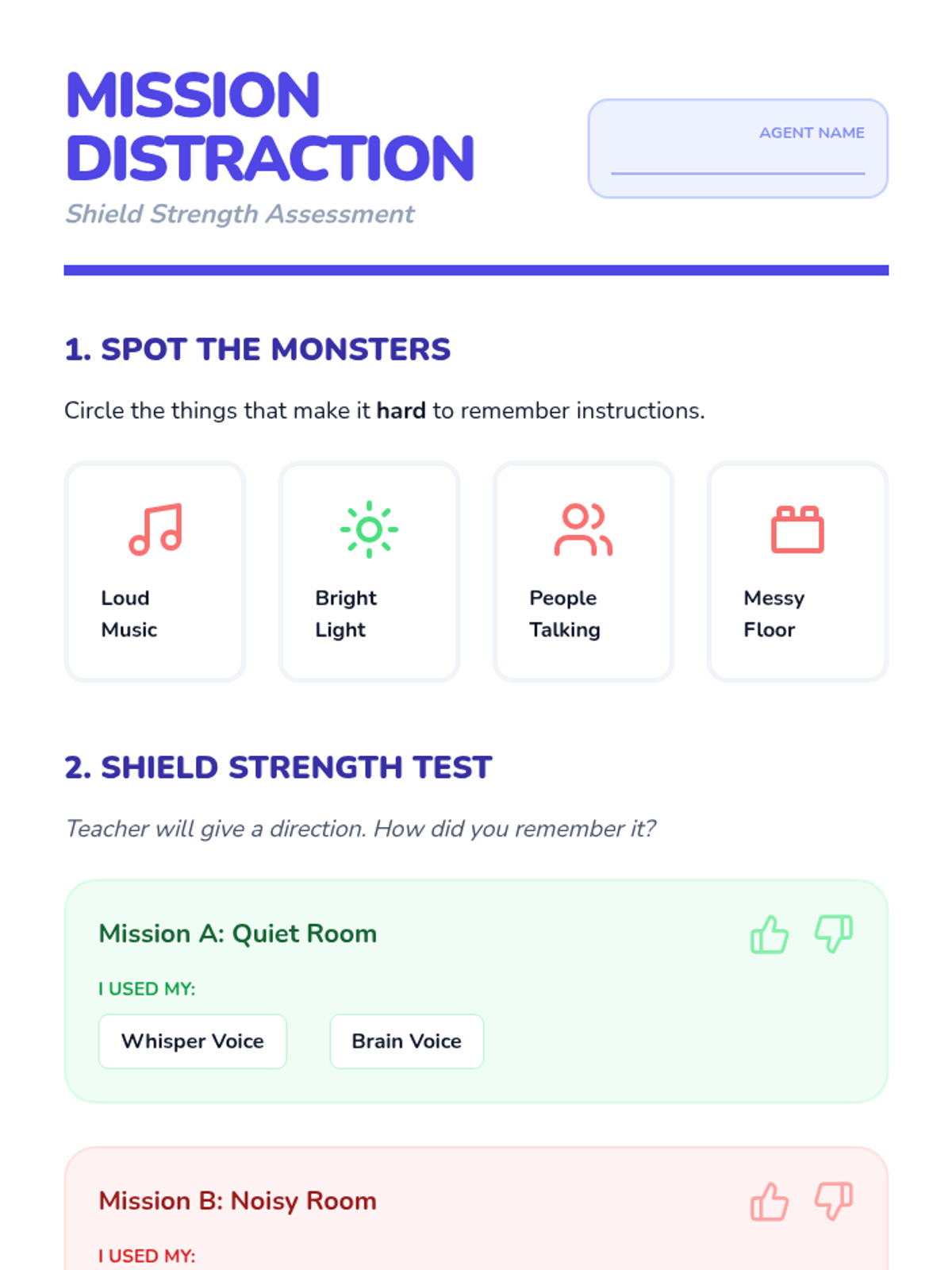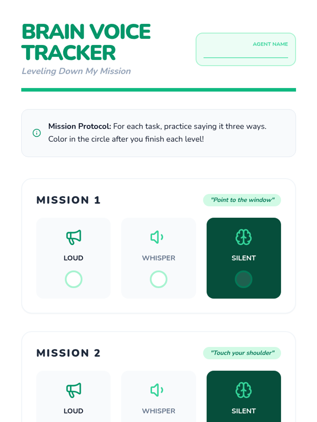 A sequence for 2nd-grade students focusing on verbal rehearsal and self-talk techniques to support working memory and single-step direction following. Students progress from loud repetition to silent inner speech, learning to monitor their focus and advocate for themselves.