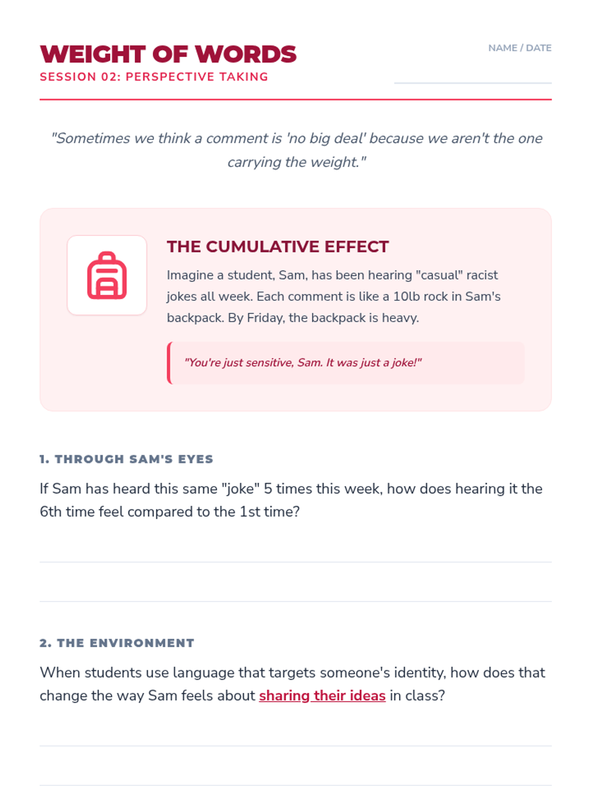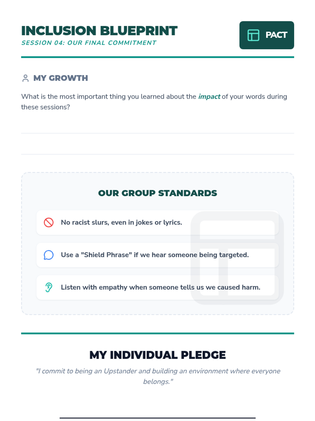 A 4-session small group series designed to help students understand the impact of harmful language, develop empathy, and practice upstander strategies to build an inclusive environment. The series uses the 'Echo Effect' metaphor to illustrate how words ripple through a community.