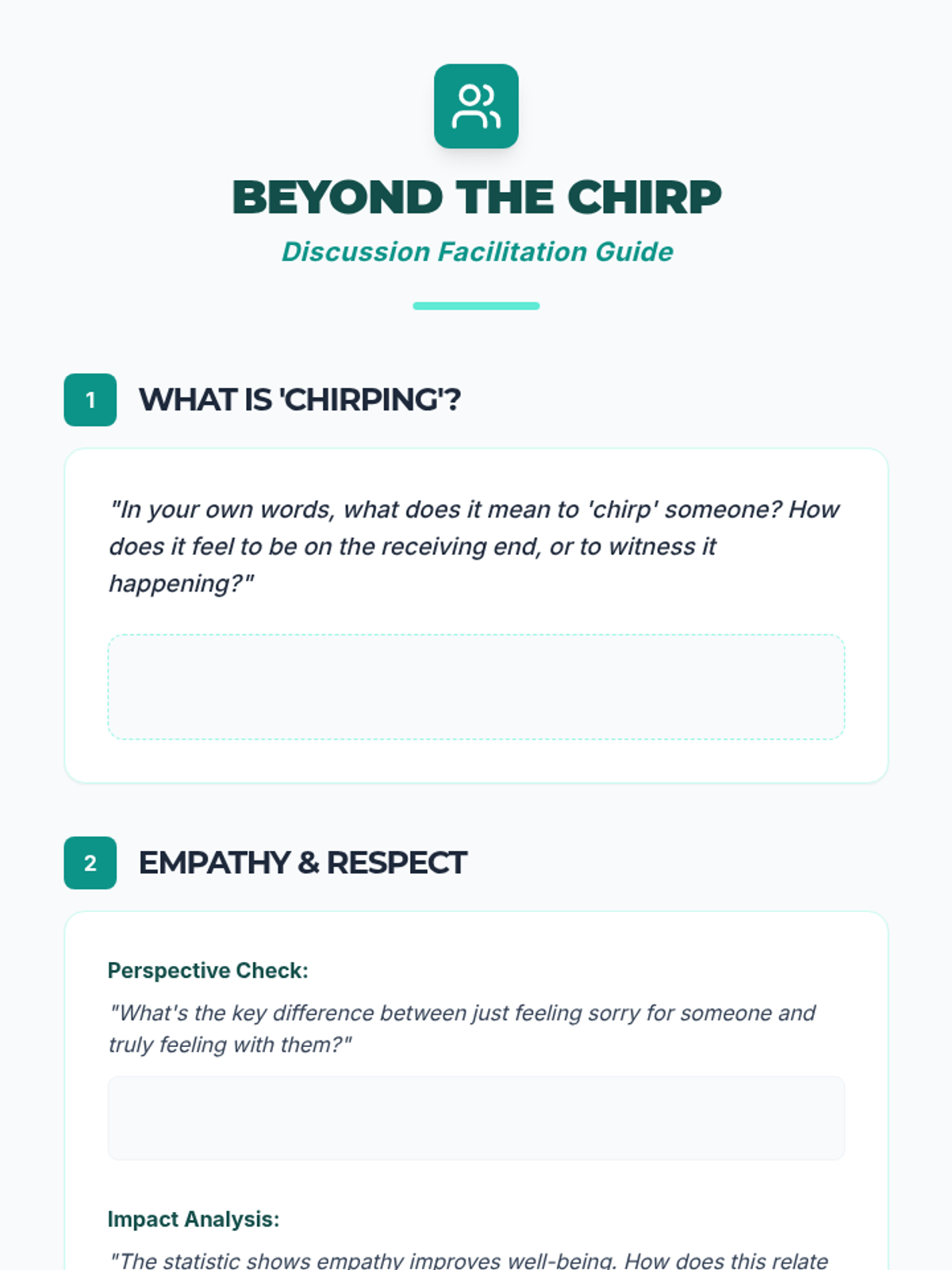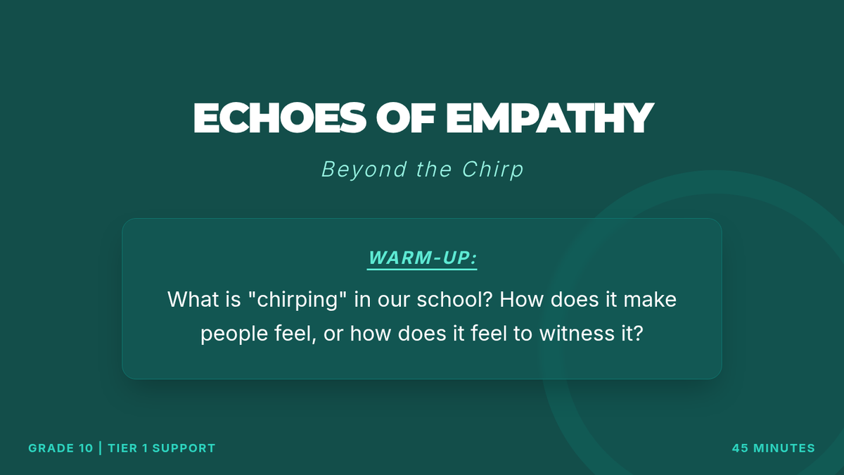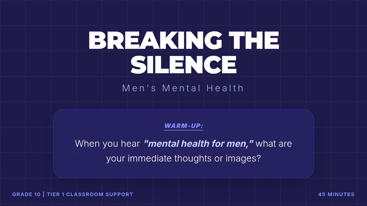 A three-part sequence for high school sophomores designed to cultivate empathy, reduce 'chirping' behavior, and break the stigma around men's mental health. Students explore perspective-taking, the power of words, and self-care strategies.