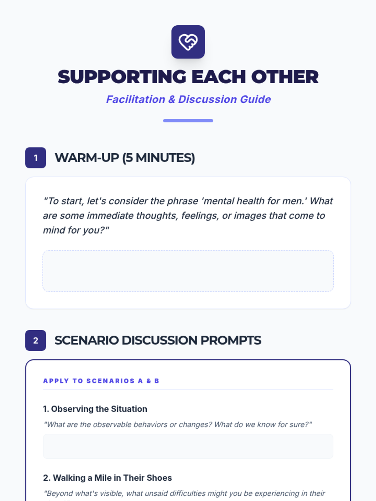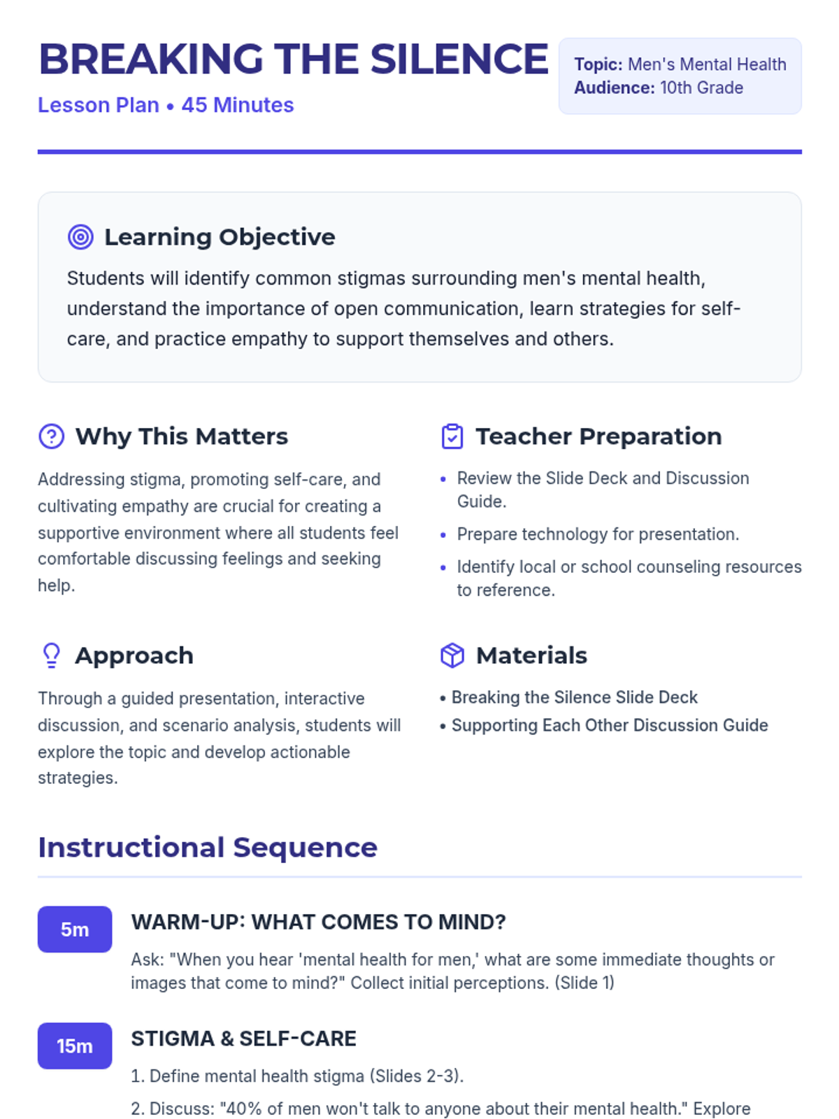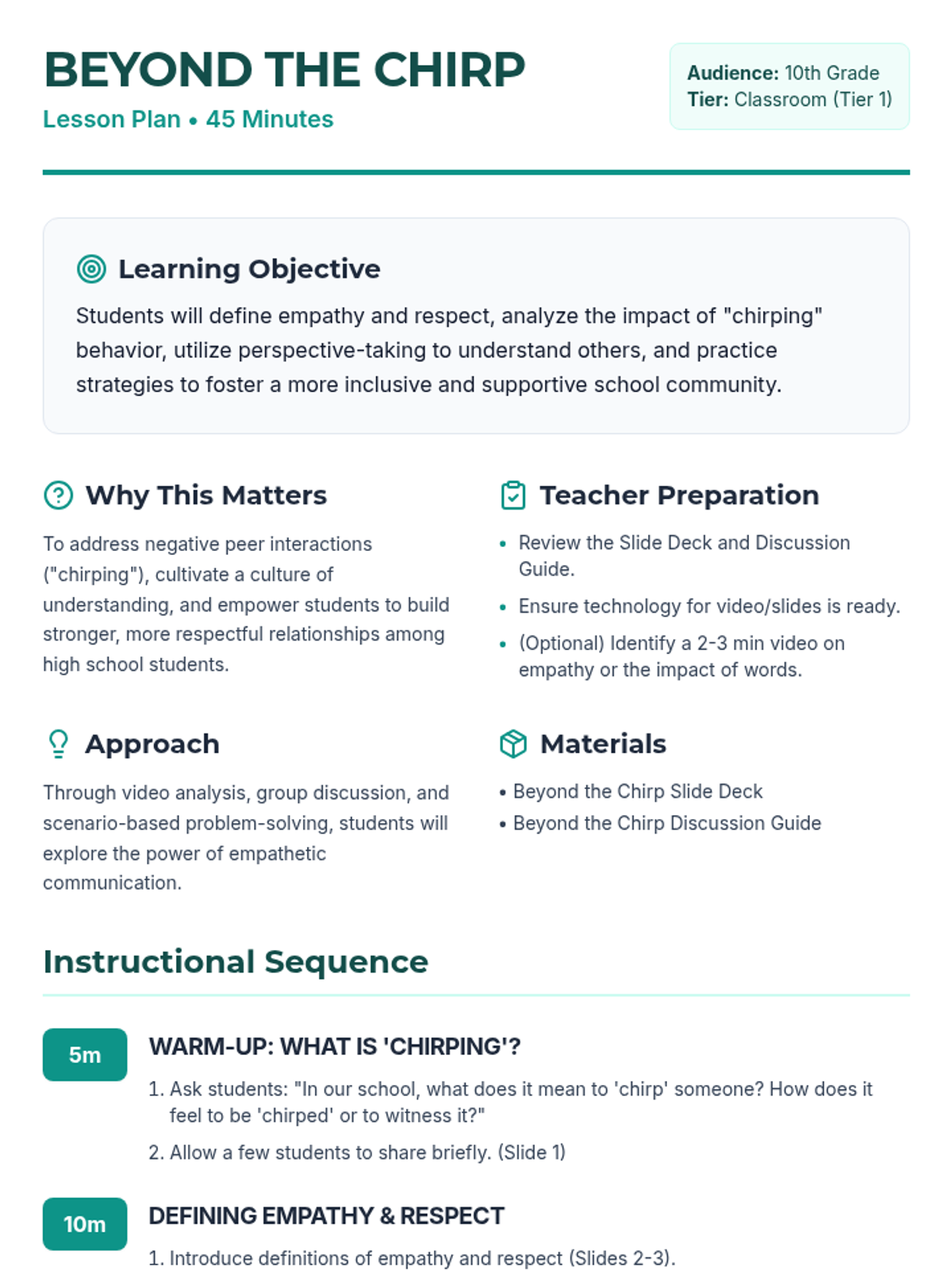 A three-part sequence for high school sophomores designed to cultivate empathy, reduce 'chirping' behavior, and break the stigma around men's mental health. Students explore perspective-taking, the power of words, and self-care strategies.