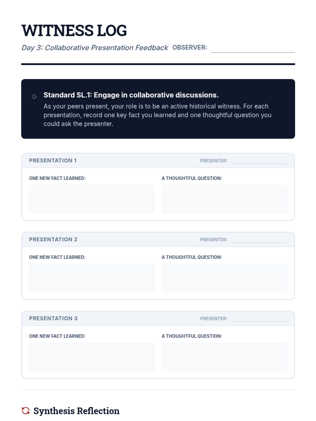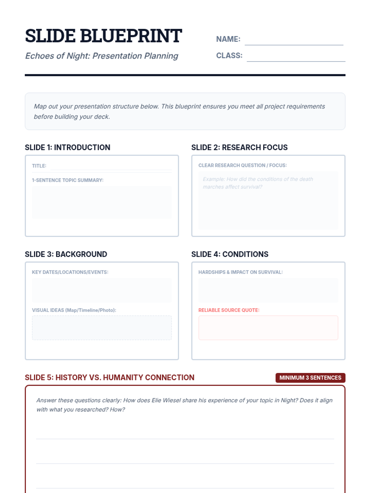 A 3-day research unit focused on the historical context of Night by Elie Wiesel, specifically covering liberation, concentration camps, and death marches, concluding with student presentations.