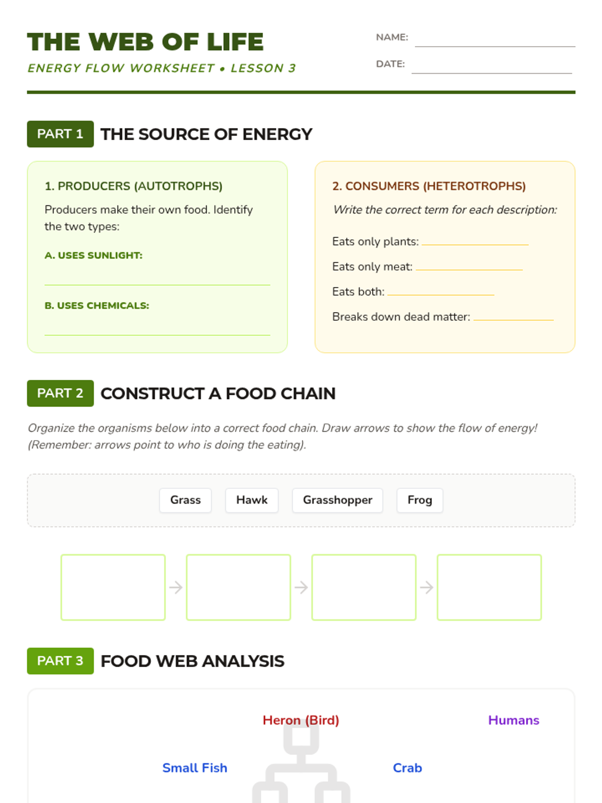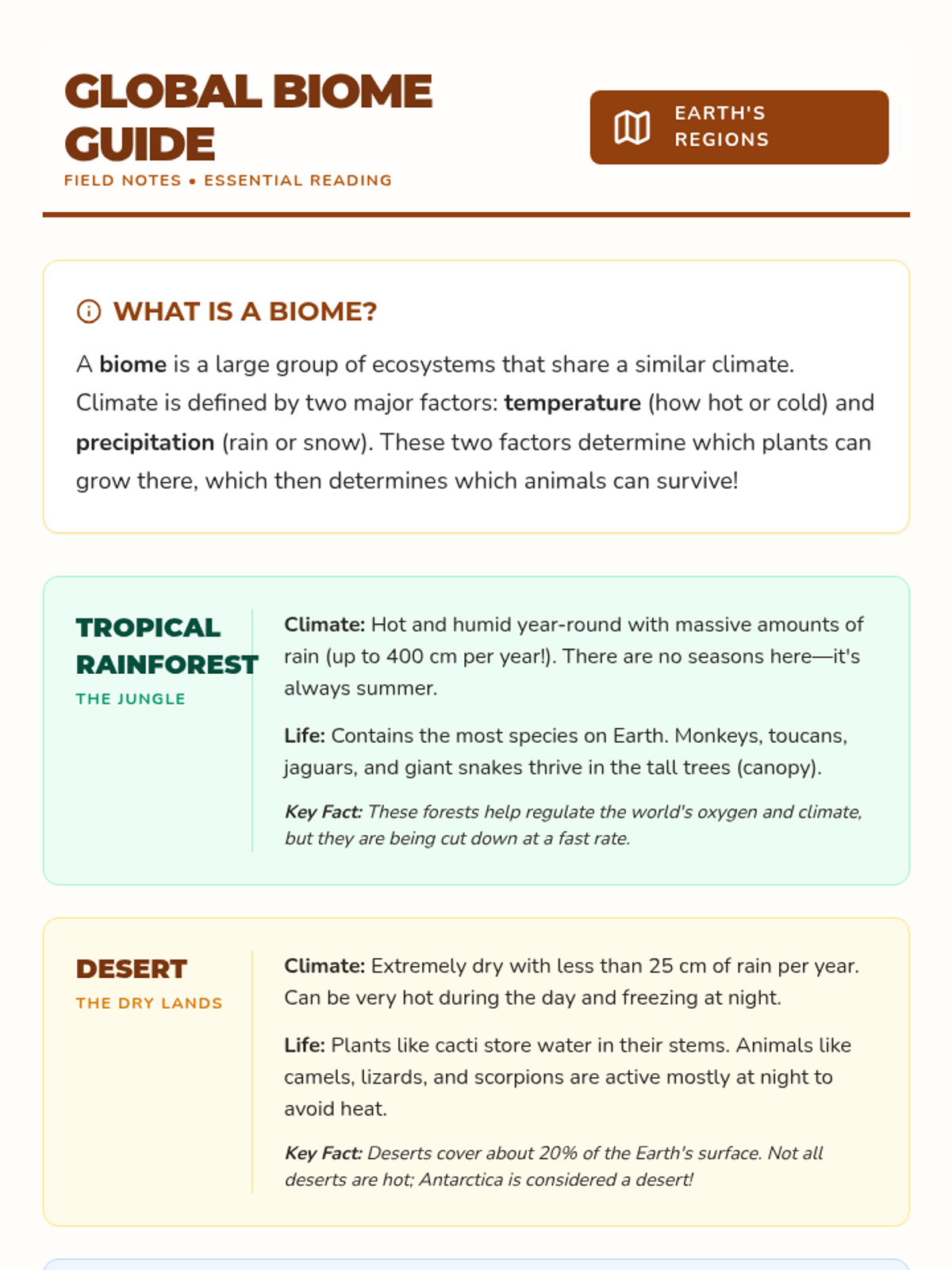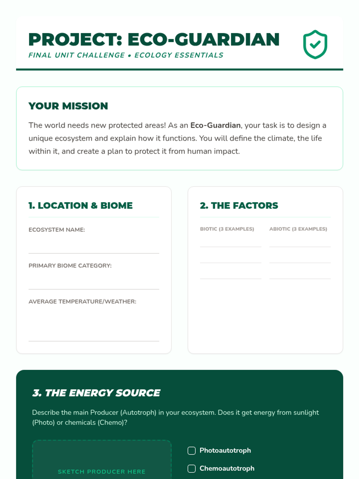 A comprehensive 2-week unit for high school biology students exploring the interconnectedness of life, from microscopic organisms to the global biosphere. Students will investigate biomes, energy flow, and population dynamics through hands-on activities and creative projects.