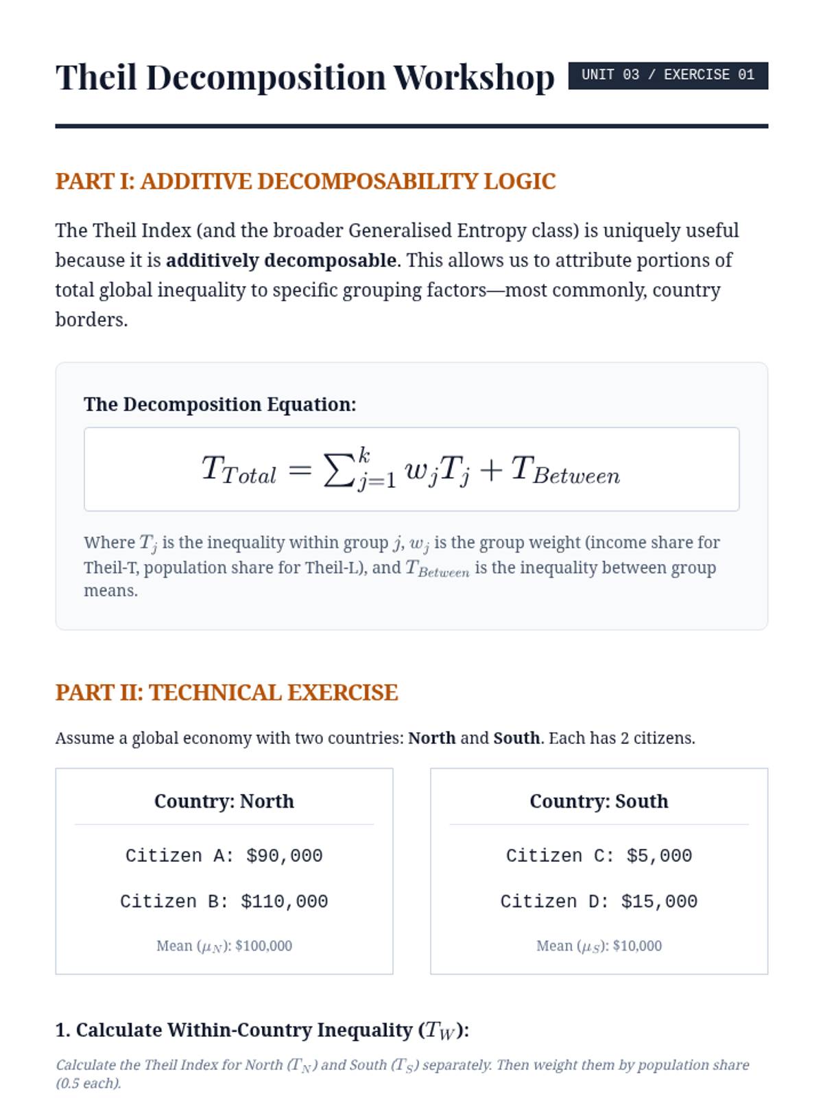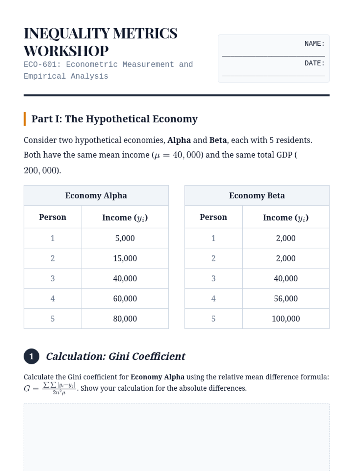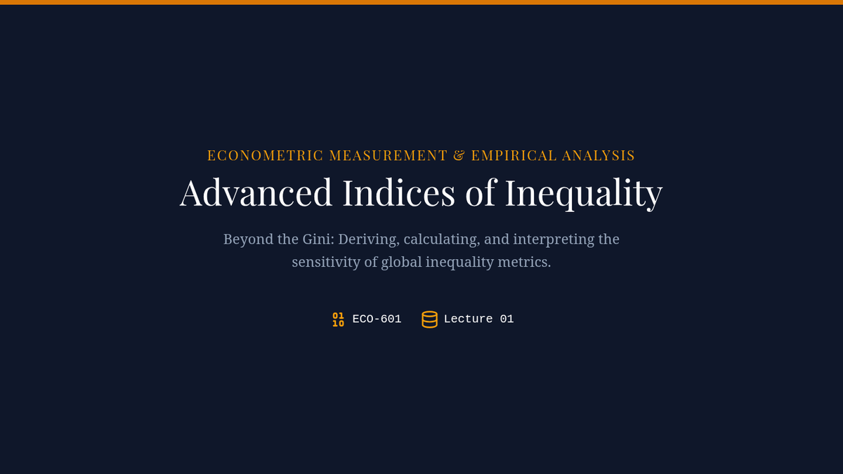 A graduate-level econometrics sequence focused on the rigorous measurement of global inequality. Students master advanced indices, decompose inequality components, evaluate PPP methodologies, and model economic convergence trends.