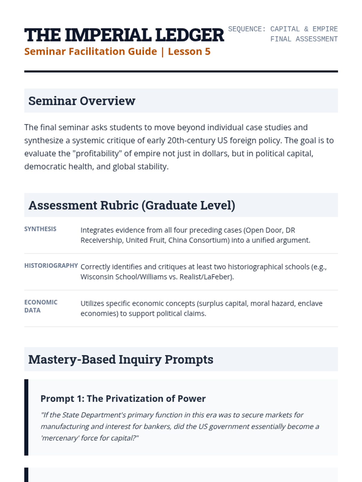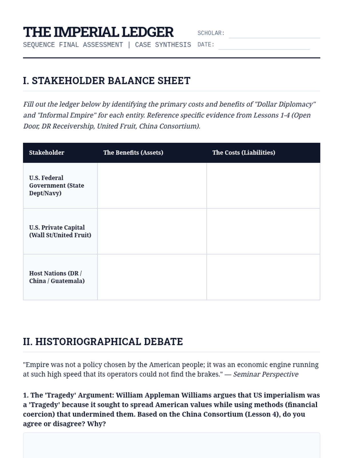 This graduate-level sequence investigates the economic motivations behind early 20th-century US foreign policy. It examines the shift from territorial conquest to 'Dollar Diplomacy,' focusing on the entanglement of state power with private corporate interests in the Caribbean, Central America, and East Asia.