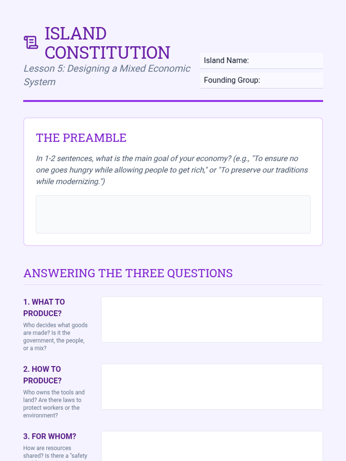 A 5-lesson simulation-based unit where 6th-grade students explore the fundamental economic problem of scarcity and how traditional, command, market, and mixed economies attempt to solve it through an immersive island survival scenario.