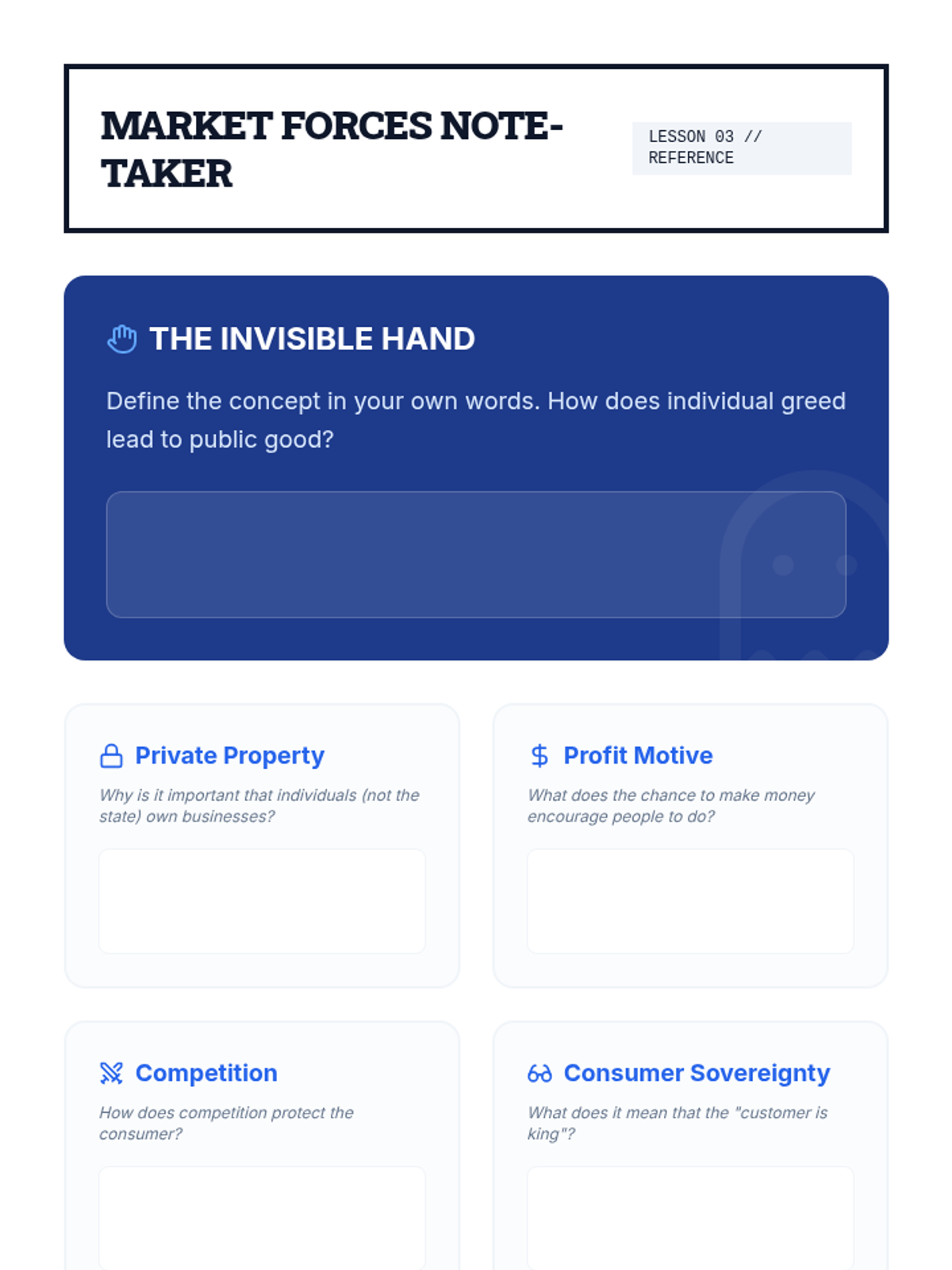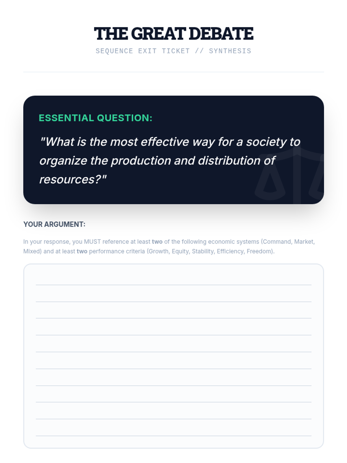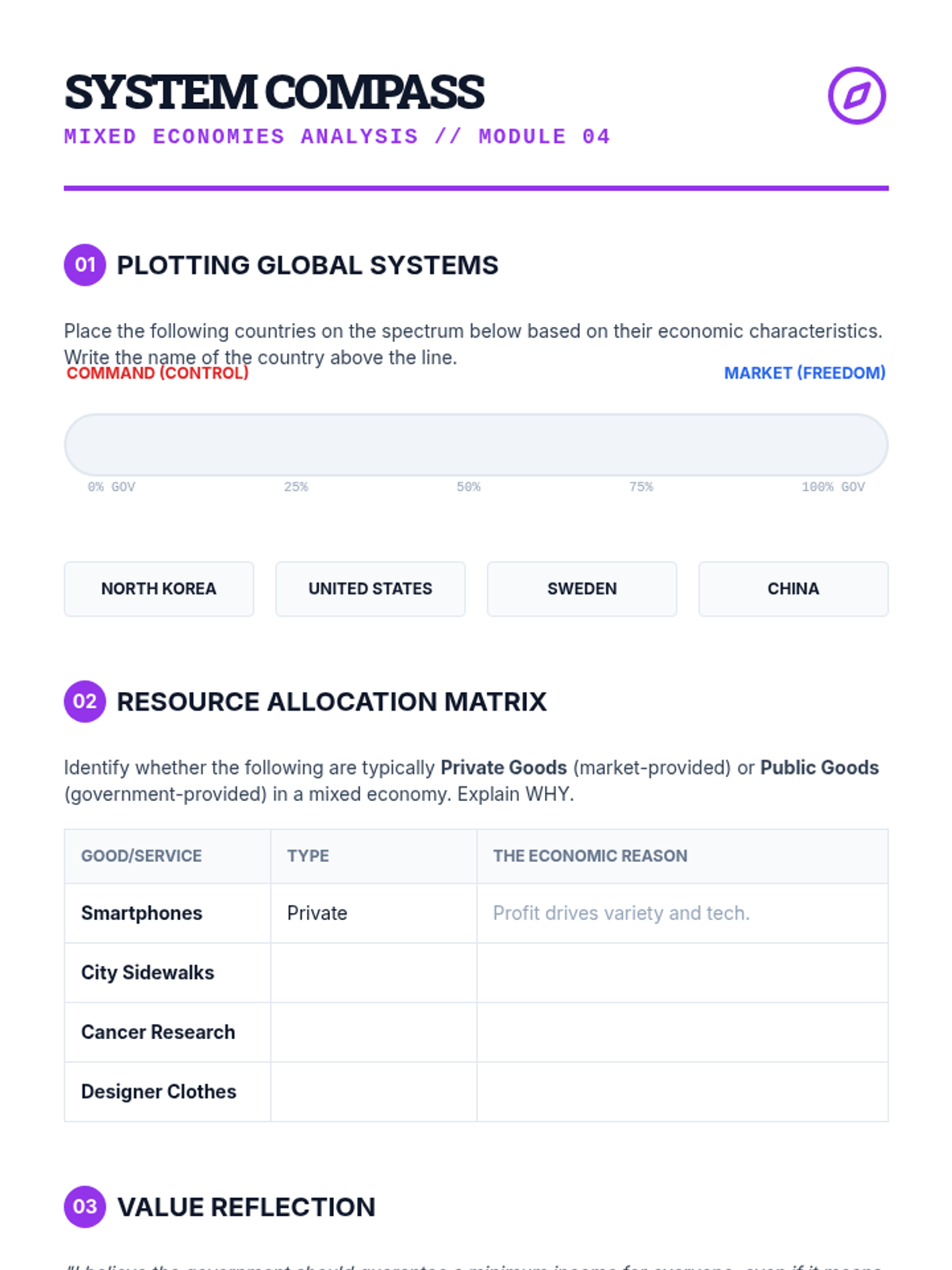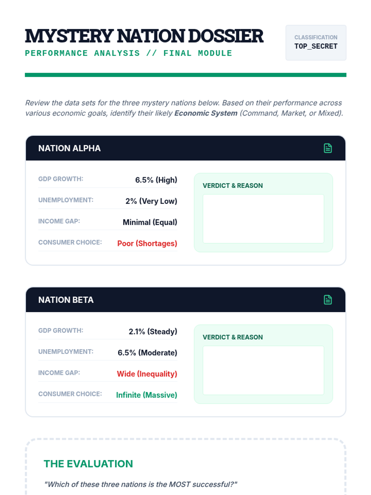 This 9th-grade economics sequence explores how societies organize resource allocation through the lens of the three basic economic questions. Students analyze command, market, and mixed economies, evaluating their efficiency, equity, and stability through real-world case studies and interactive simulations.