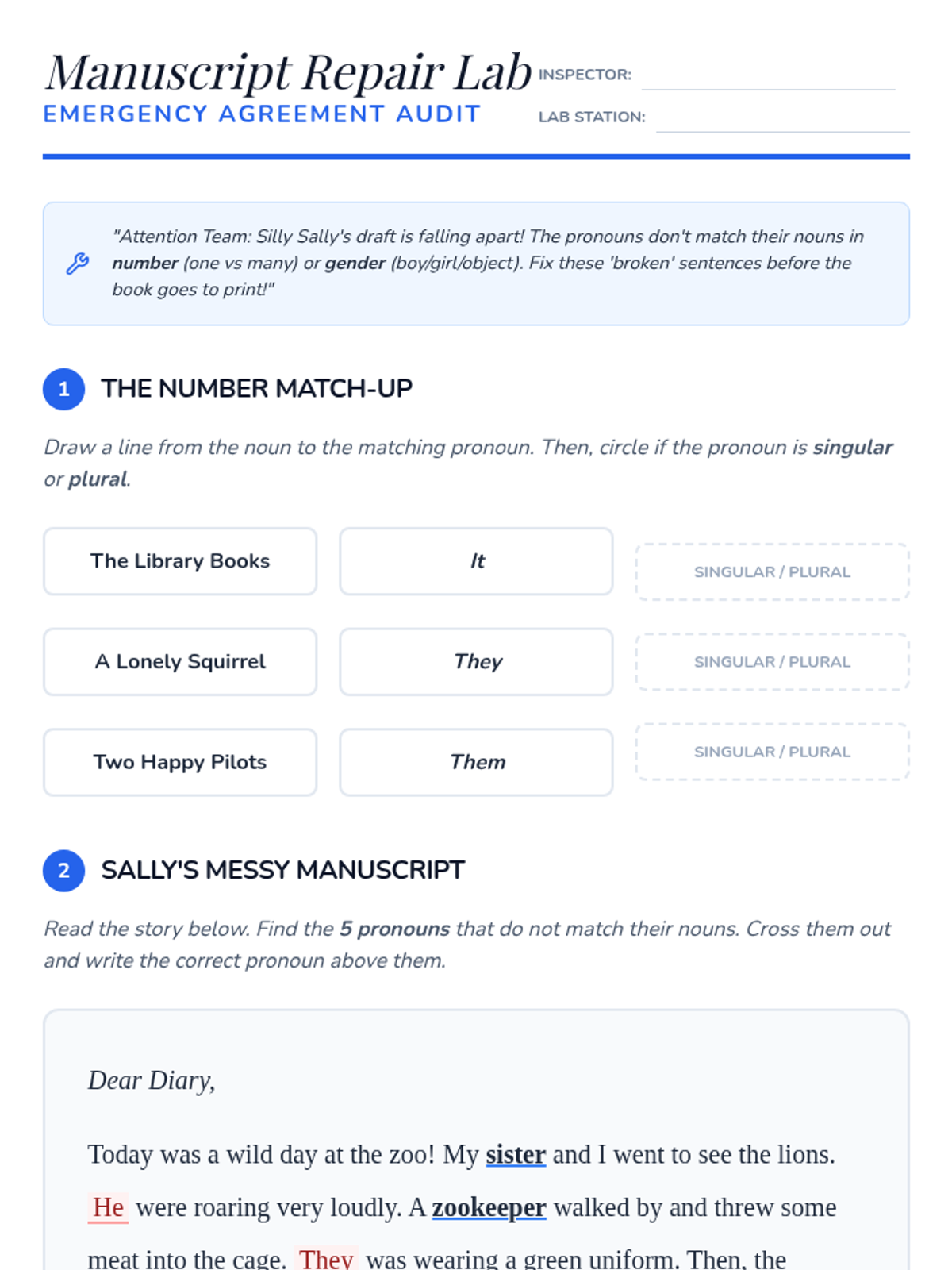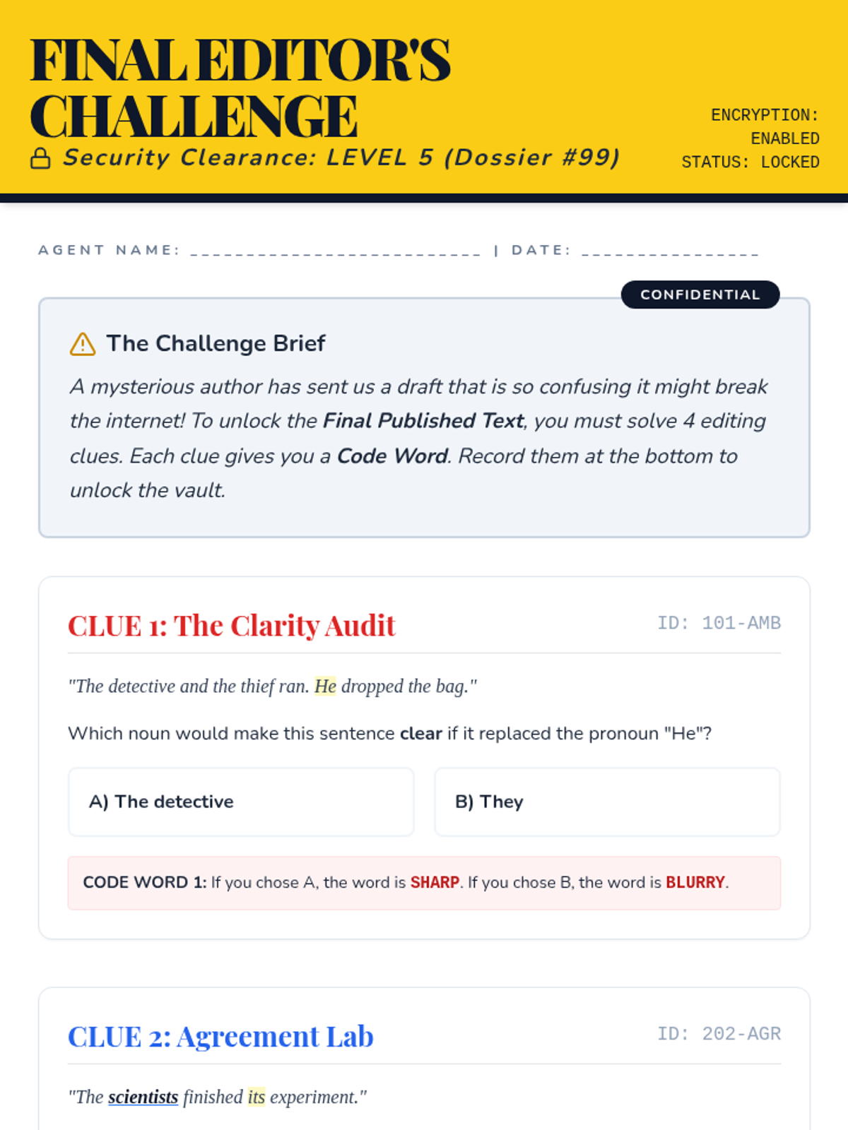 A 3rd-grade grammar sequence where students act as editors to master pronoun usage, focusing on clarity, agreement, possessives, and sentence flow through hands-on editing challenges.