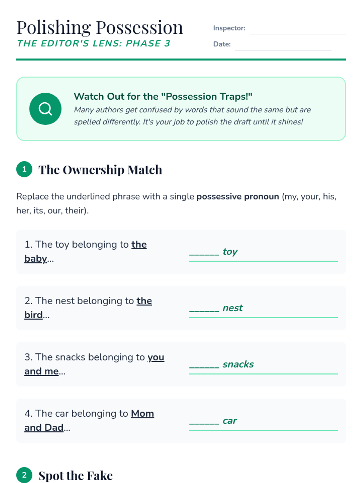 A unit focused on mastering possessive nouns through a detective-themed exploration of 'owner words' and the proper placement of apostrophes.