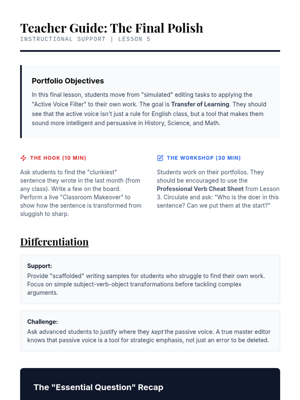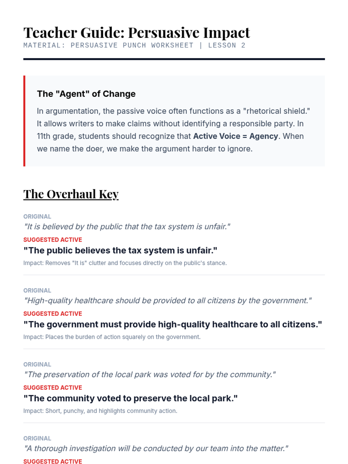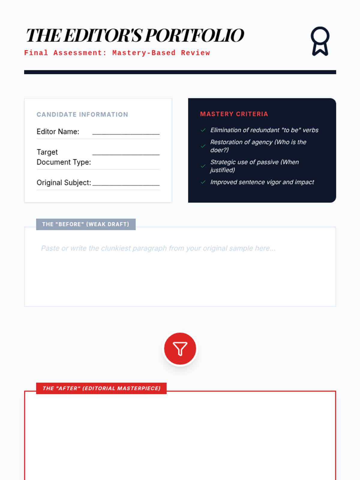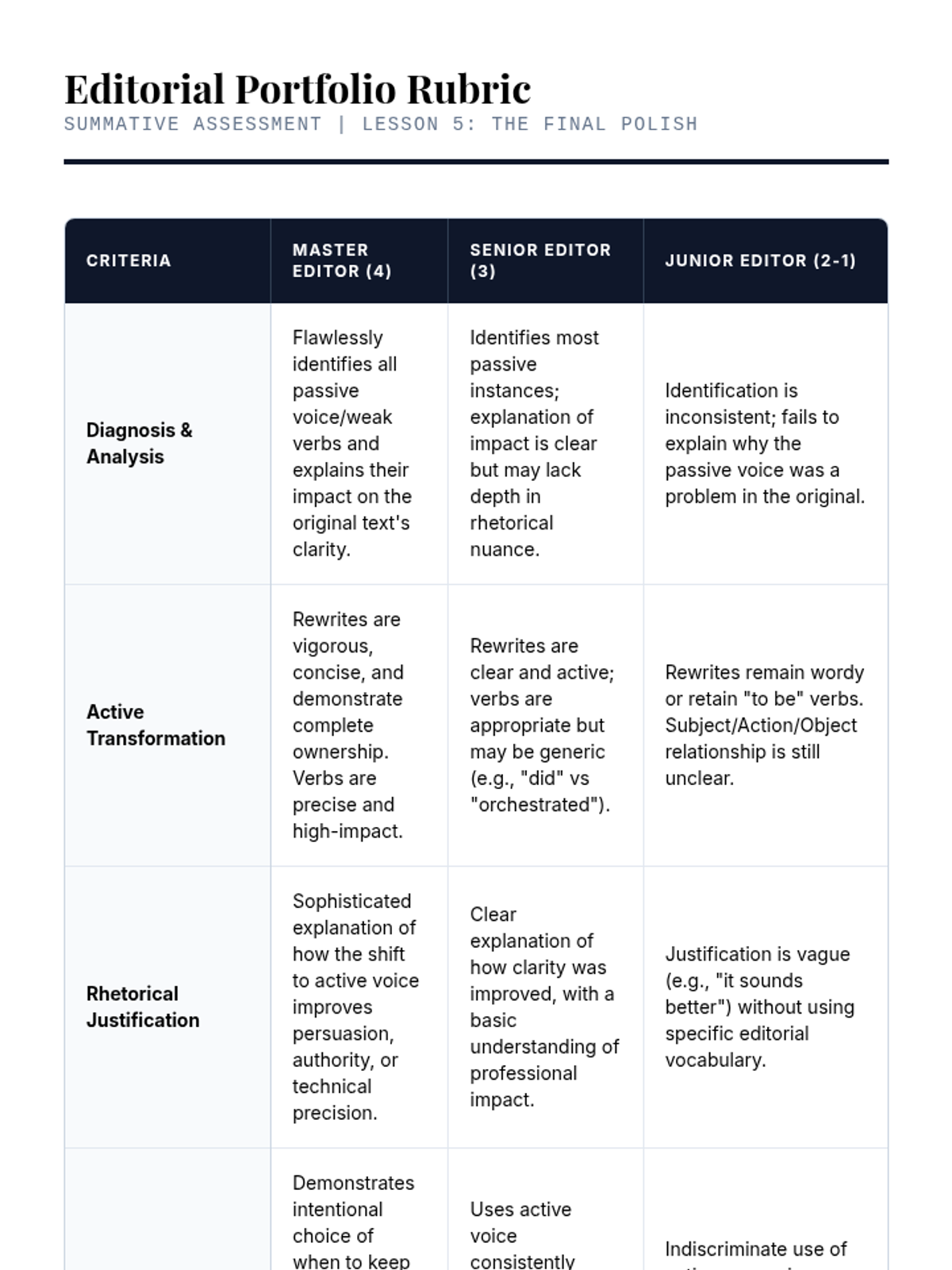 A professional editing simulation where students act as copy editors to master active and passive voice. This sequence focuses on clarity, vigor, and professional impact in non-fiction, resumes, and technical writing.