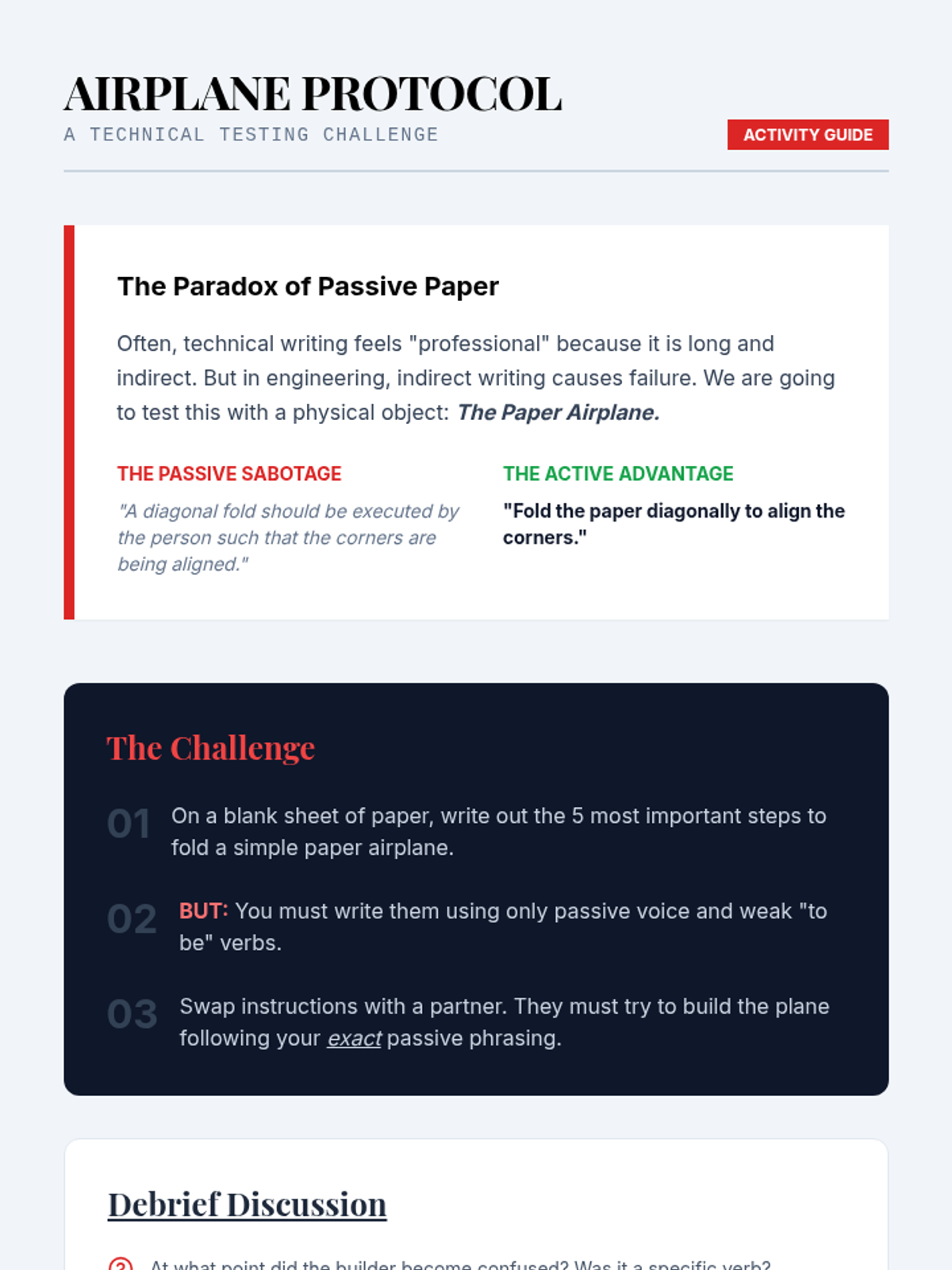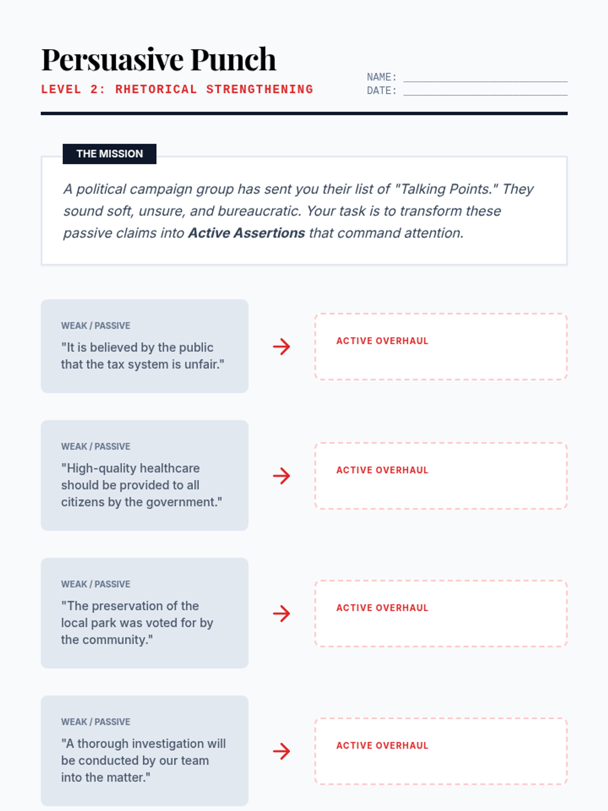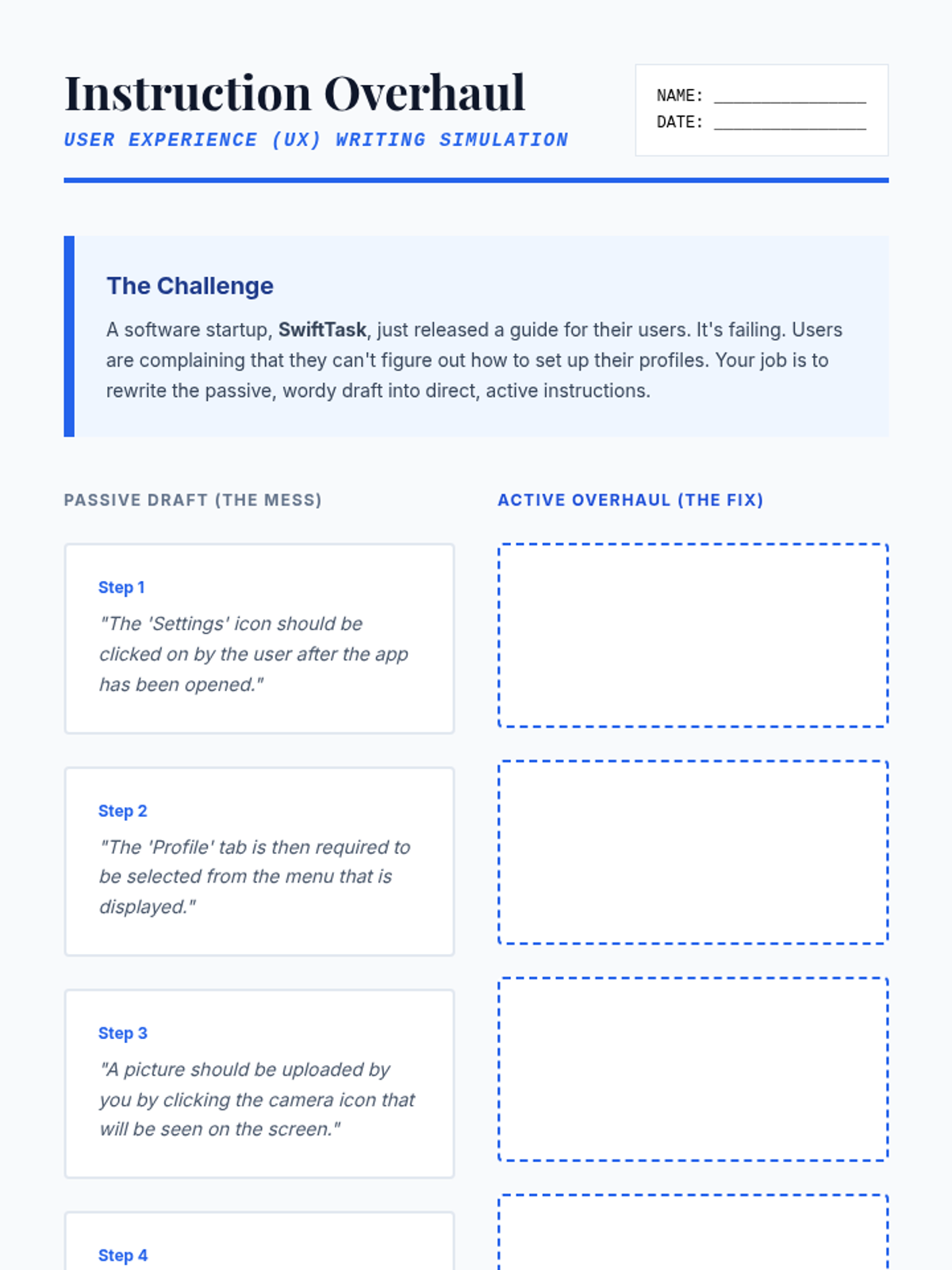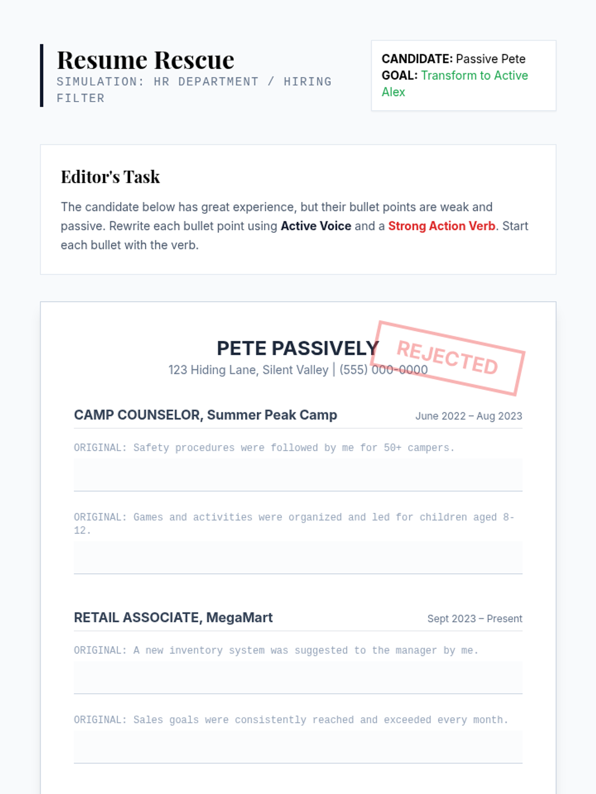 A professional editing simulation where students act as copy editors to master active and passive voice. This sequence focuses on clarity, vigor, and professional impact in non-fiction, resumes, and technical writing.