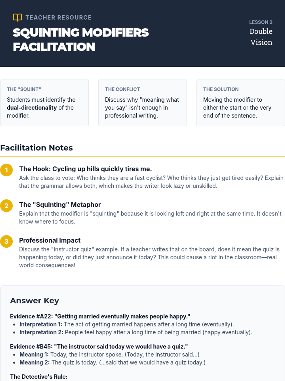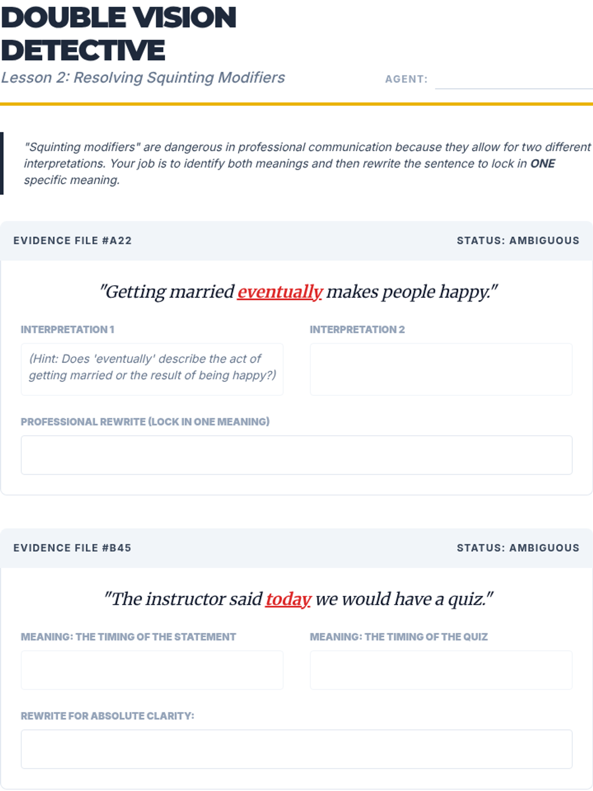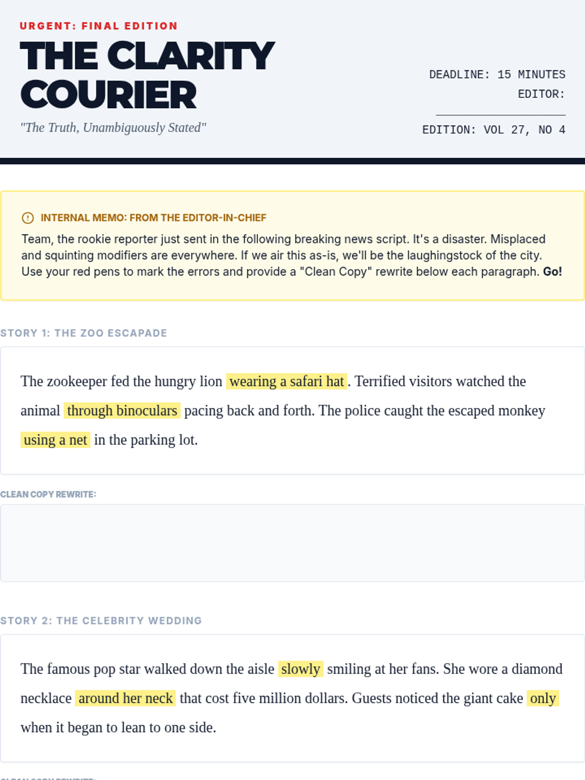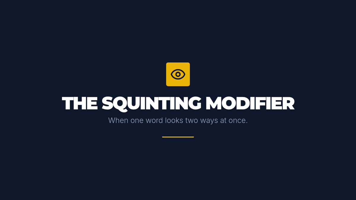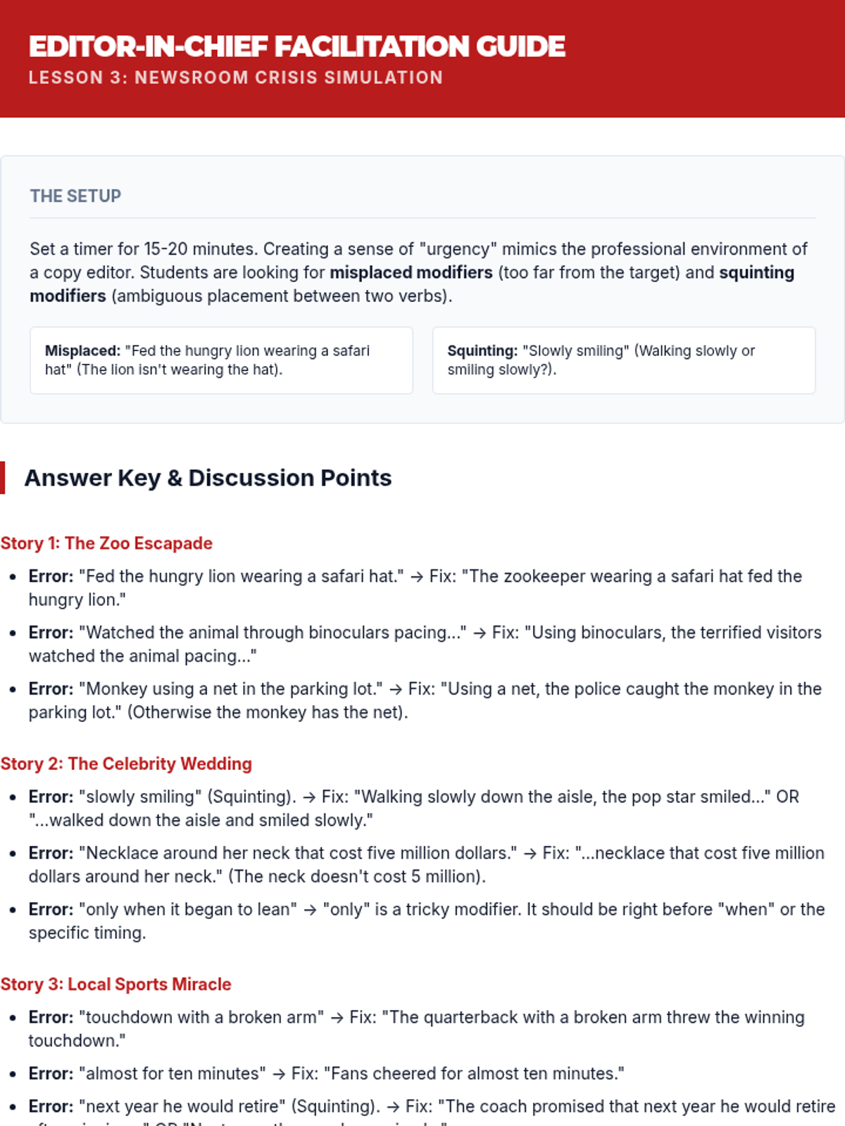 A high-stakes investigative sequence where students act as professional editors to uncover and correct communication failures caused by misplaced and squinting modifiers in news, law, and signage.