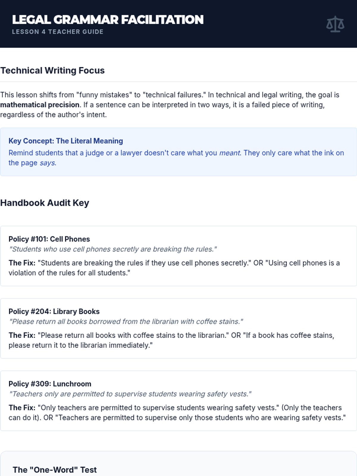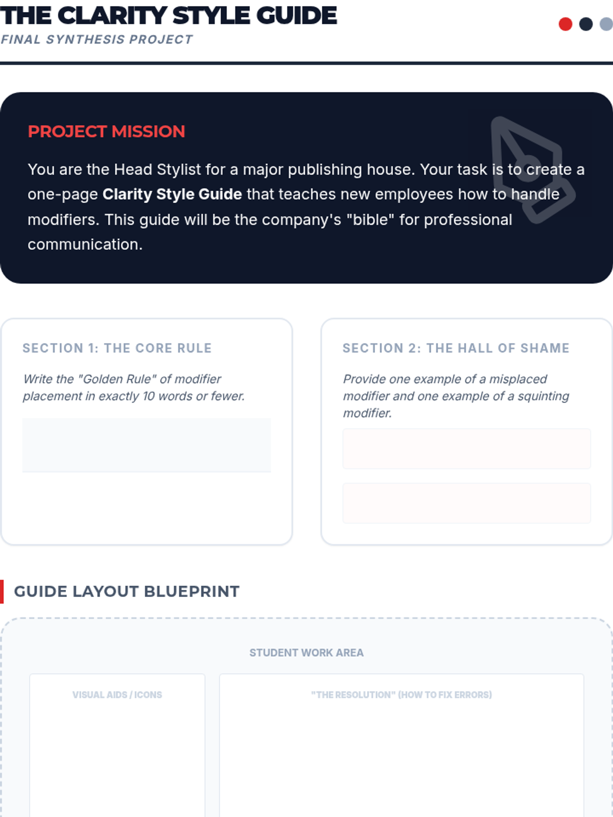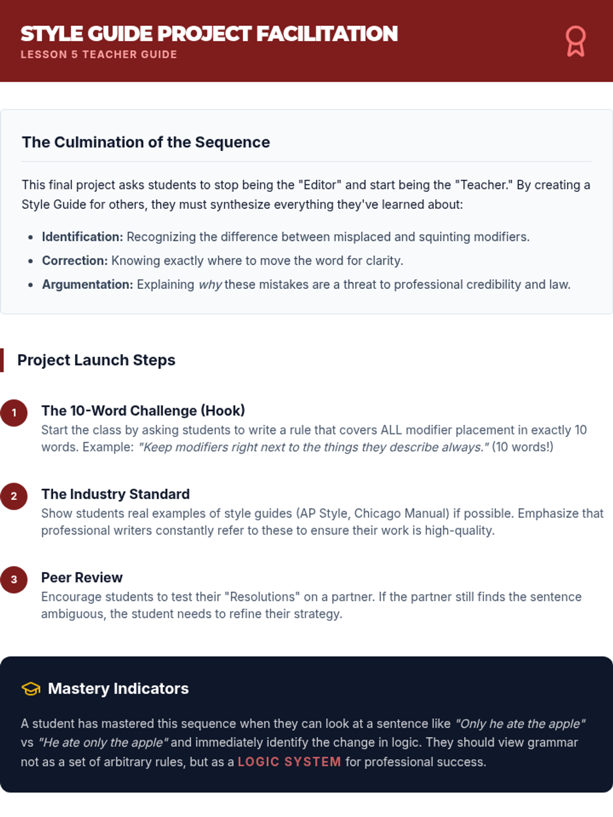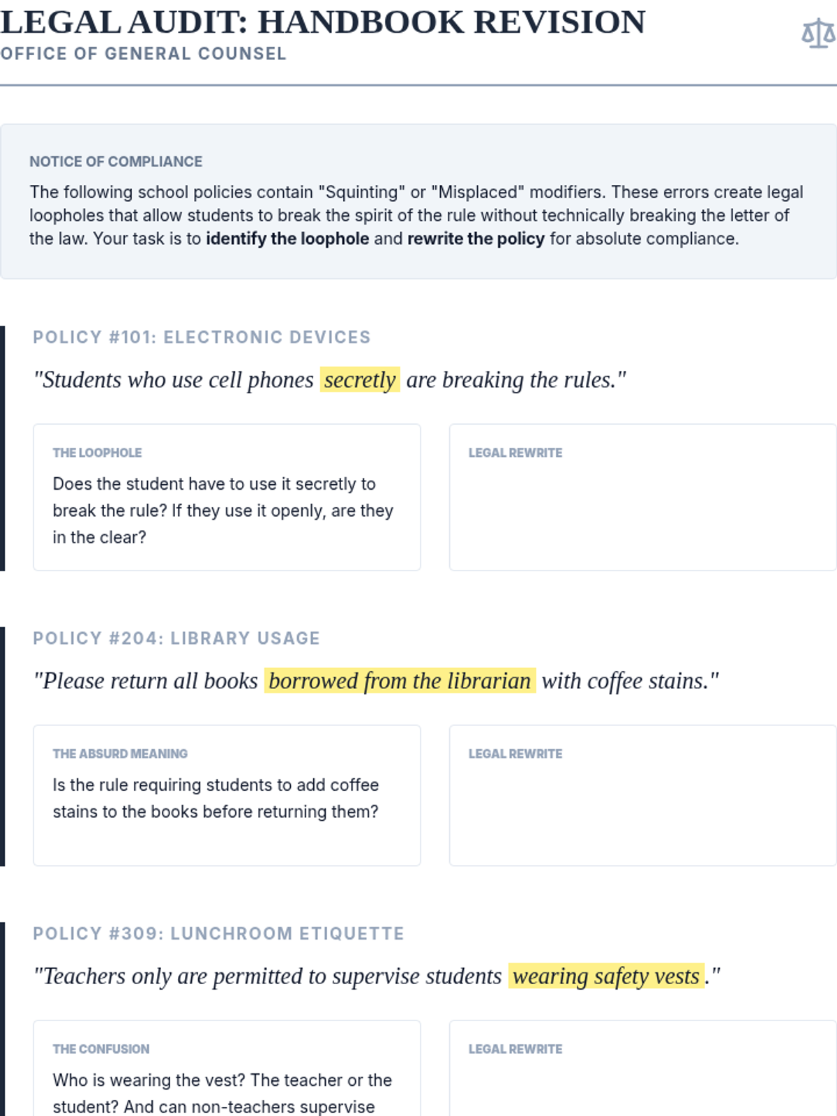 A high-stakes investigative sequence where students act as professional editors to uncover and correct communication failures caused by misplaced and squinting modifiers in news, law, and signage.
