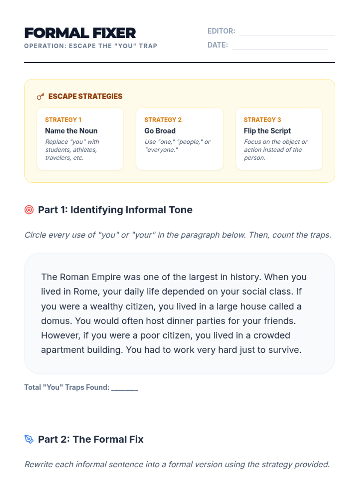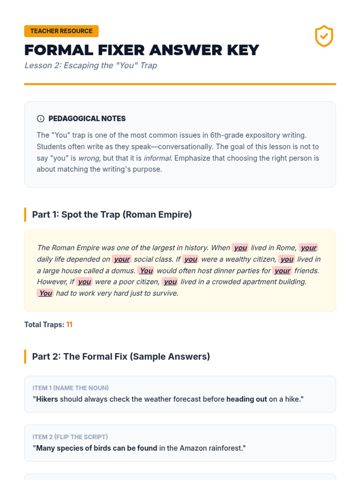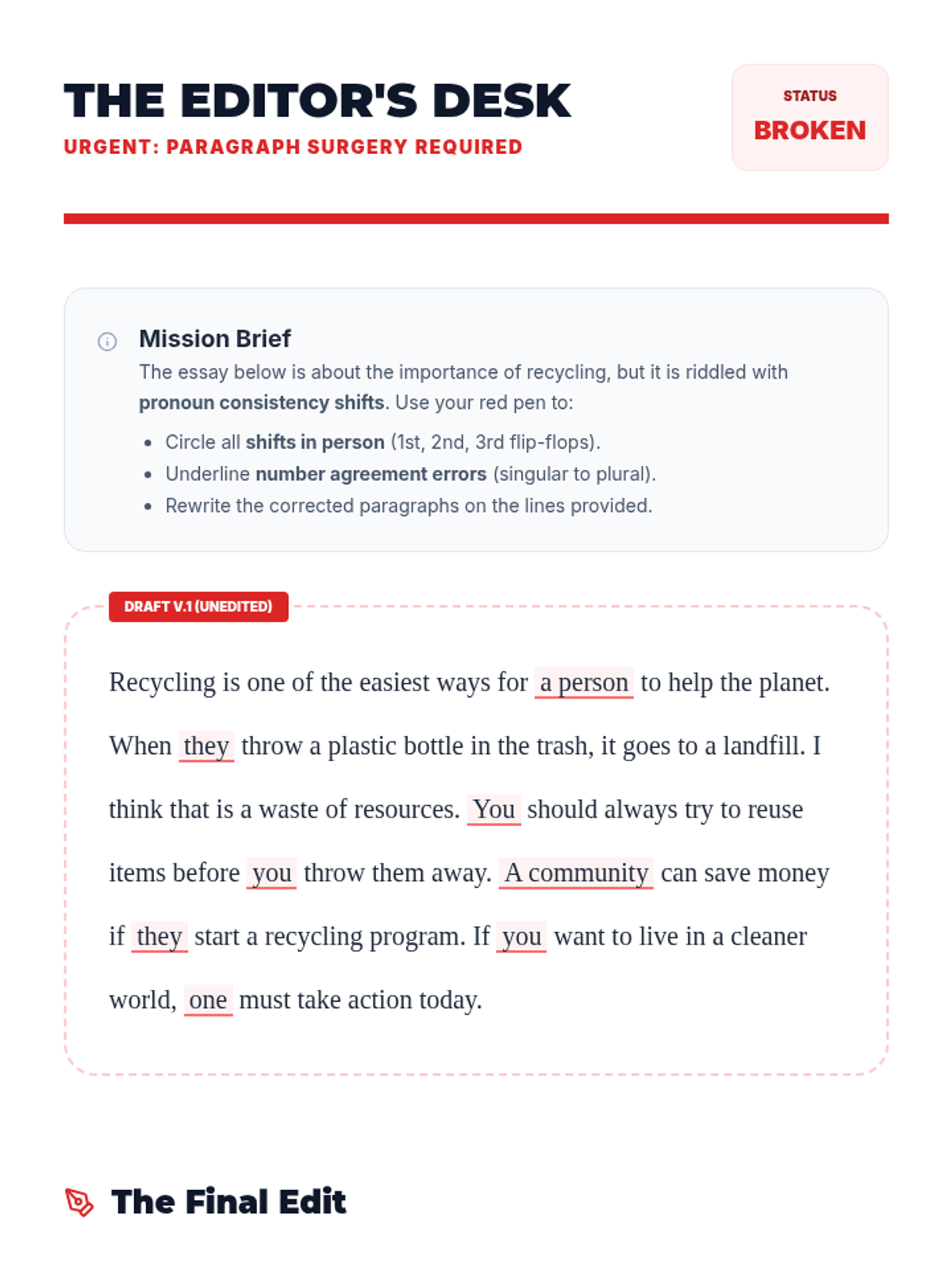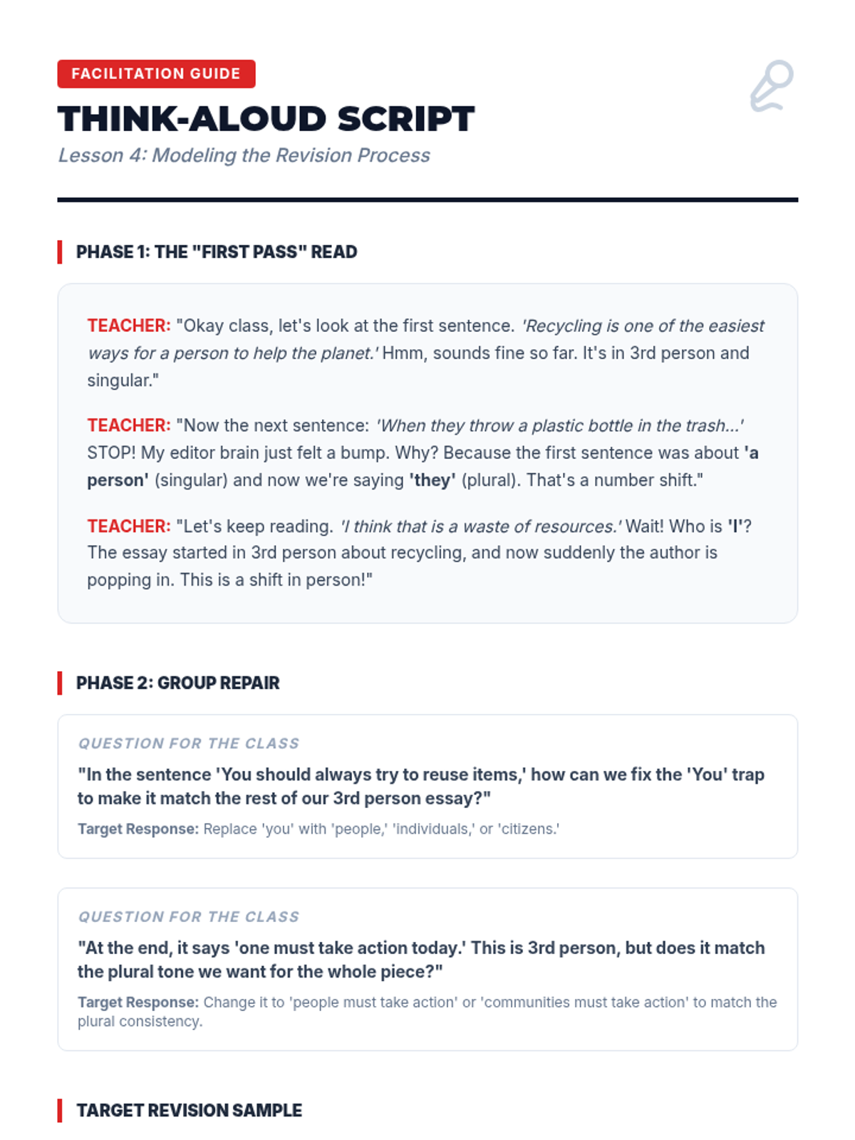 A comprehensive workshop-style sequence for 6th-grade students focusing on pronoun consistency. Students learn to identify and correct shifts in person and number to improve writing clarity and maintain a professional tone.
