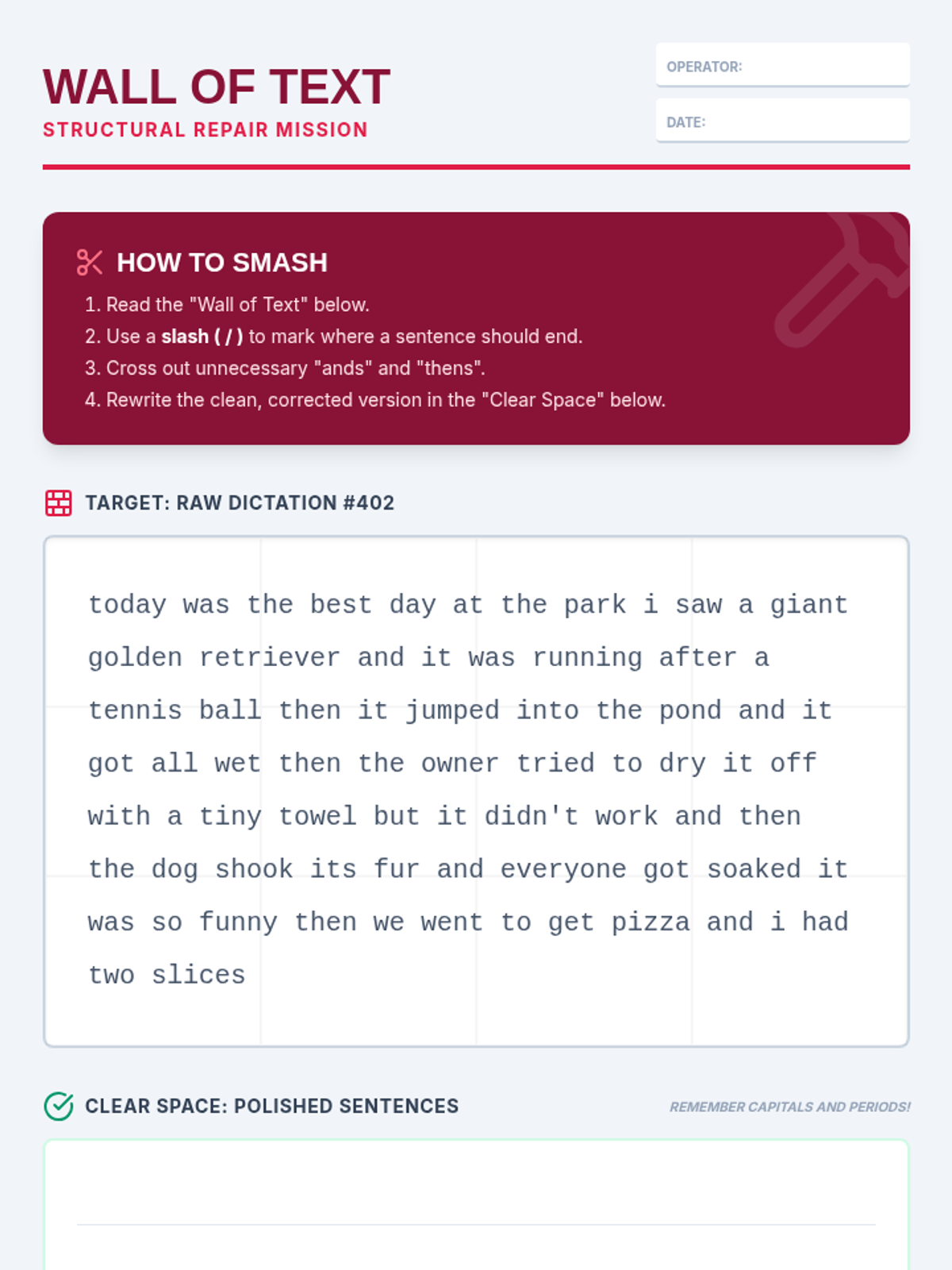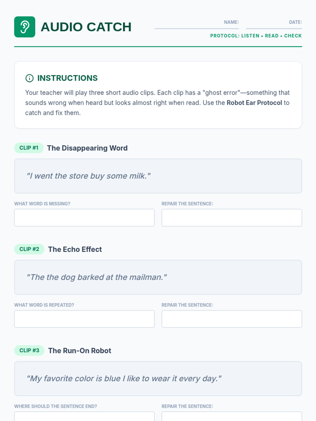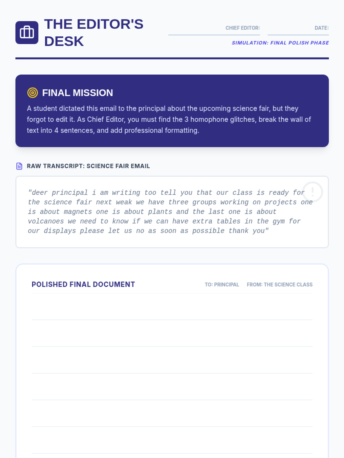 A comprehensive sequence designed for 6th-grade students to master the art of editing and refining text produced by speech recognition software. Students act as 'Digital Detectives' to identify AI glitches, apply systematic editing workflows, and format raw transcripts into professional documents.