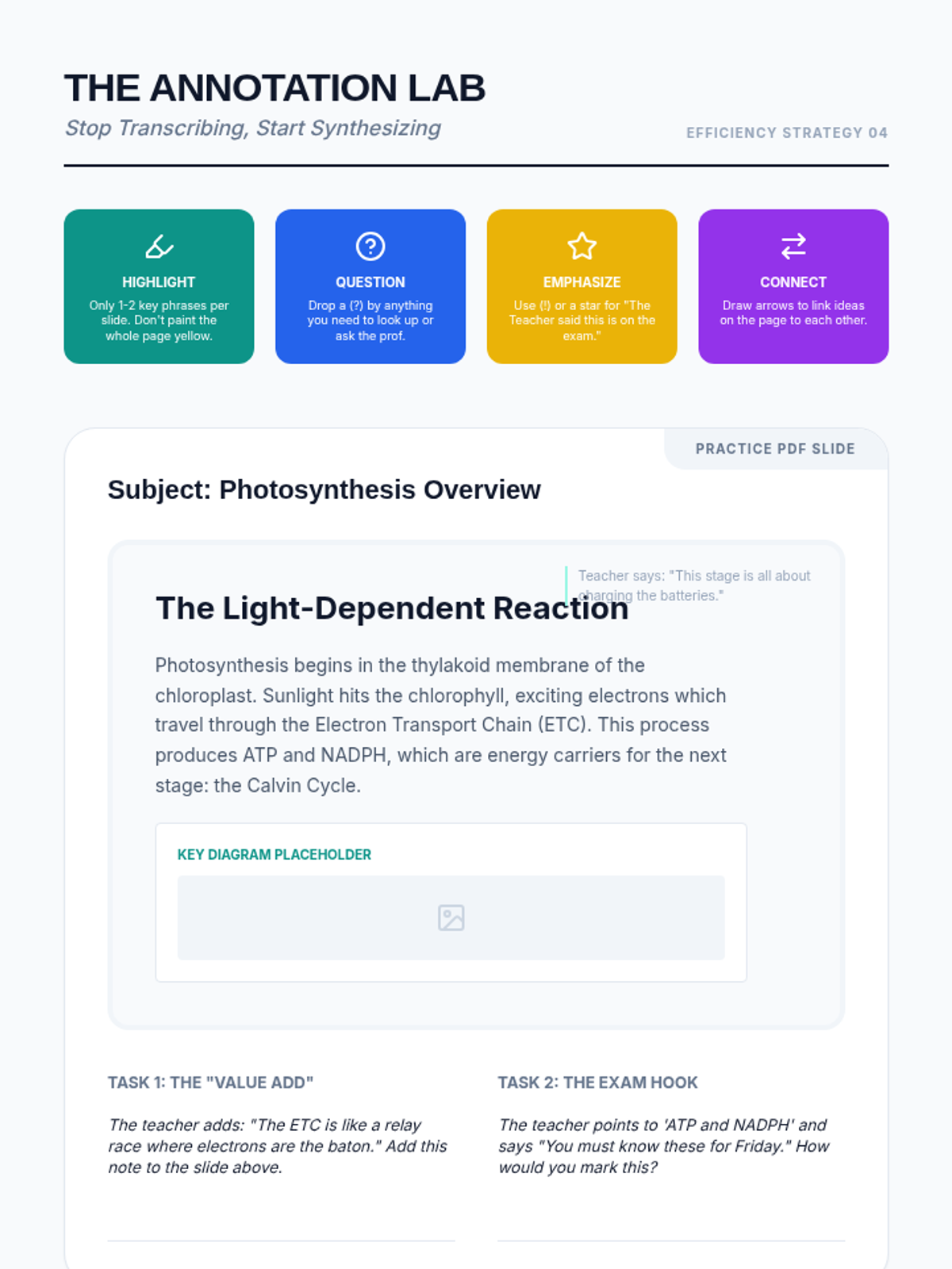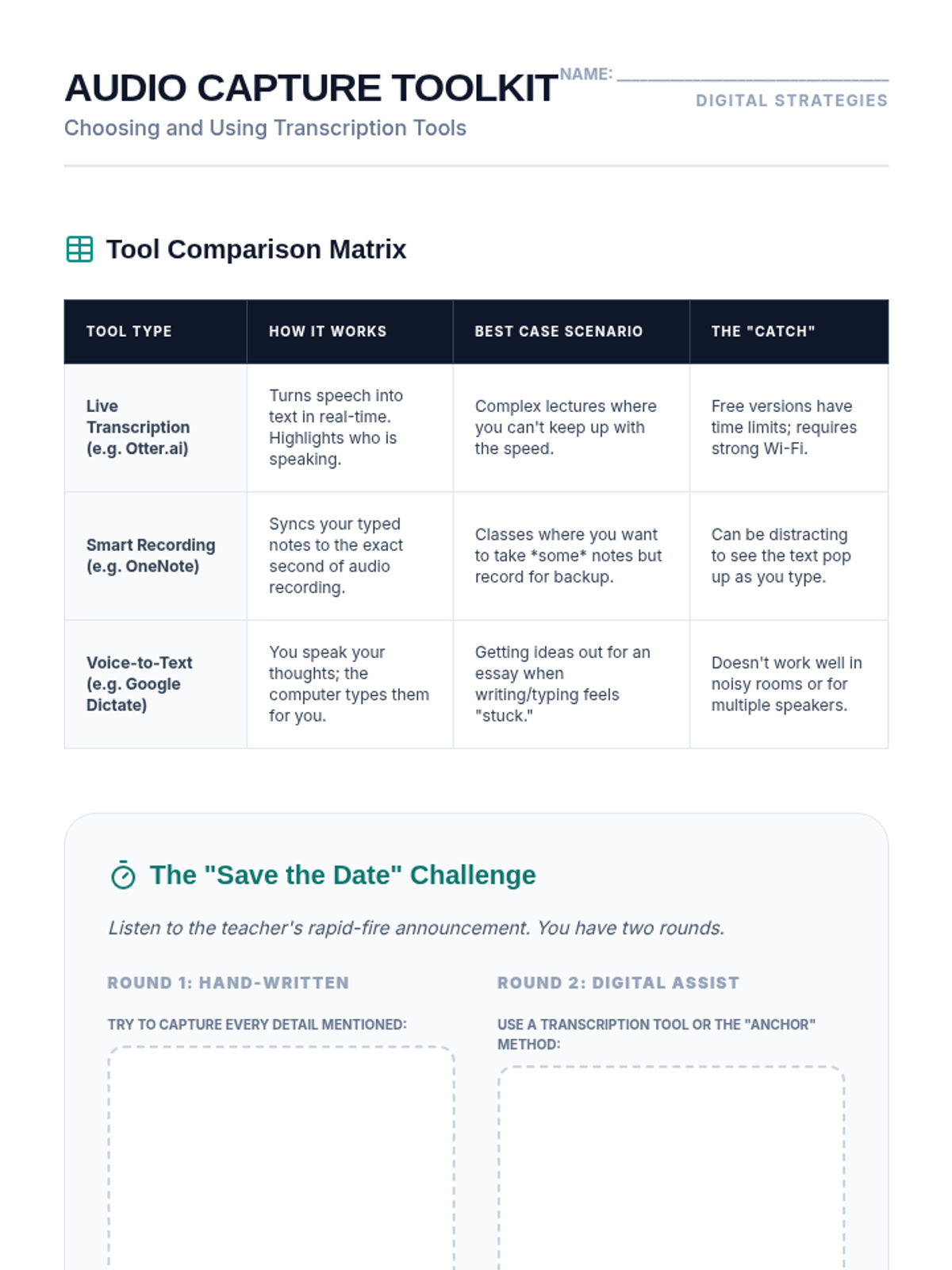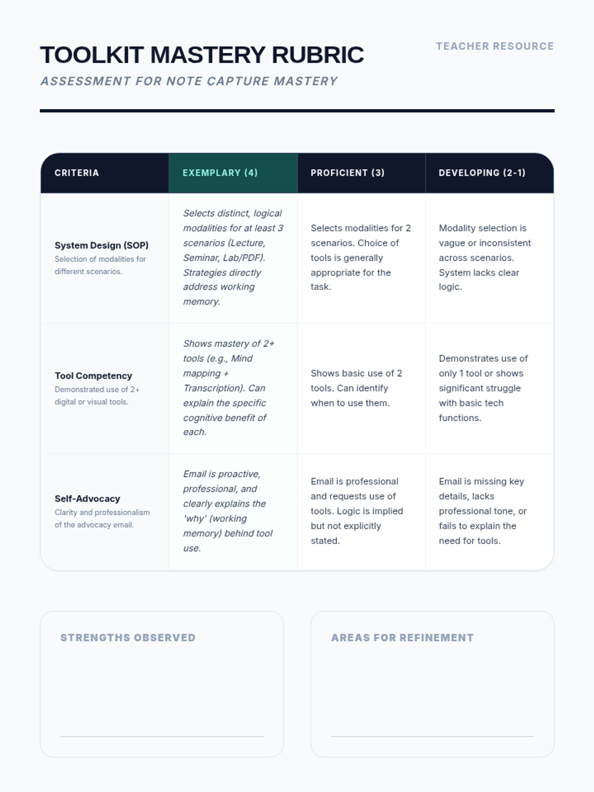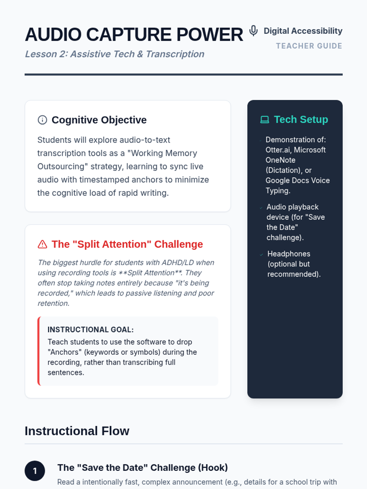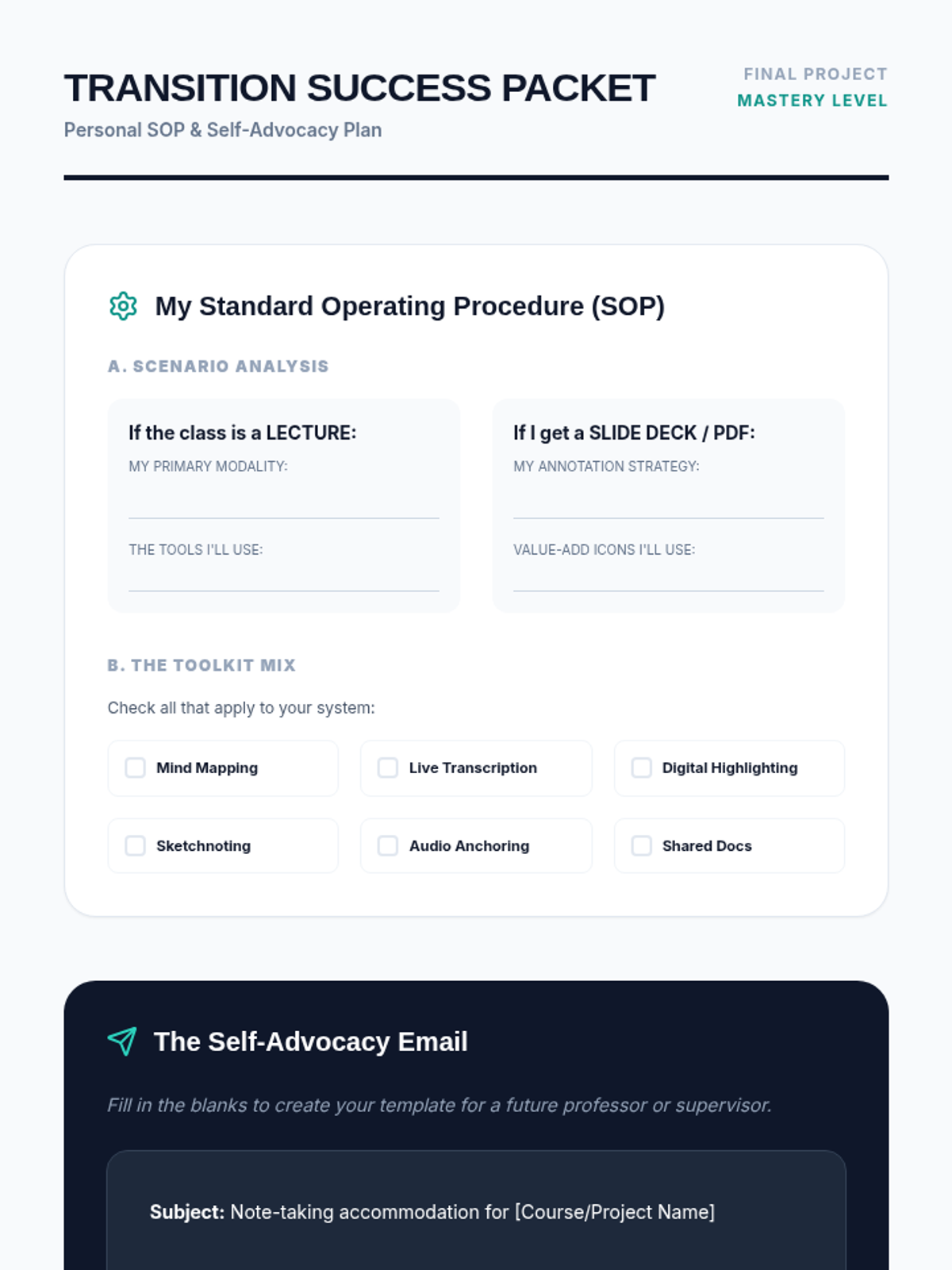 This sequence explores non-linear and technology-assisted strategies for students who struggle with traditional text-based recording, moving from visual mapping to digital tools and personalized systems. Students develop a digital toolkit to mitigate working memory deficits in post-secondary environments.