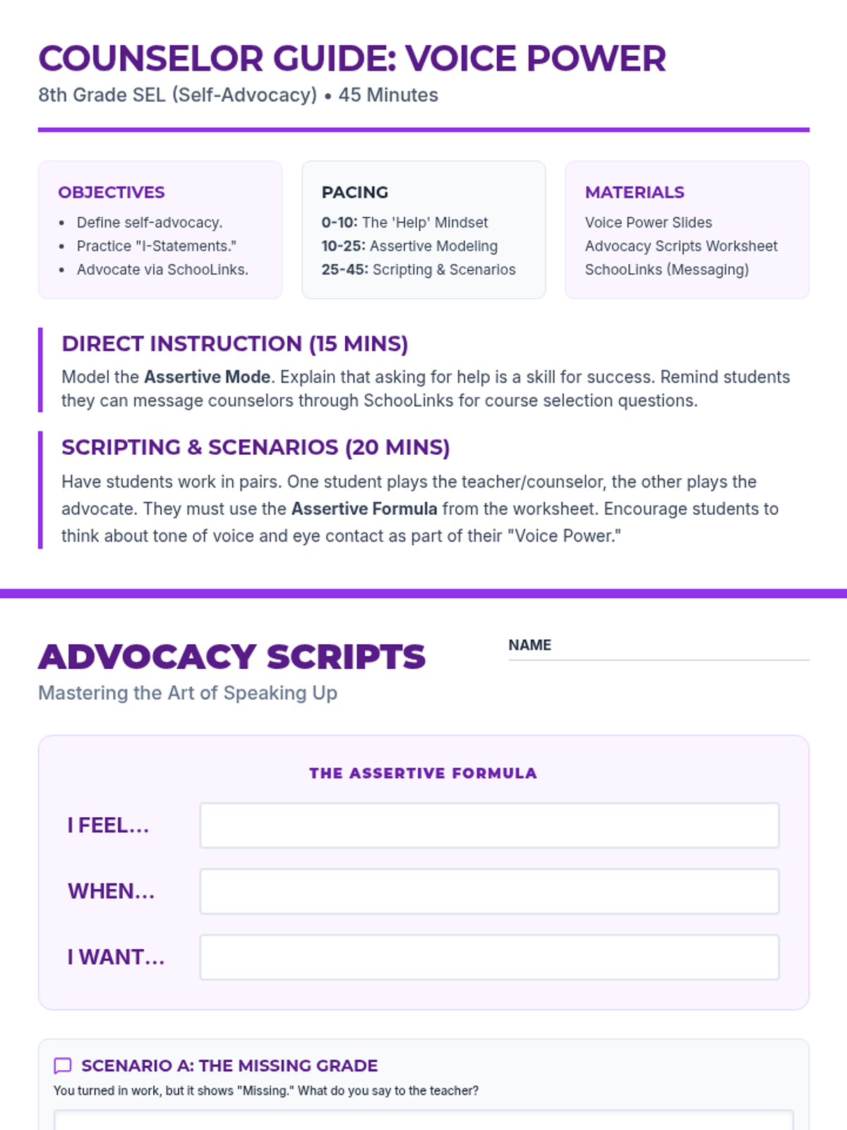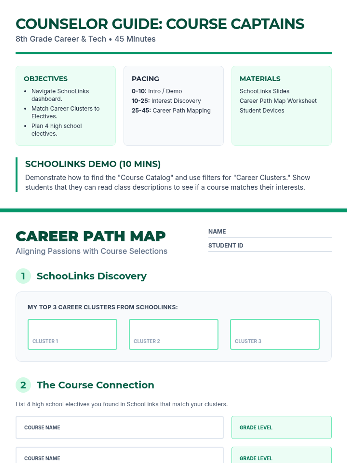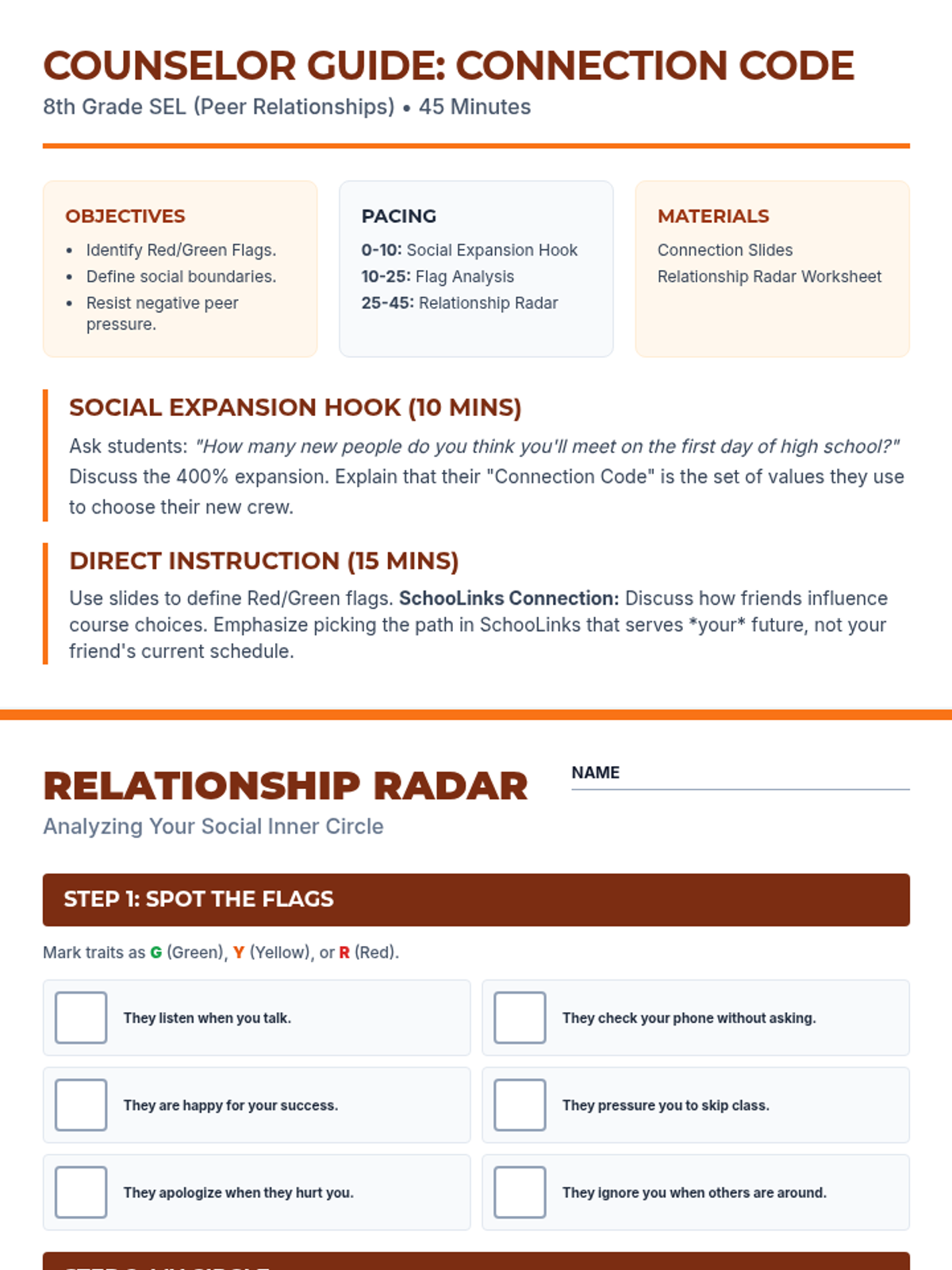 A four-part series for 8th graders to navigate the transition to high school, covering academic planning, career exploration via SchooLinks, and vital social-emotional skills like self-advocacy and peer relationship management.