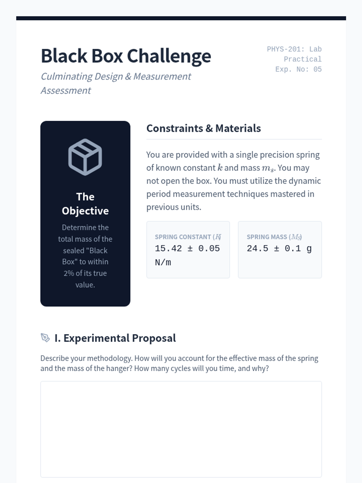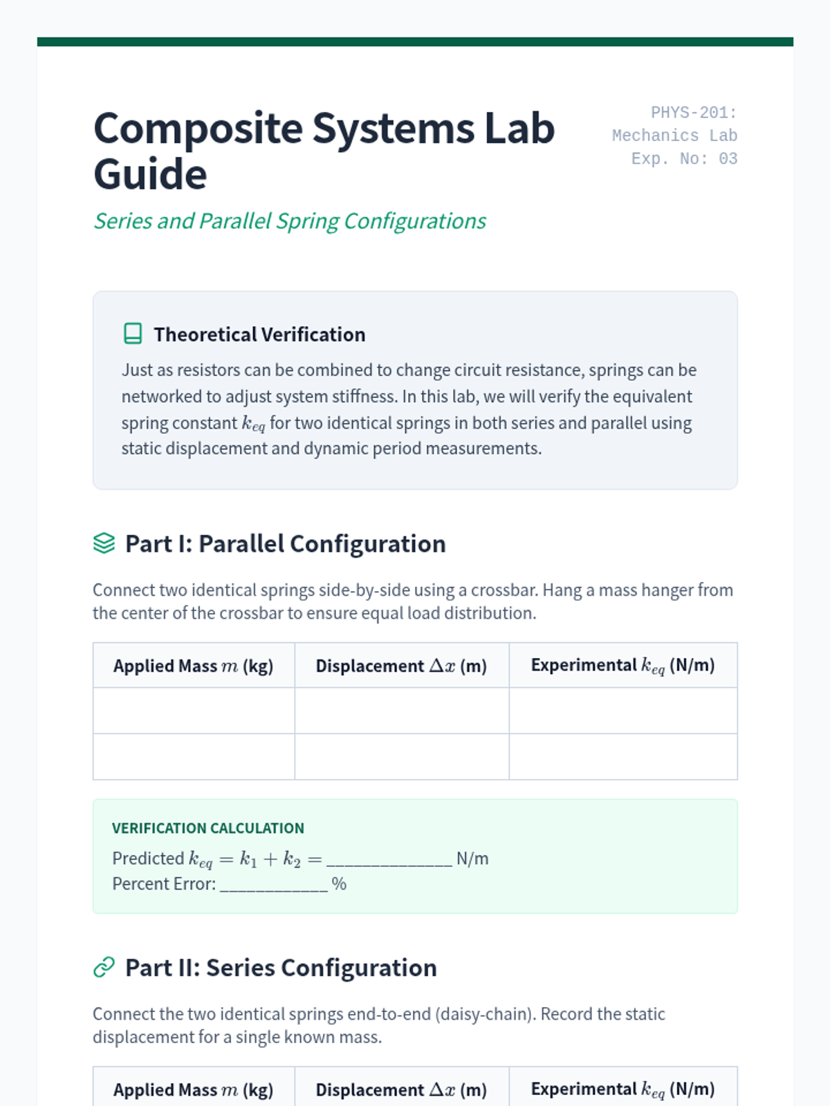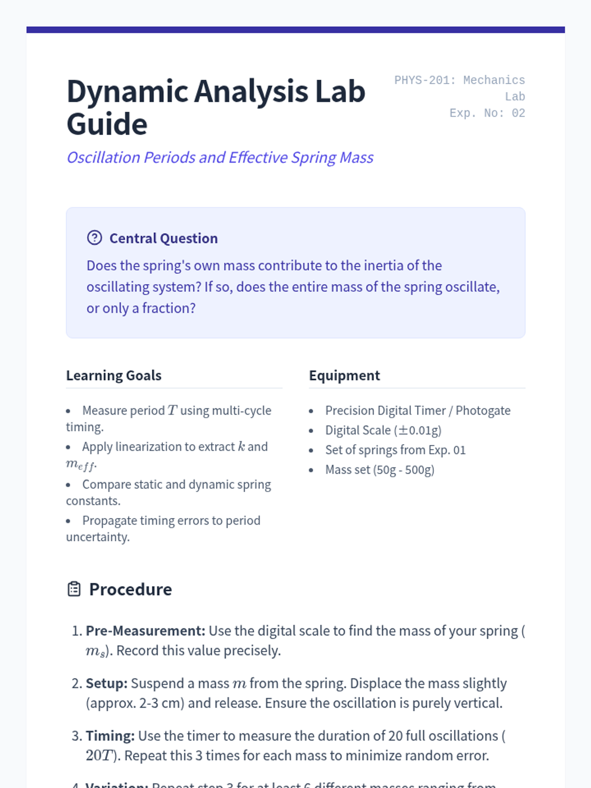 This undergraduate physics sequence explores the experimental verification of Simple Harmonic Motion through the lens of spring-mass systems. Students progress from static Hooke's Law measurements to advanced dynamic analysis, accounting for effective spring mass and complex configurations.