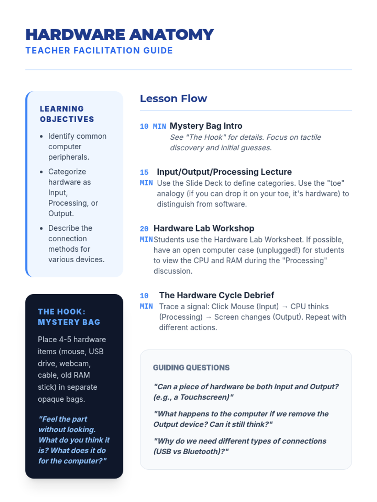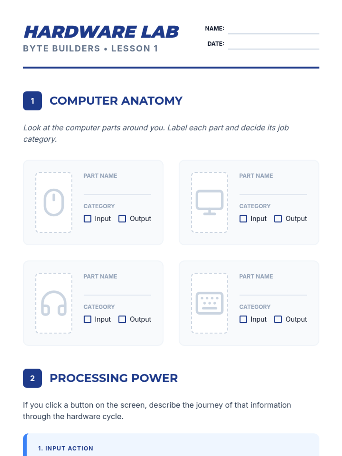 A foundational technology sequence for 4th graders that explores hardware components, processing, operating systems, and file management. Students transition from passive users to digital managers by mastering hardware identification, system navigation, and organizational skills.