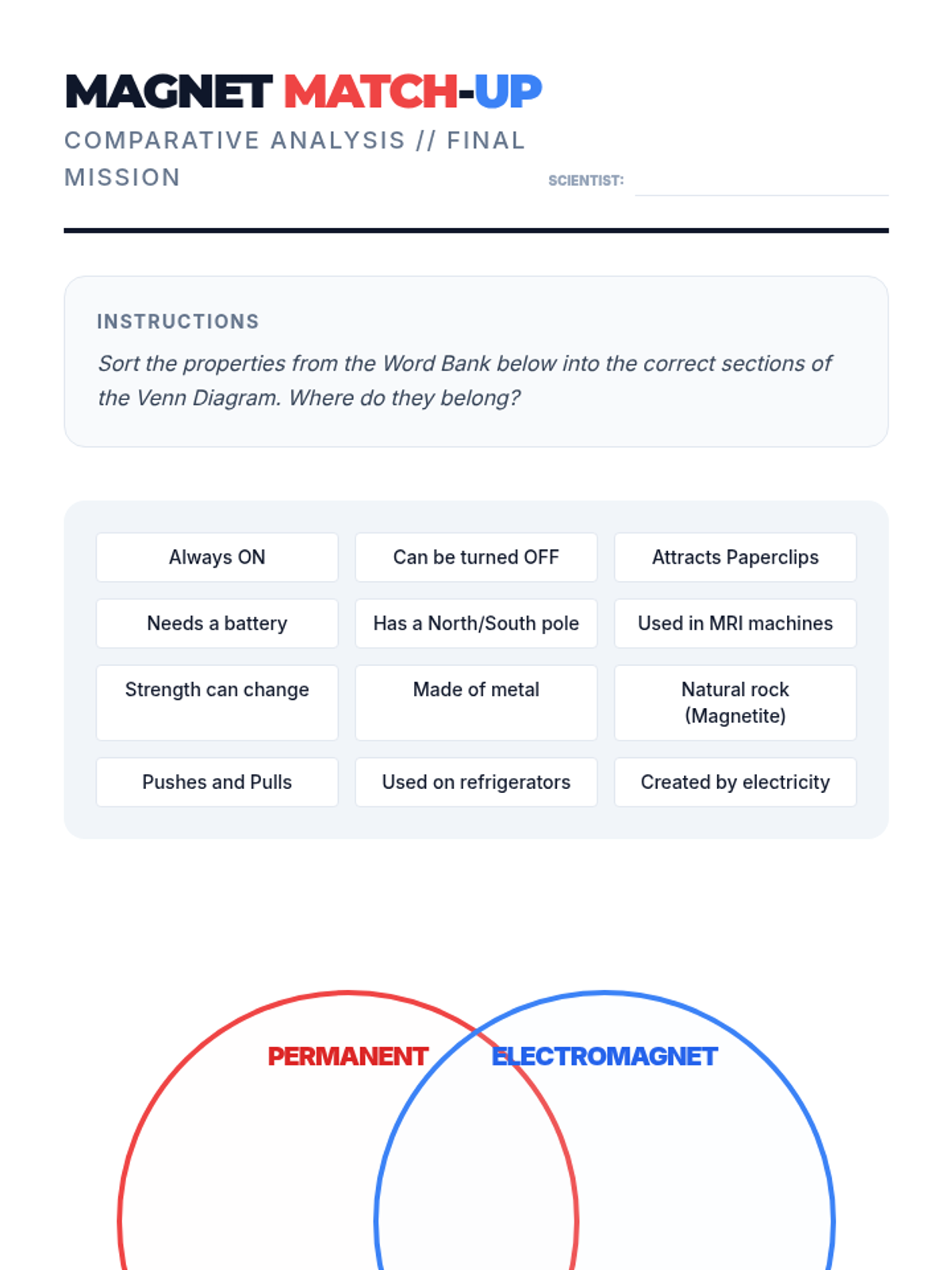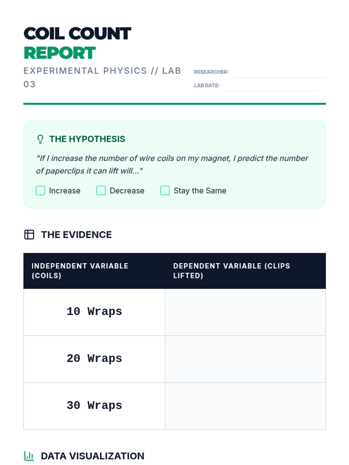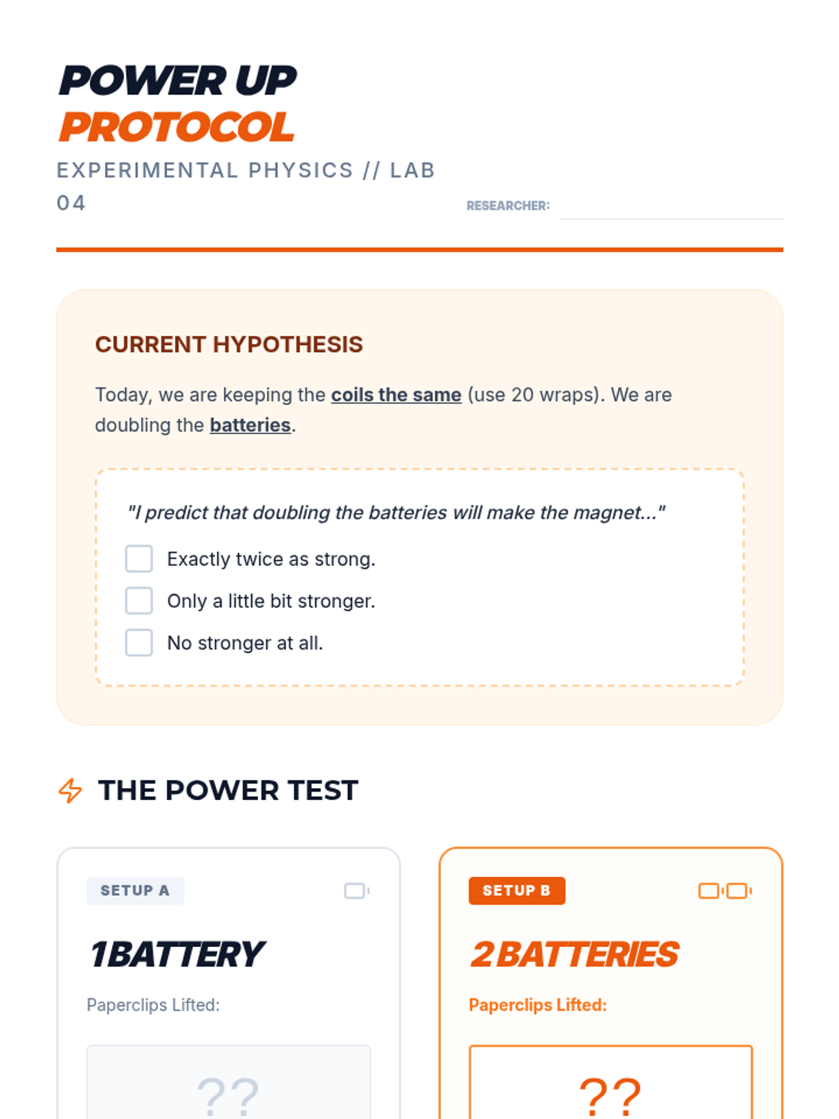 A hands-on physics sequence for 4th graders exploring the link between electricity and magnetism. Students build, test, and manipulate electromagnets to understand how variables affect magnetic strength.