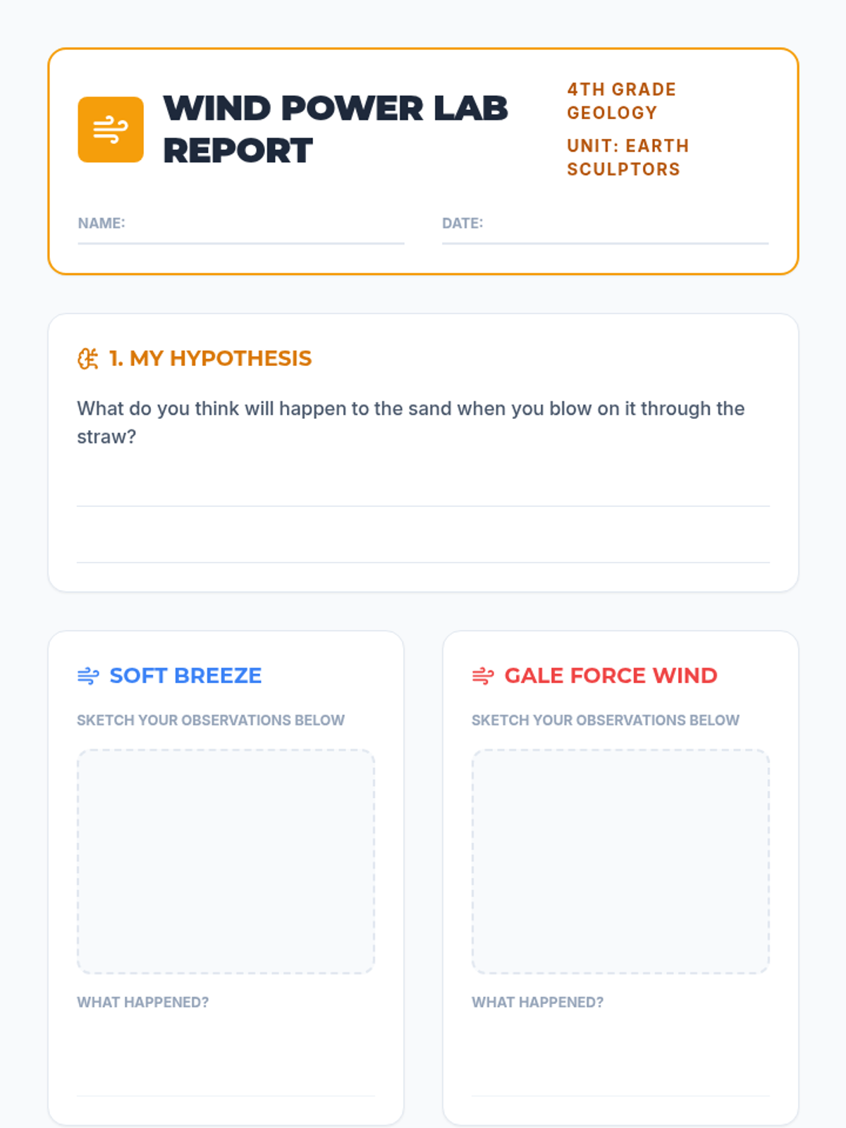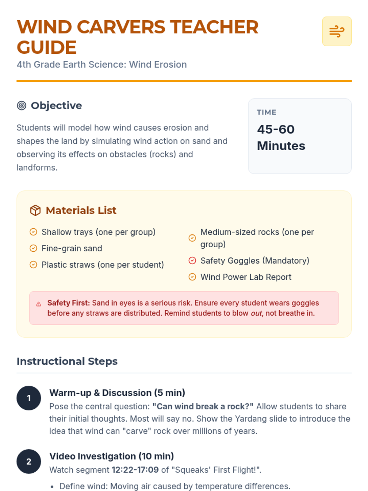 A 4th-grade Earth Science sequence focused on Earth's surface processes. This lesson specifically explores wind erosion and how it shapes landforms over time.