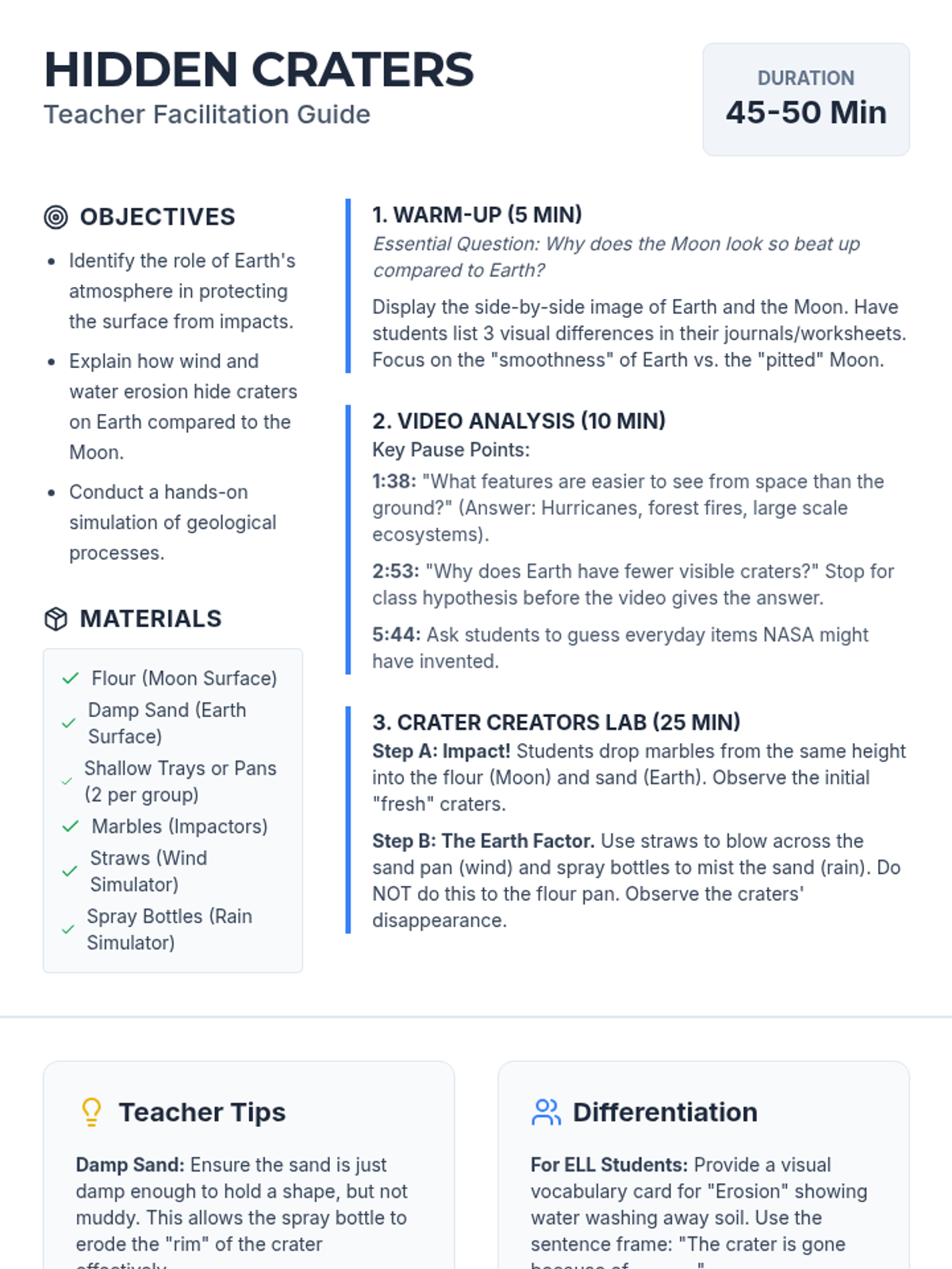 A 4th-grade science sequence focused on how planetary surfaces change over time, specifically comparing impact craters on the Moon and Earth. Students explore the roles of atmosphere and erosion in shaping planetary landscapes.