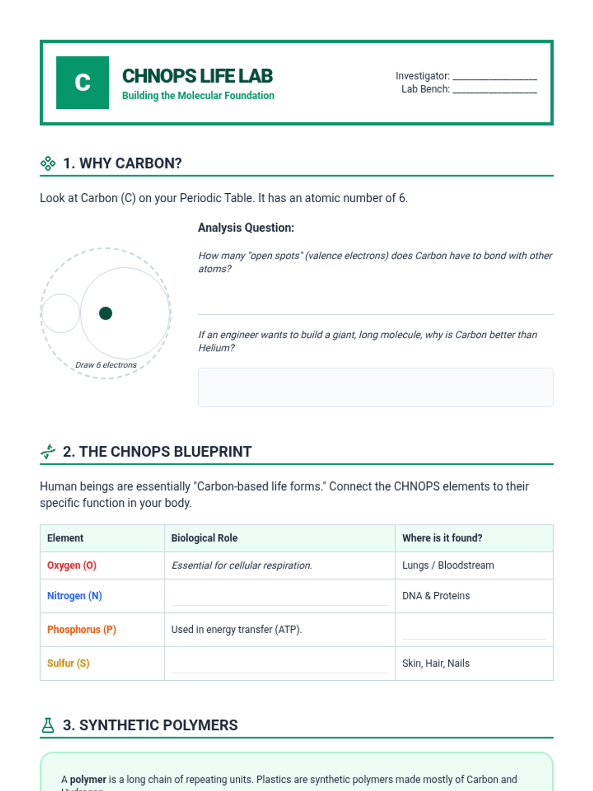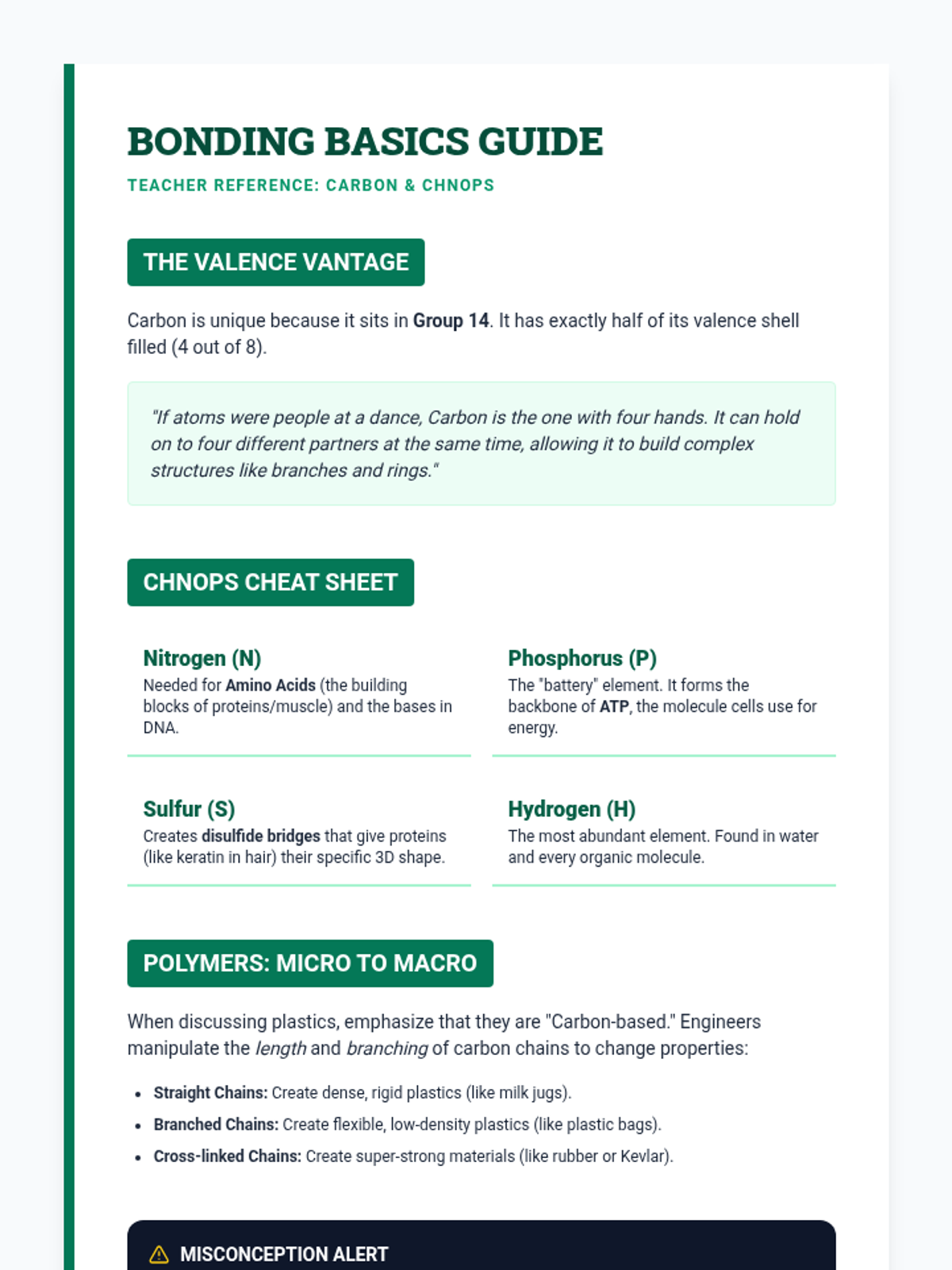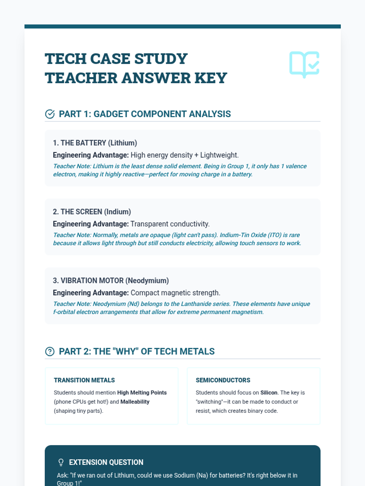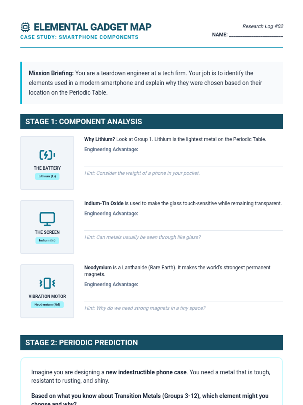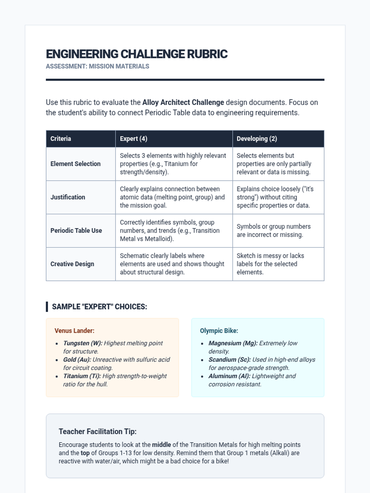 A 5-lesson sequence for 6th-grade students connecting the Periodic Table to engineering and material science. Students explore how atomic structure determines macroscopic properties, research elements in technology, investigate carbon's versatility, and apply their knowledge to solve engineering design challenges.