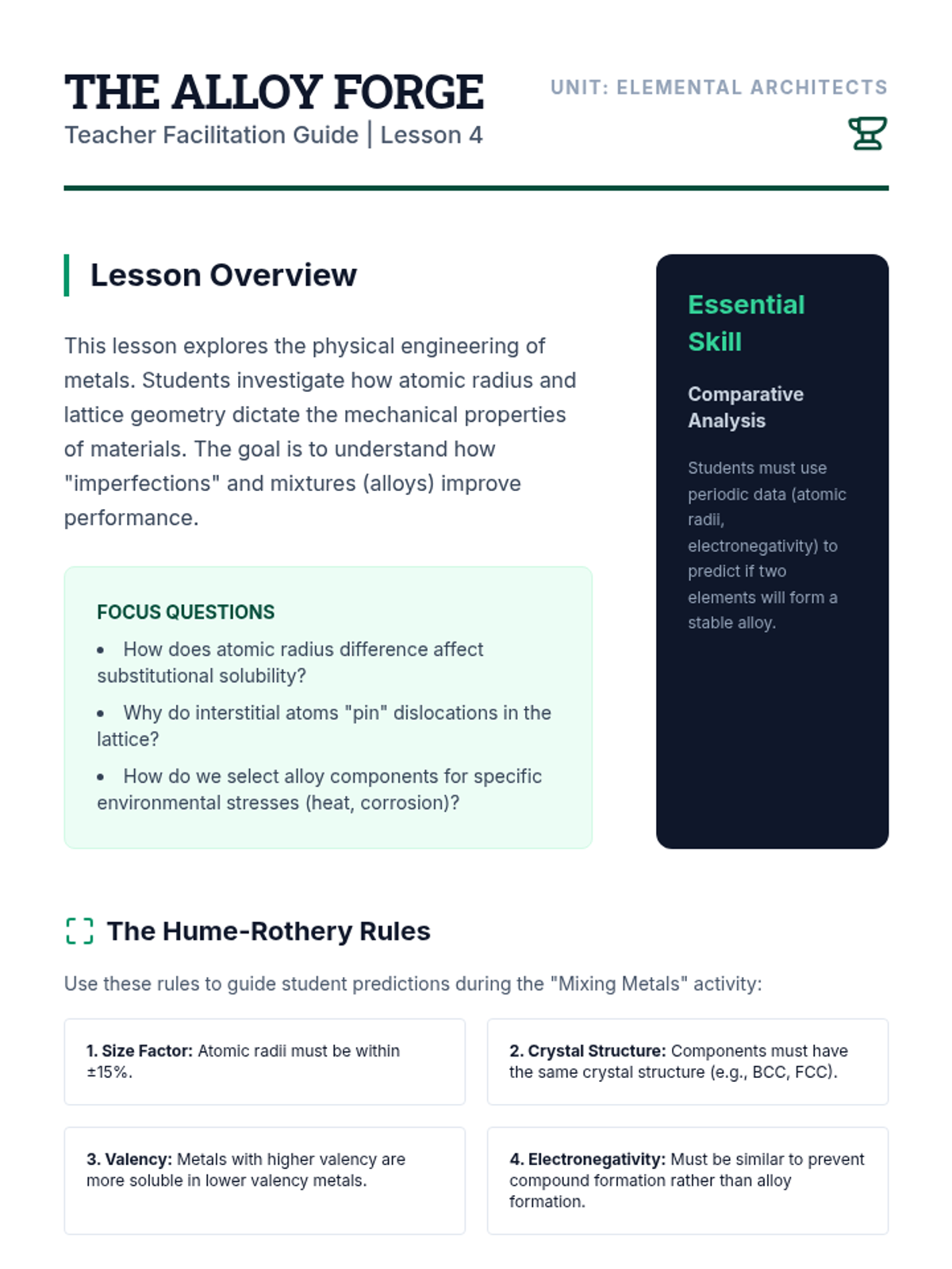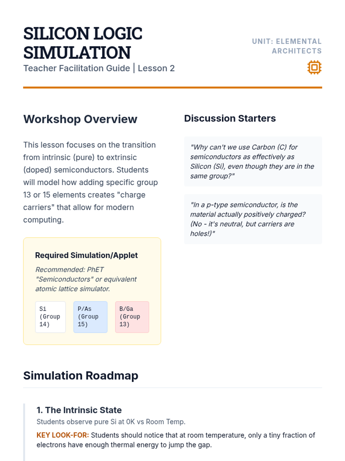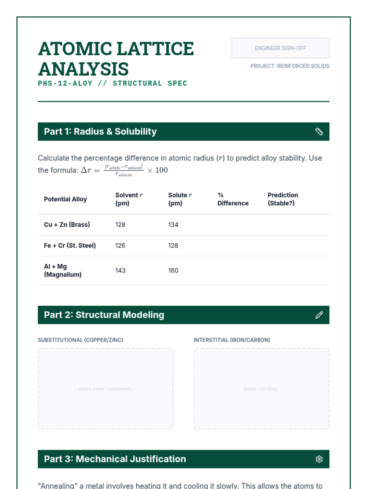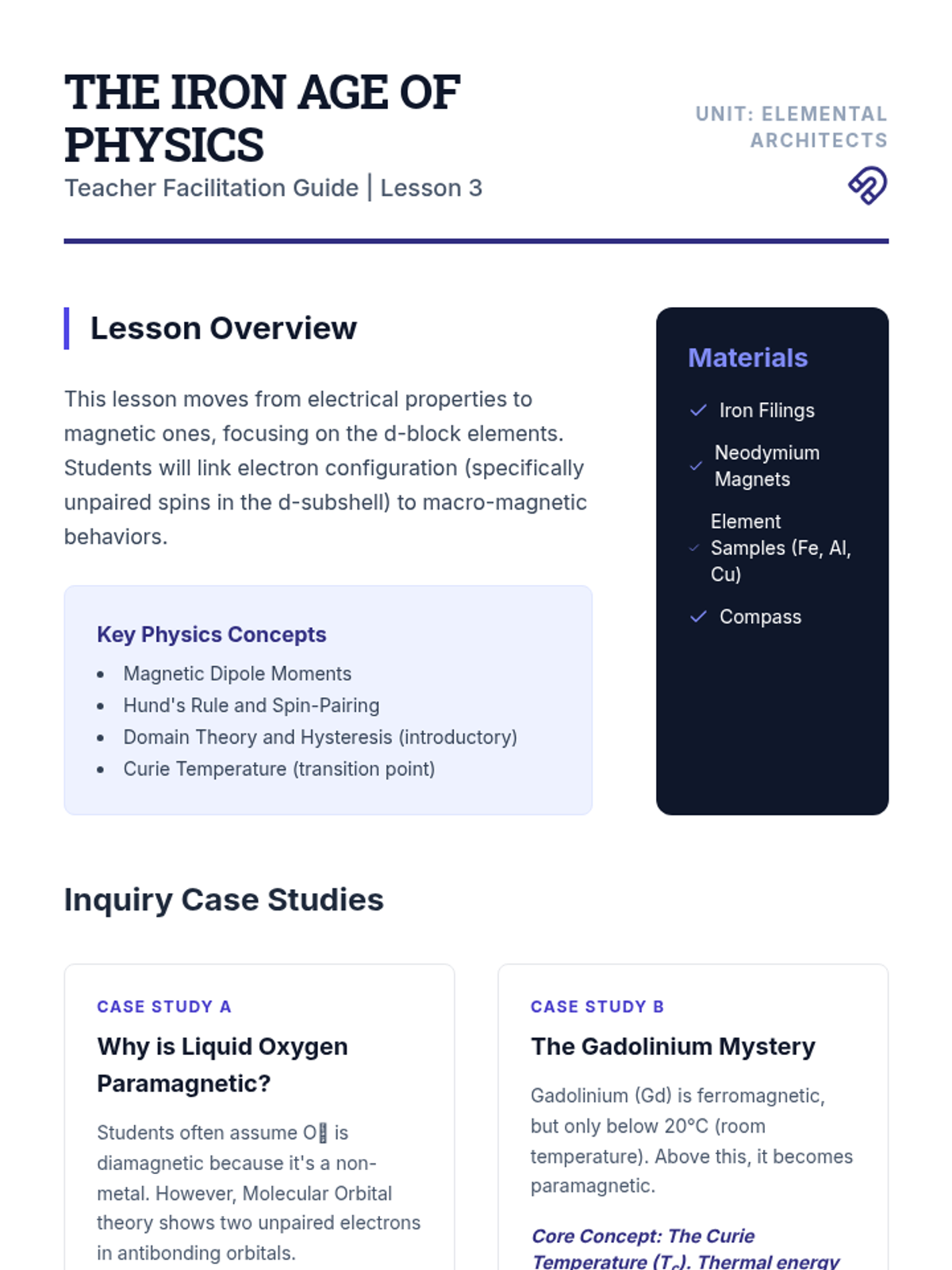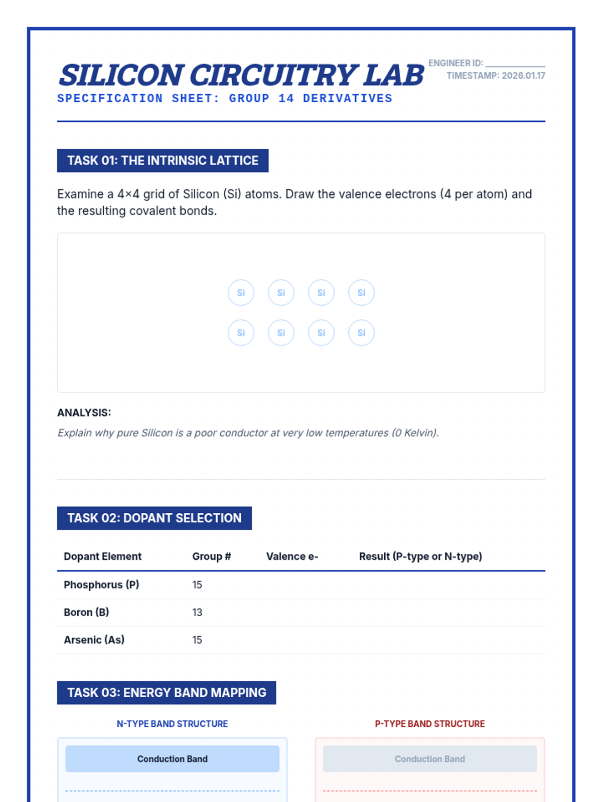 An advanced physics sequence exploring the engineering applications of periodic properties. Students investigate band theory, semiconductor doping, magnetic domains, and alloy formation to solve material science challenges.