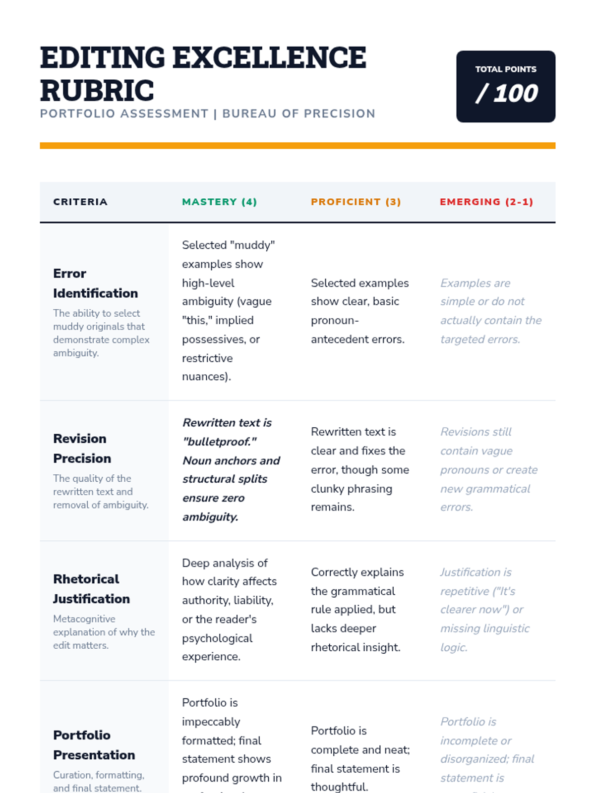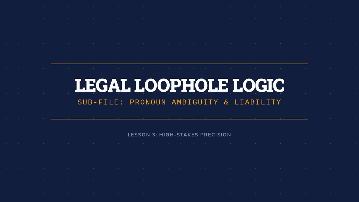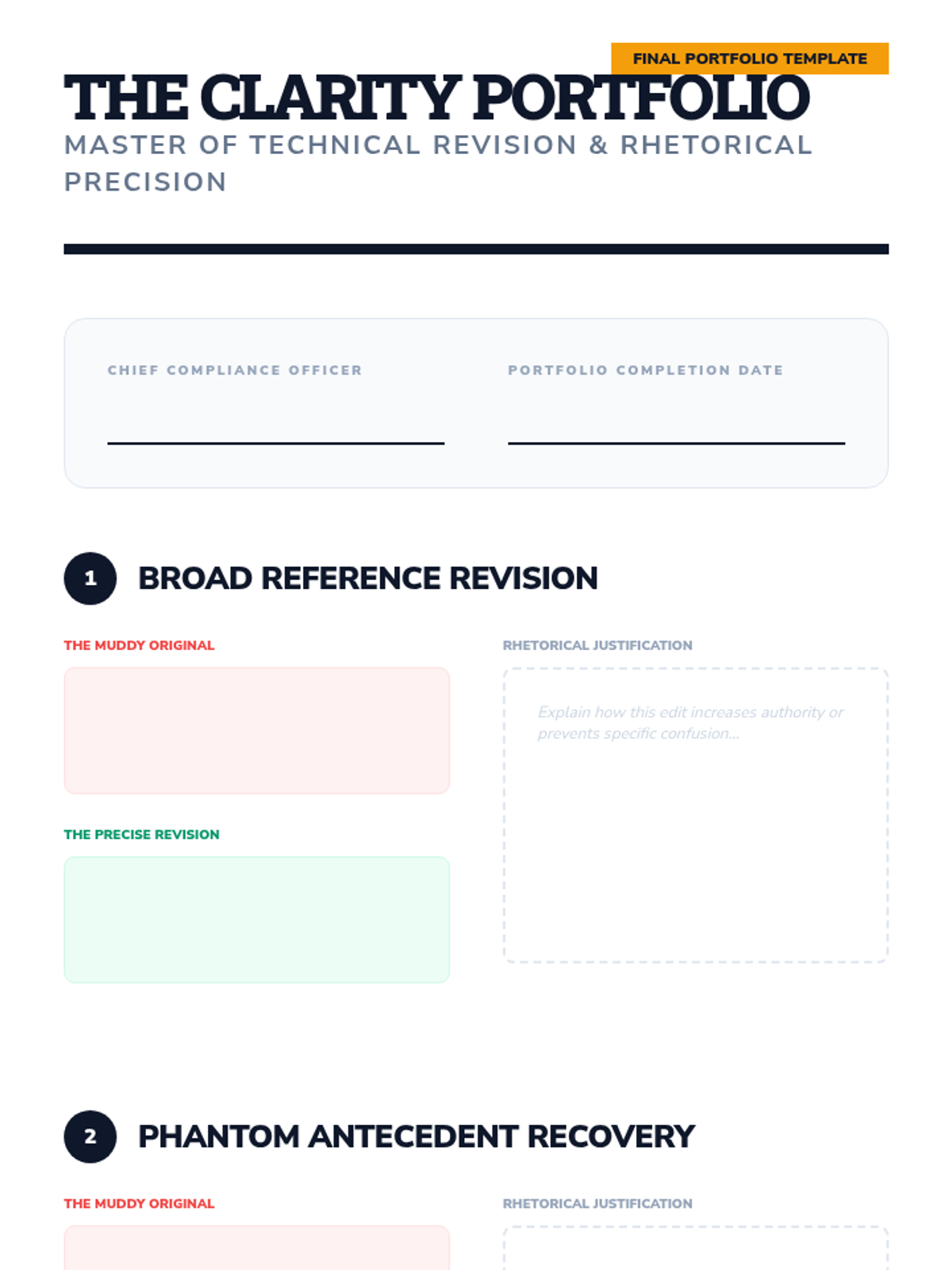 This sequence explores the rhetorical impact of ambiguous pronouns in high-stakes contexts like law and technical writing. Students progress from identifying vague 'broad references' to constructing a portfolio of precise, bulletproof technical revisions.