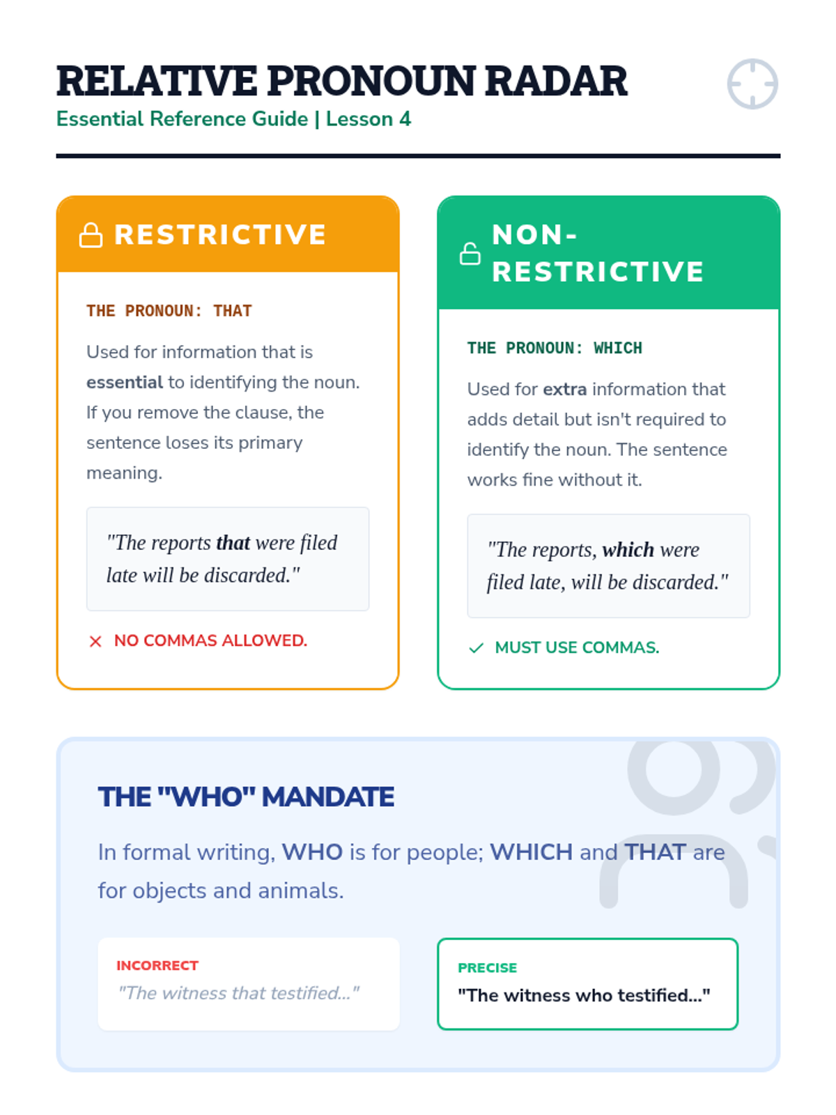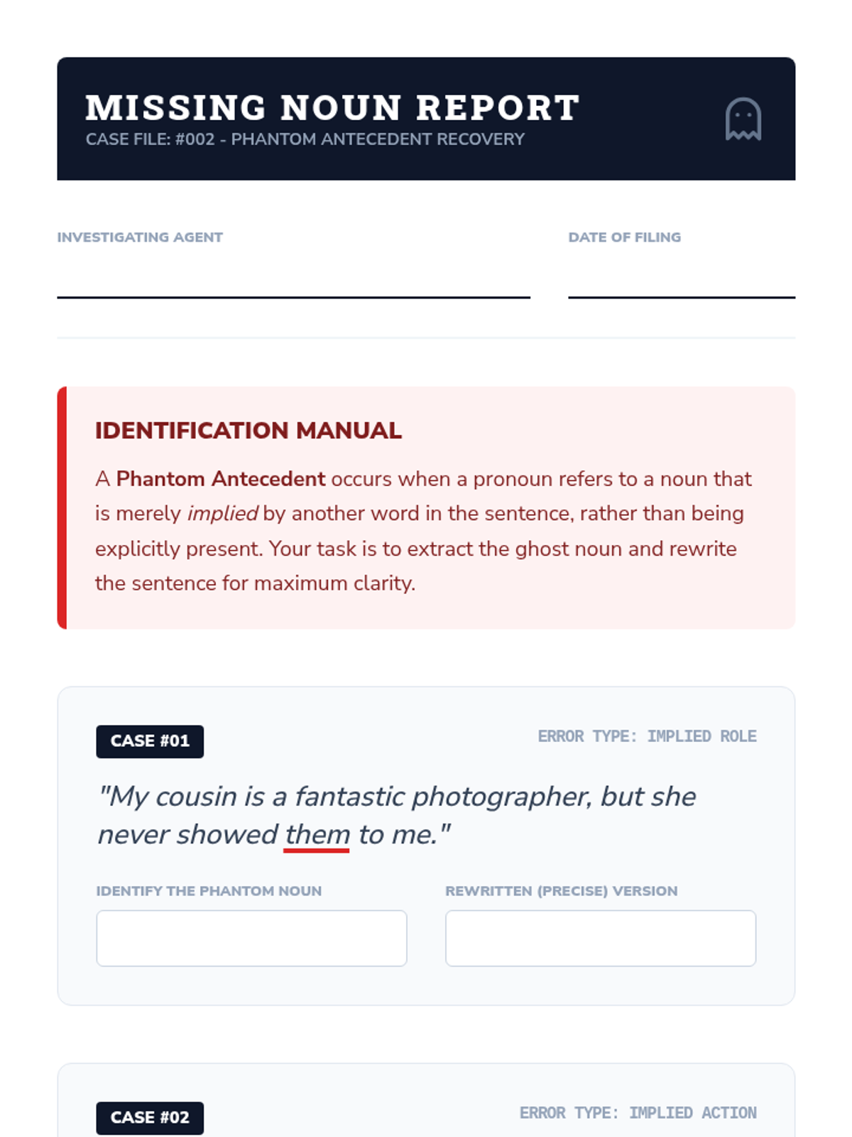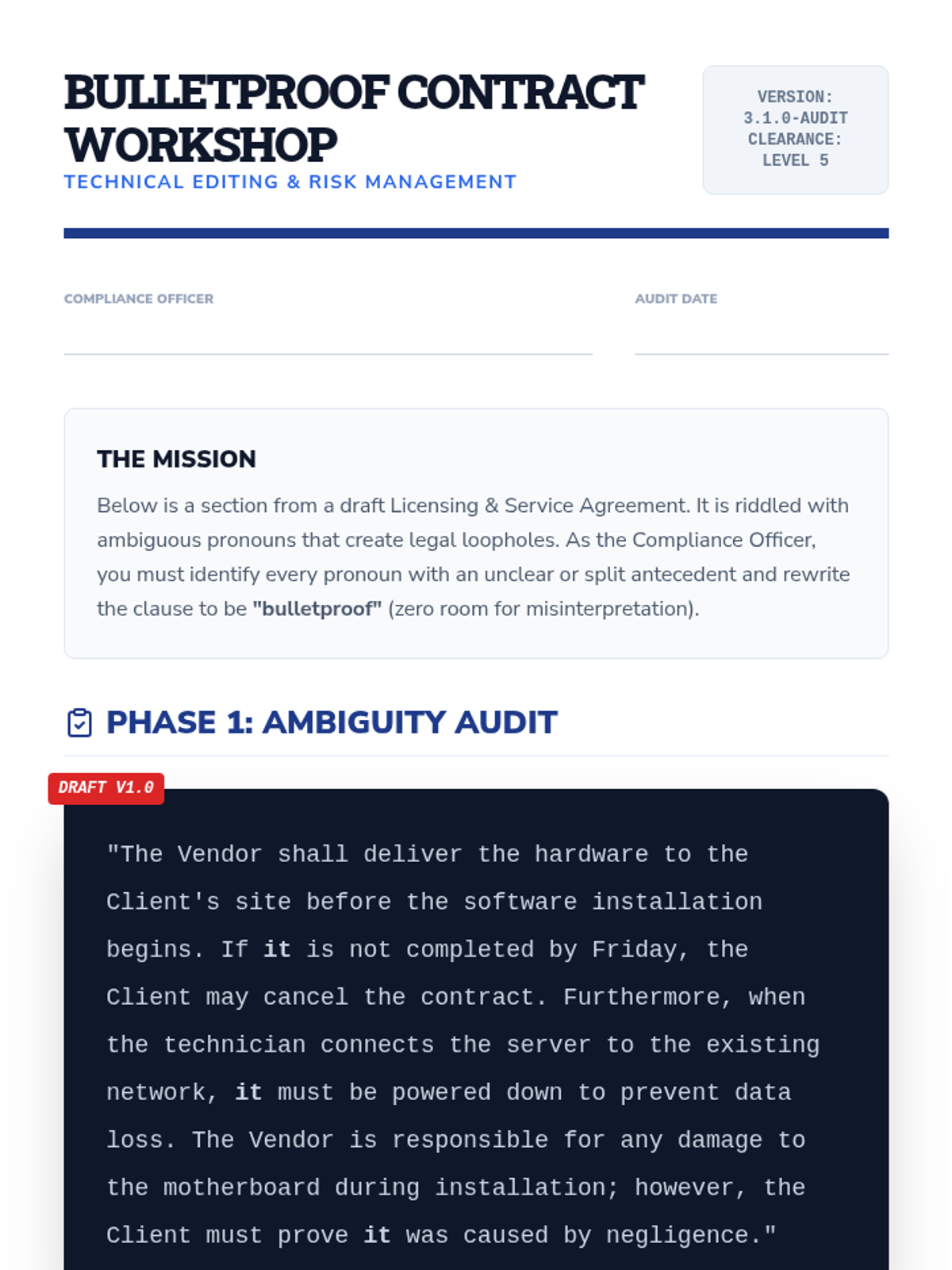This sequence explores the rhetorical impact of ambiguous pronouns in high-stakes contexts like law and technical writing. Students progress from identifying vague 'broad references' to constructing a portfolio of precise, bulletproof technical revisions.