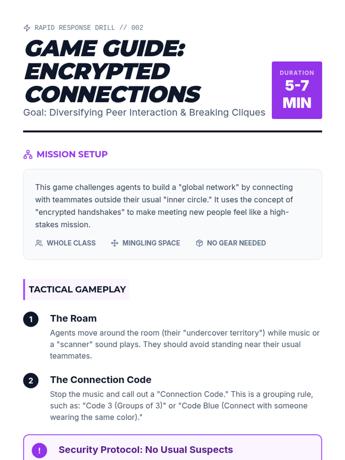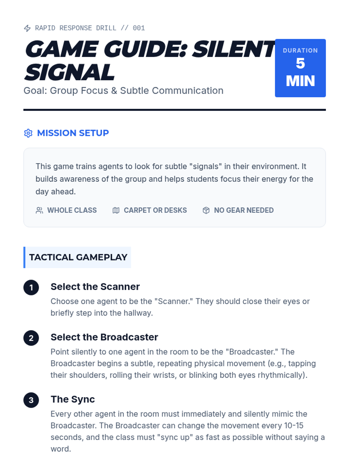 A series of high-impact, 15-minute mini-lessons designed to build essential classroom culture skills through a secret agent lens. From working independently to active listening, students train to become 'Elite Agents' in their learning community.
