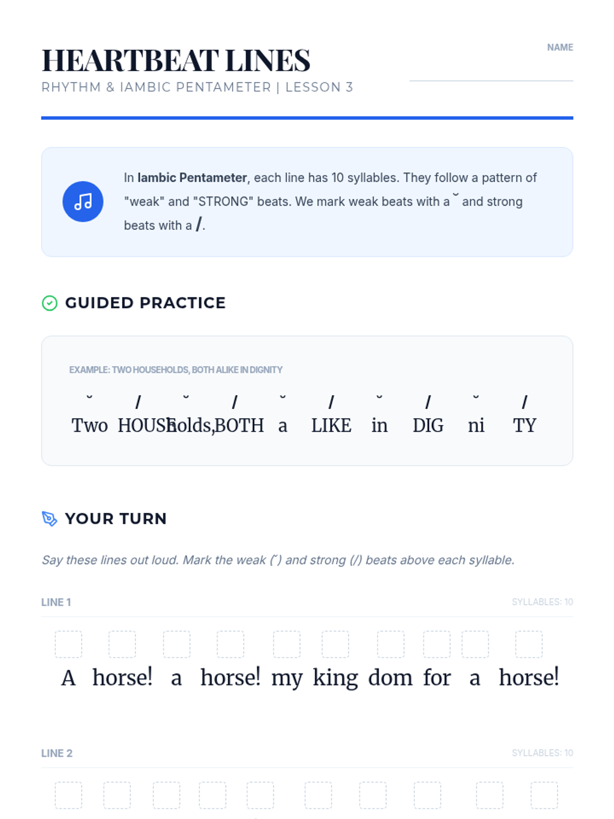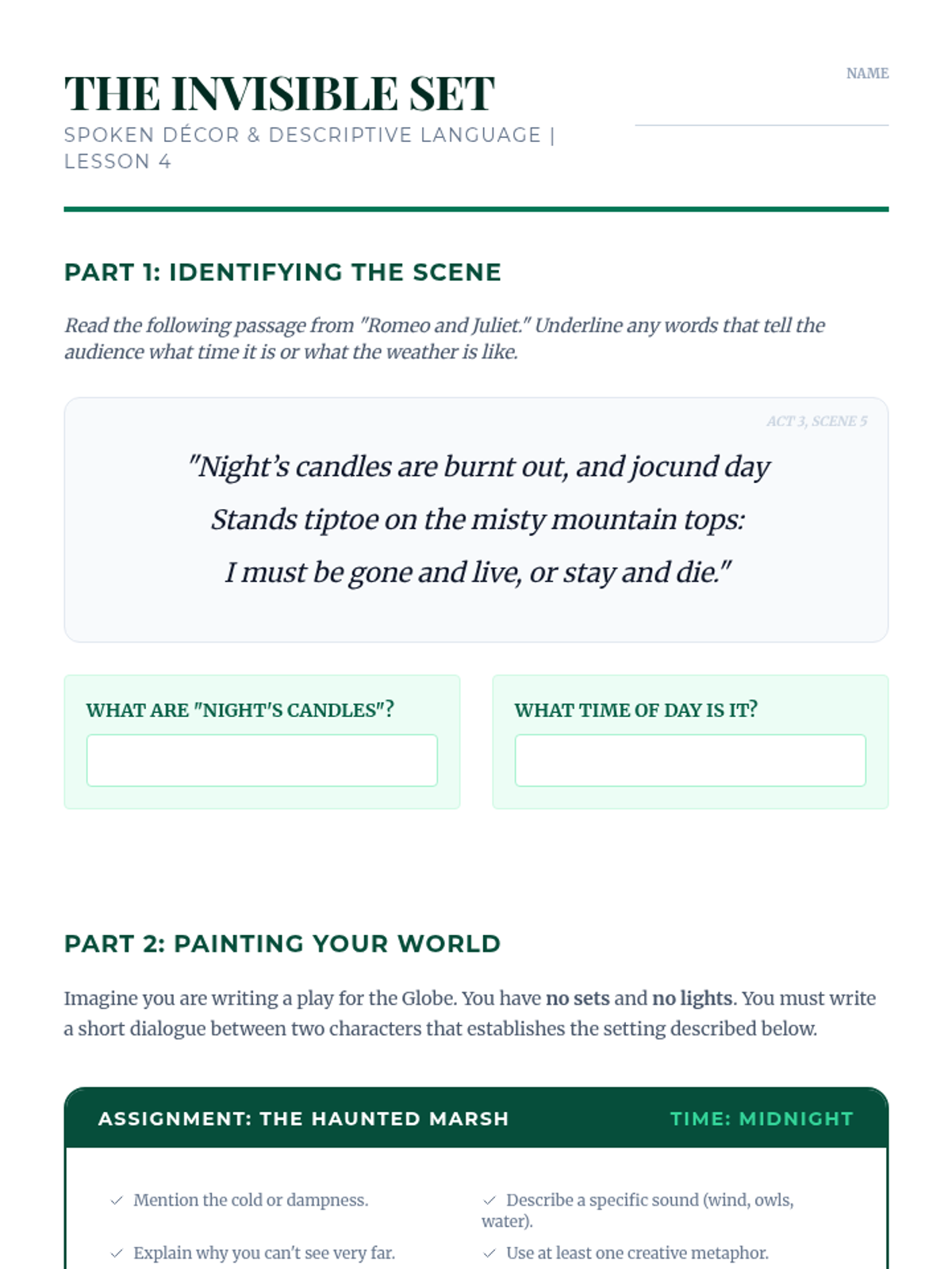 A 5-lesson sequence for 6th-grade students exploring the relationship between Elizabethan stage architecture and Shakespeare's use of language. Students journey from the physical structure of the Globe Theatre to the rhythmic beats of iambic pentameter and the illusions of stage combat.
