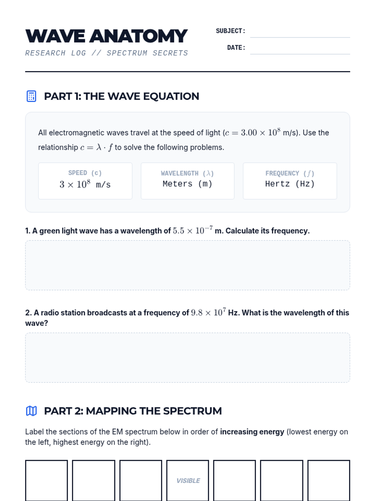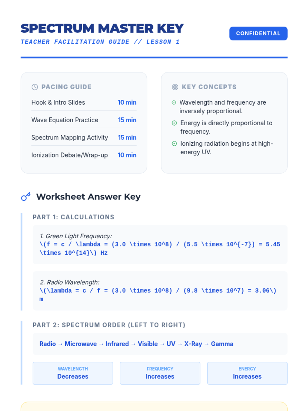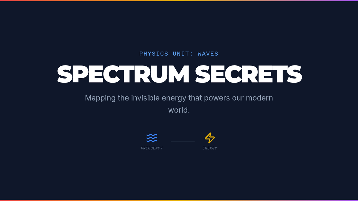 A comprehensive 10th-grade physics unit on the electromagnetic spectrum, covering wave properties, communication technology, color theory, high-energy radiation, and astronomical spectroscopy. Students explore the inverse relationship between wavelength and energy while evaluating the societal impacts of various EM technologies.
