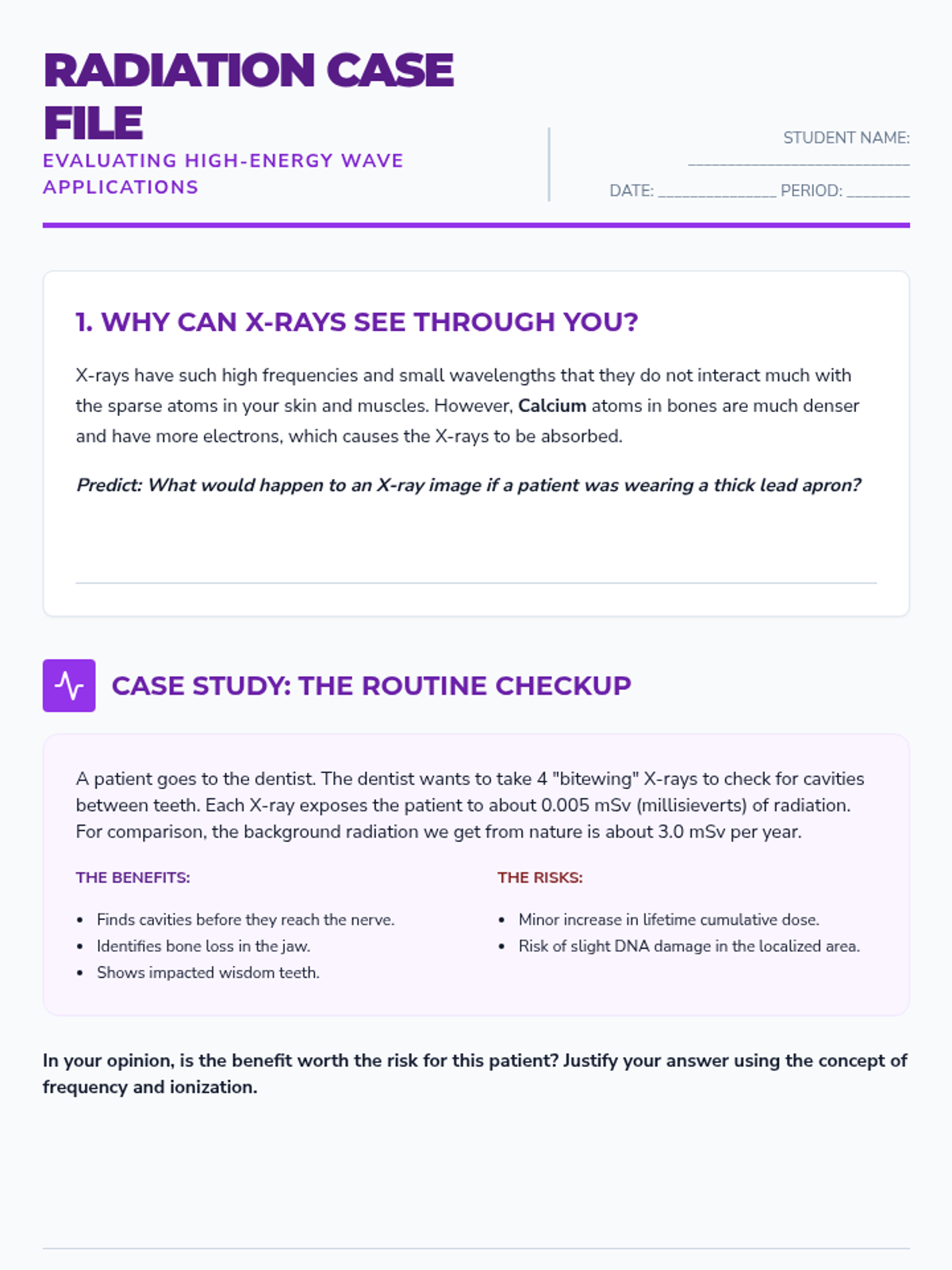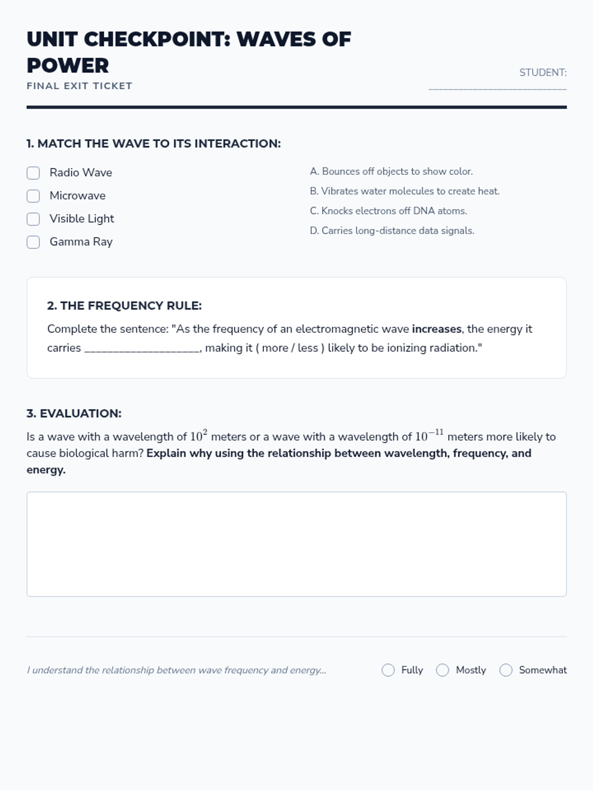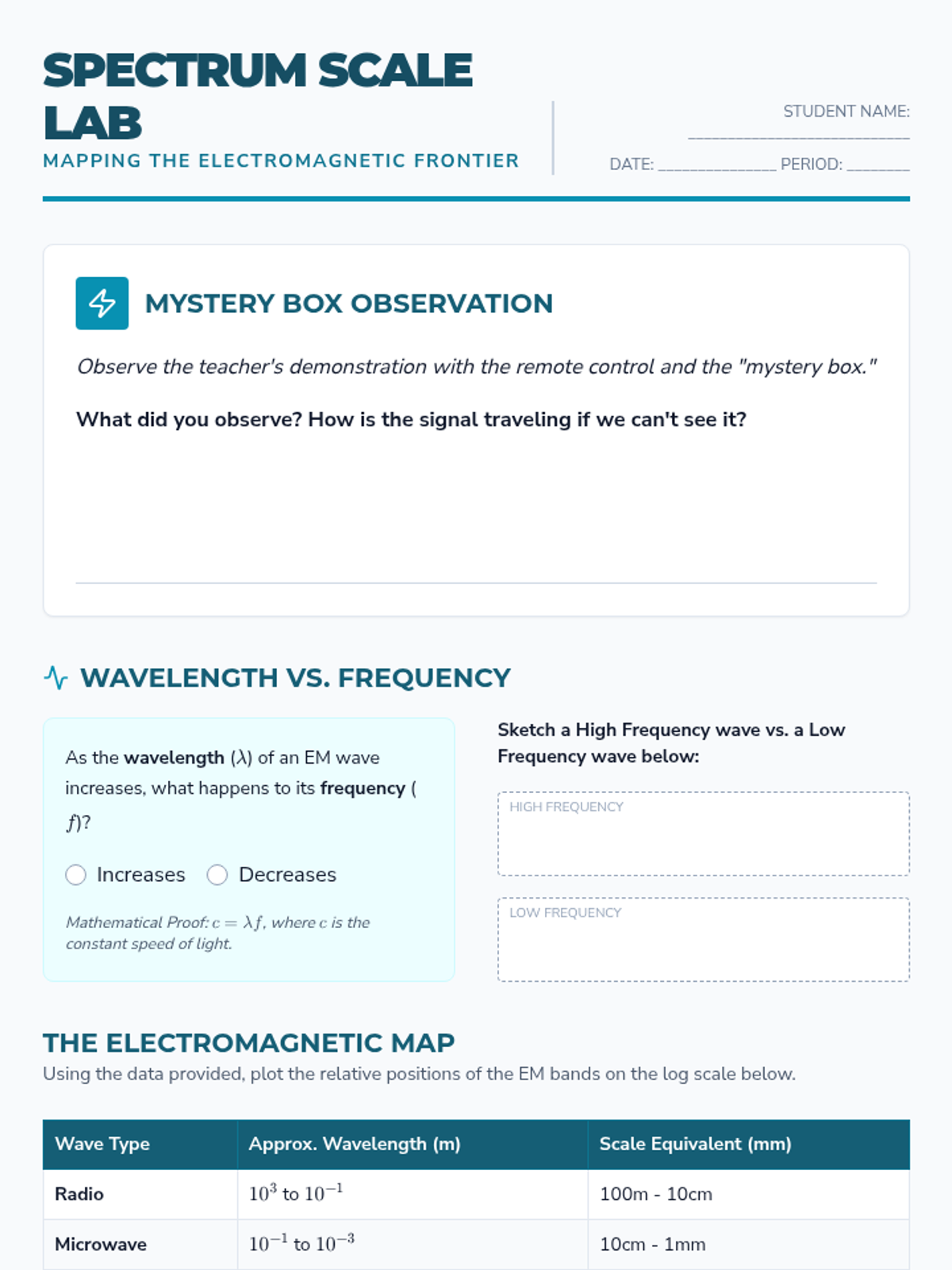 This 9th-grade physics sequence explores the electromagnetic spectrum, focusing on the dual nature of light, the relationship between frequency and energy, and the practical applications and risks of different EM radiation bands. Students progress from scale modeling to evaluating the biological impacts of high-energy waves.