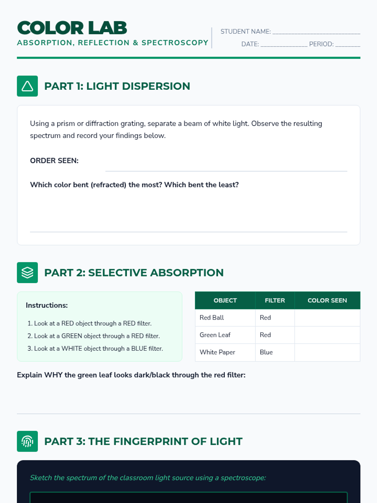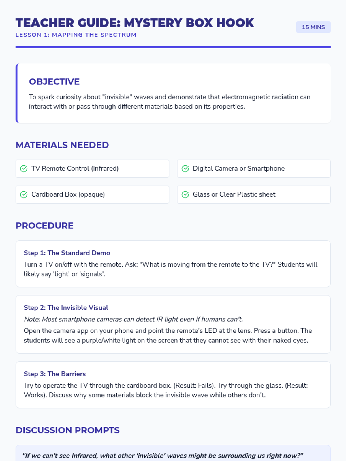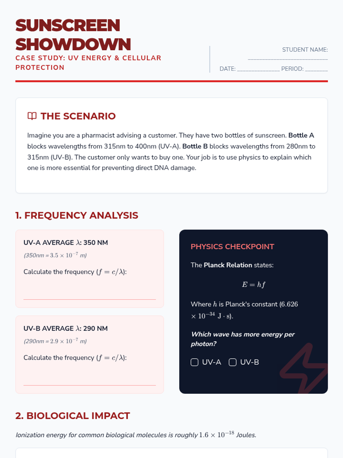 This 9th-grade physics sequence explores the electromagnetic spectrum, focusing on the dual nature of light, the relationship between frequency and energy, and the practical applications and risks of different EM radiation bands. Students progress from scale modeling to evaluating the biological impacts of high-energy waves.