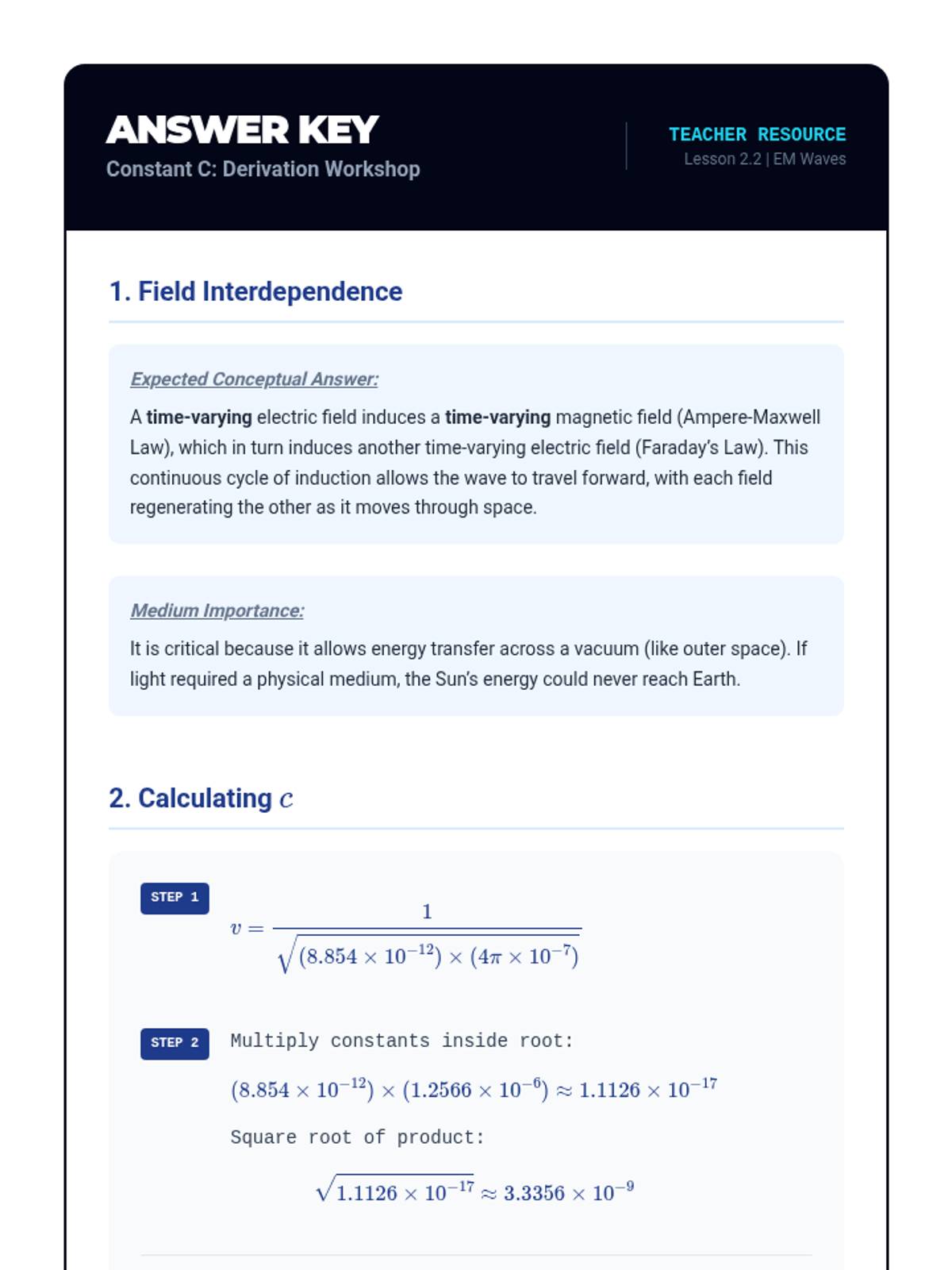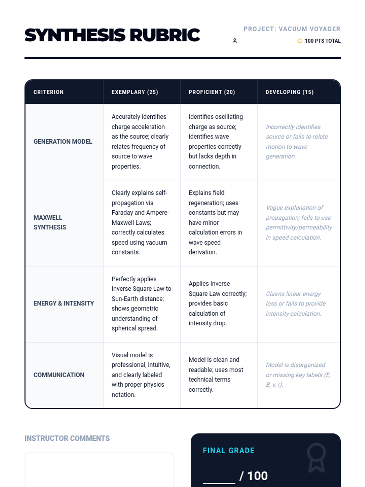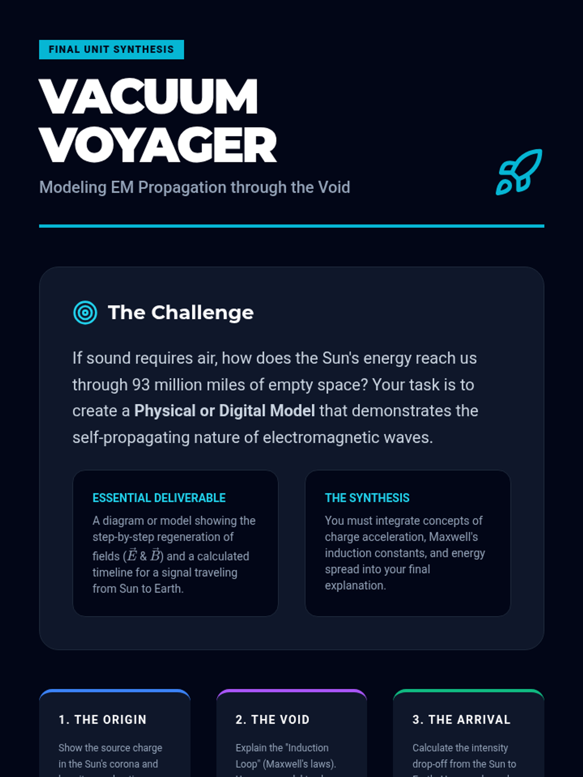 A comprehensive 12th-grade physics unit exploring the genesis, propagation, and behavior of electromagnetic waves, from oscillating charges to Maxwell's synthesis and the inverse square law.