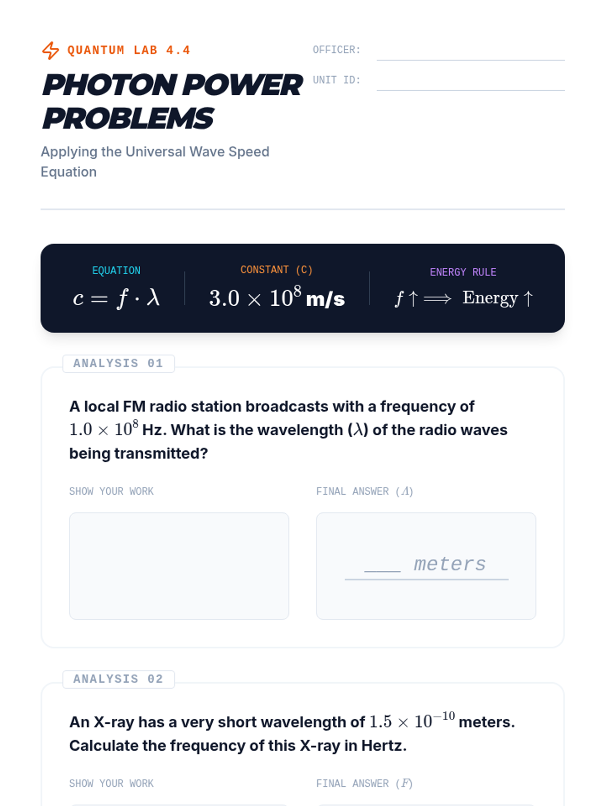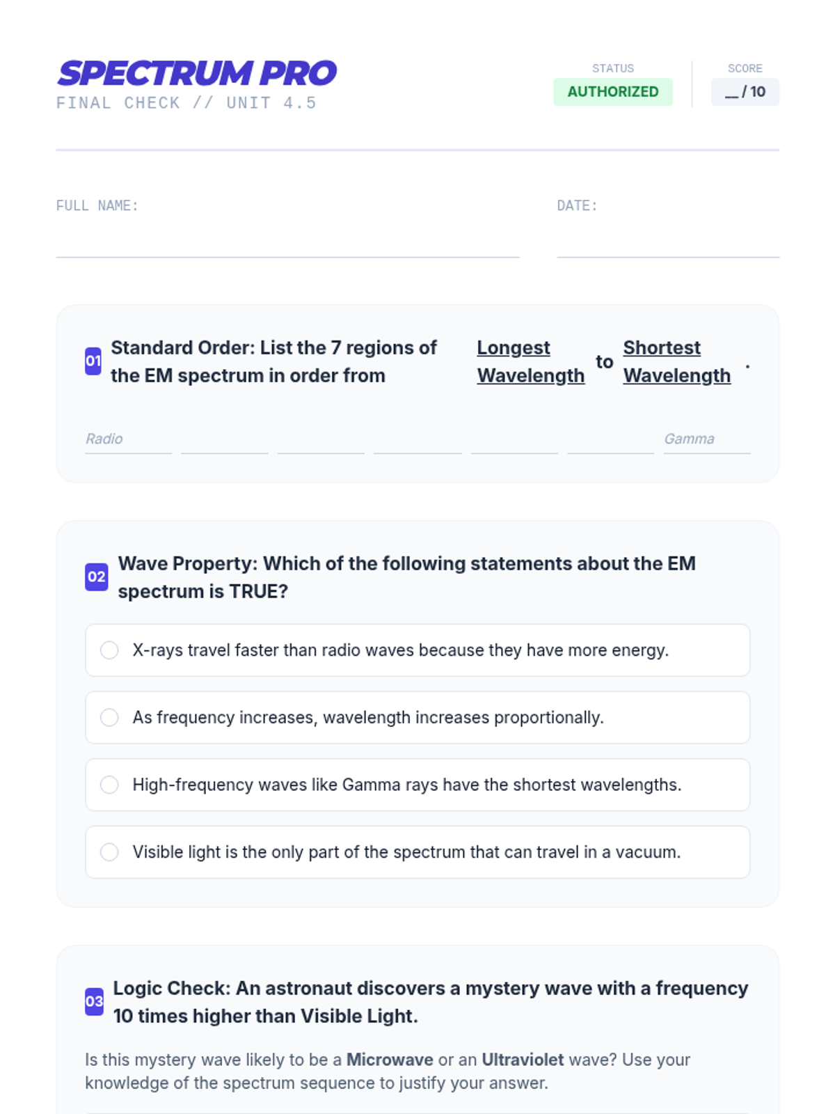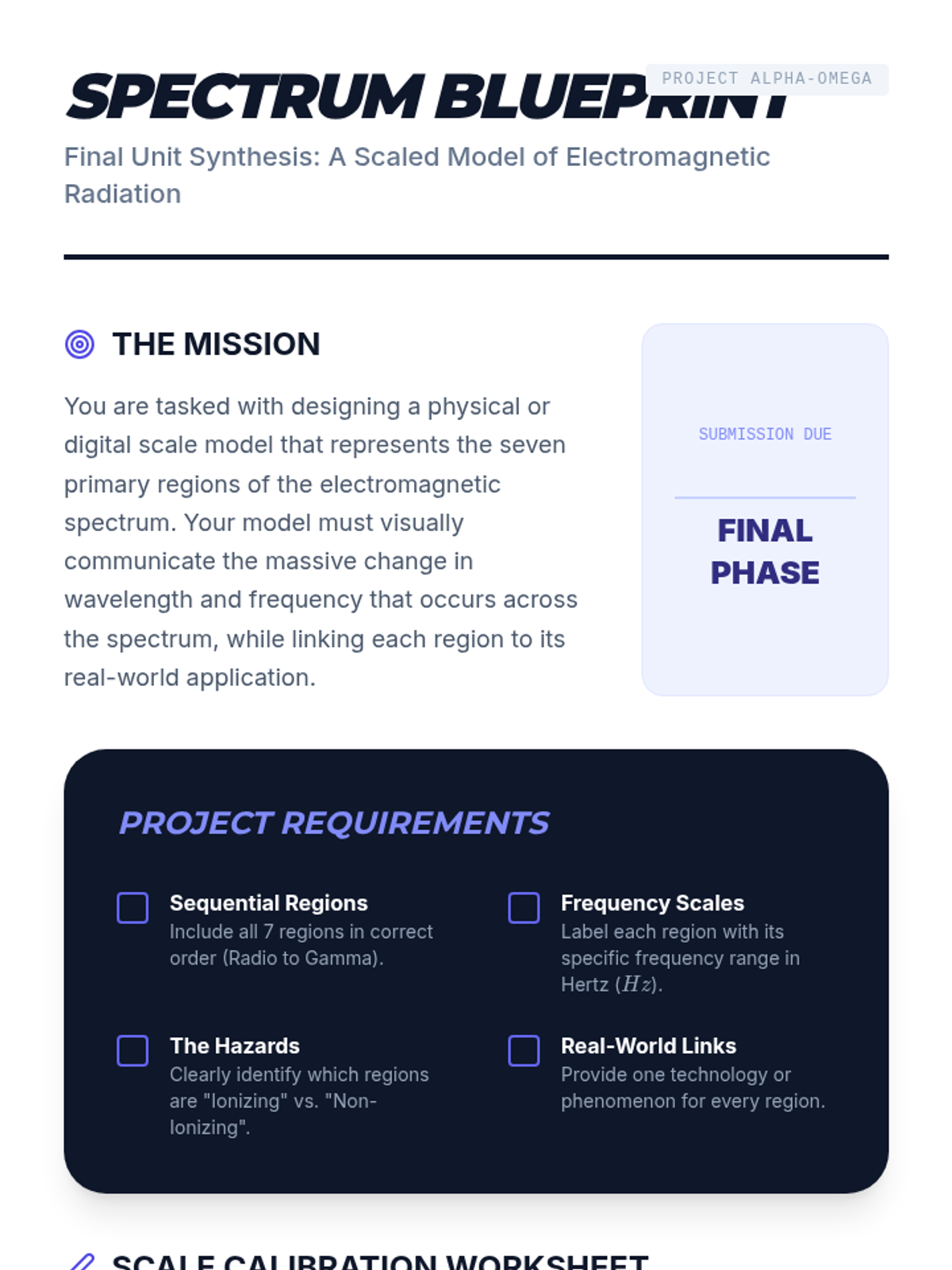 This sequence guides 8th-grade students through the physical and mathematical properties of electromagnetic waves, moving from basic wave types to complex calculations and the full scale of the electromagnetic spectrum. Students explore the inverse relationship between frequency and wavelength through inquiry-based labs and synthesis projects.