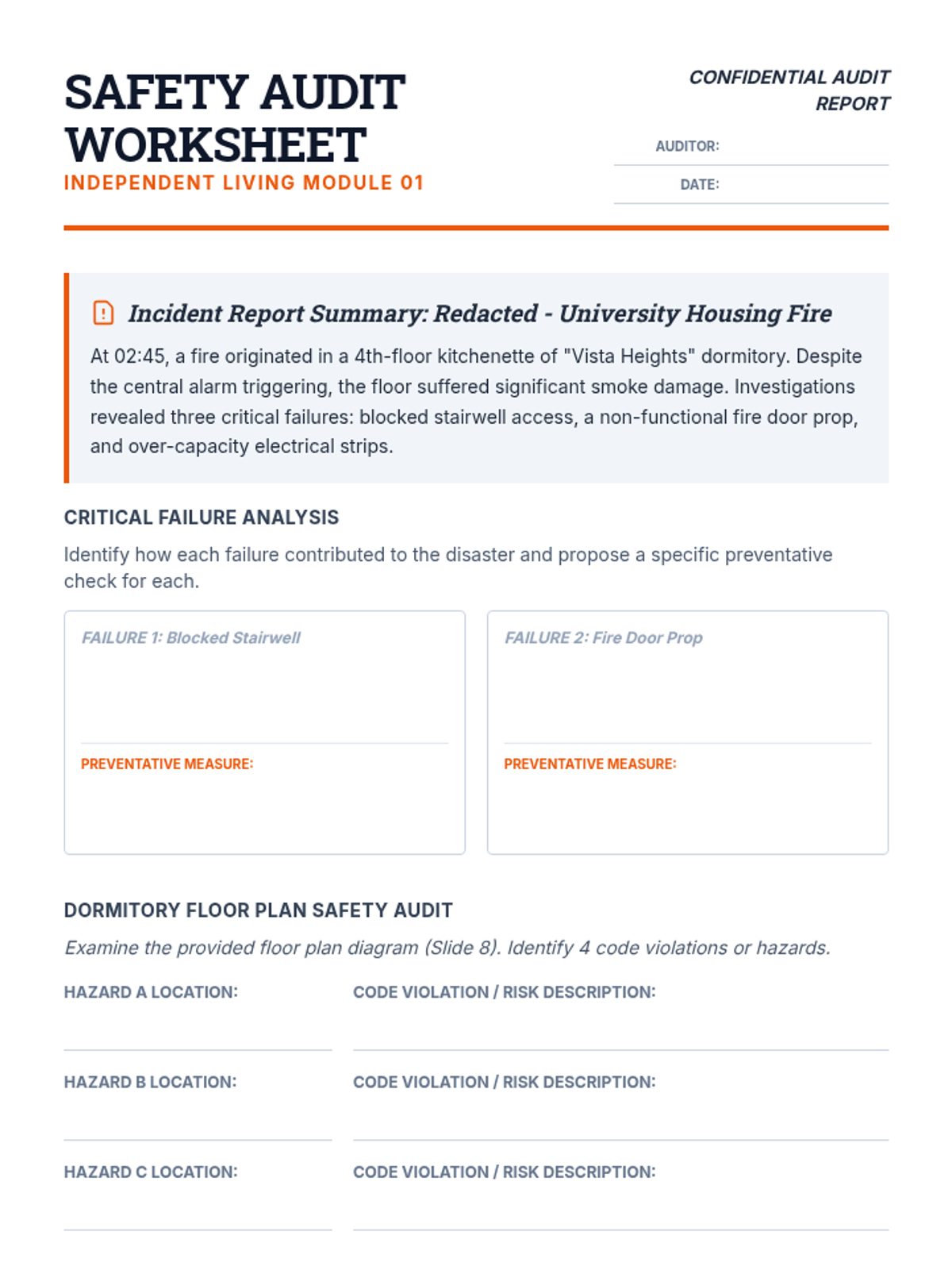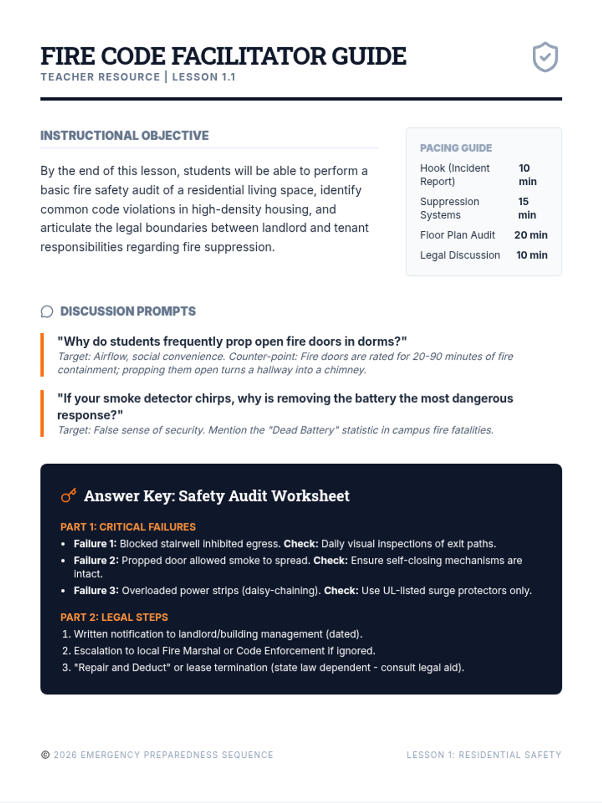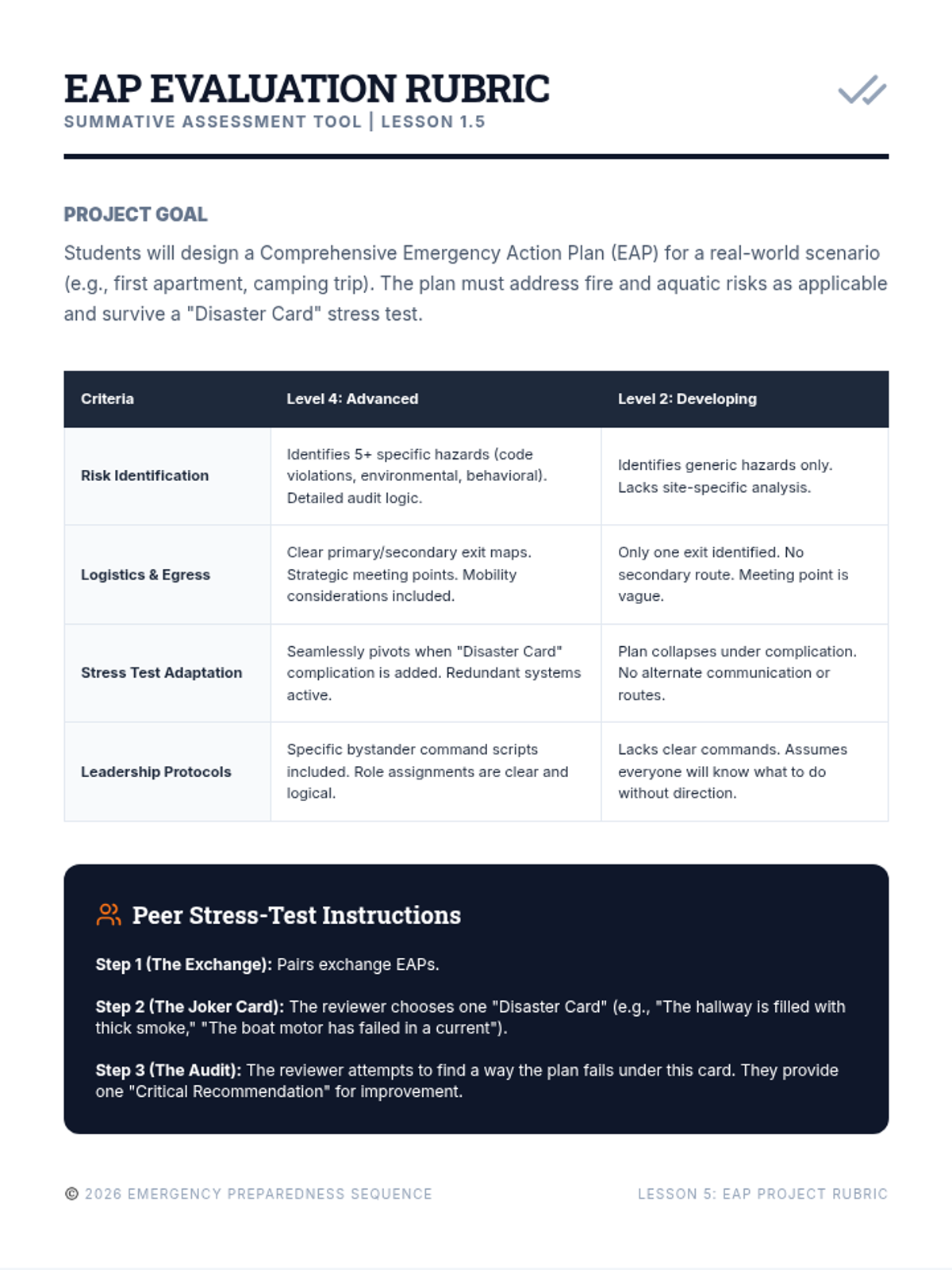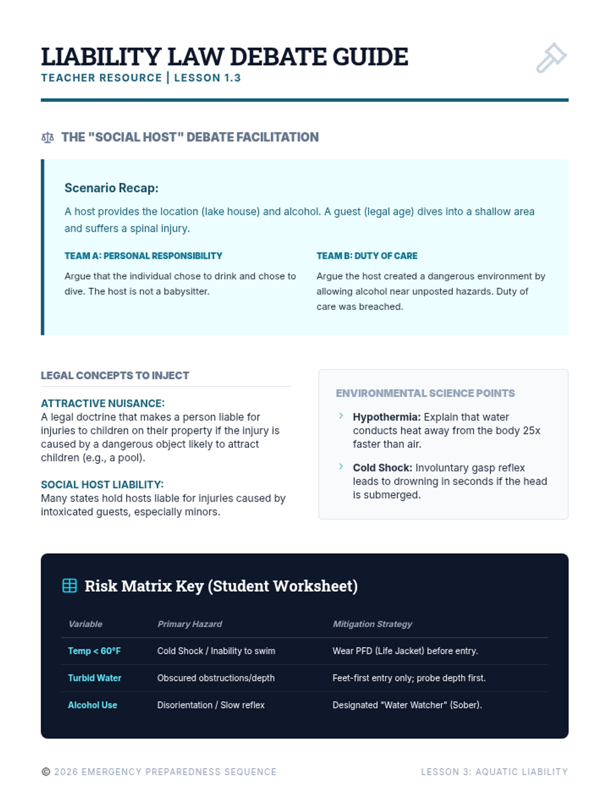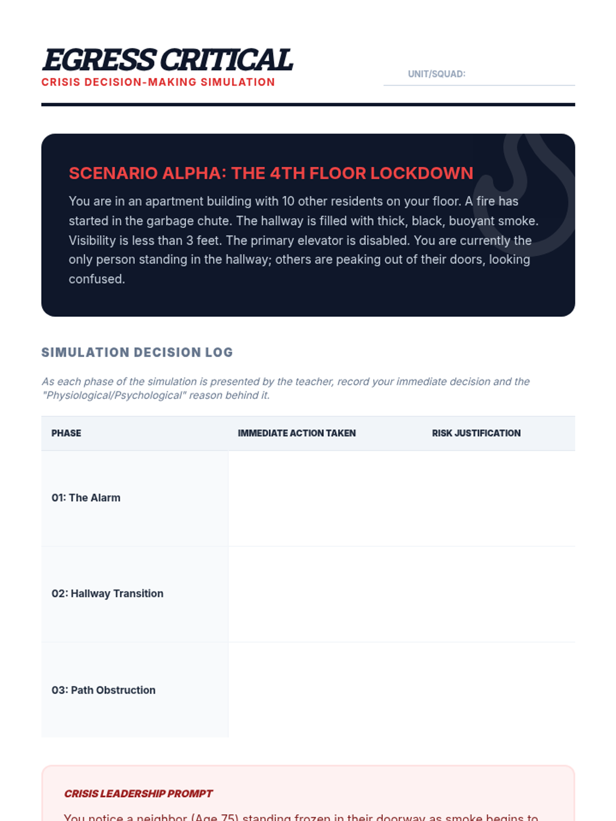 A comprehensive 5-lesson unit for 12th-grade students focused on advanced fire and water safety, risk mitigation, and emergency leadership for independent living. Students move from basic safety rules to complex hazard analysis and emergency action planning.