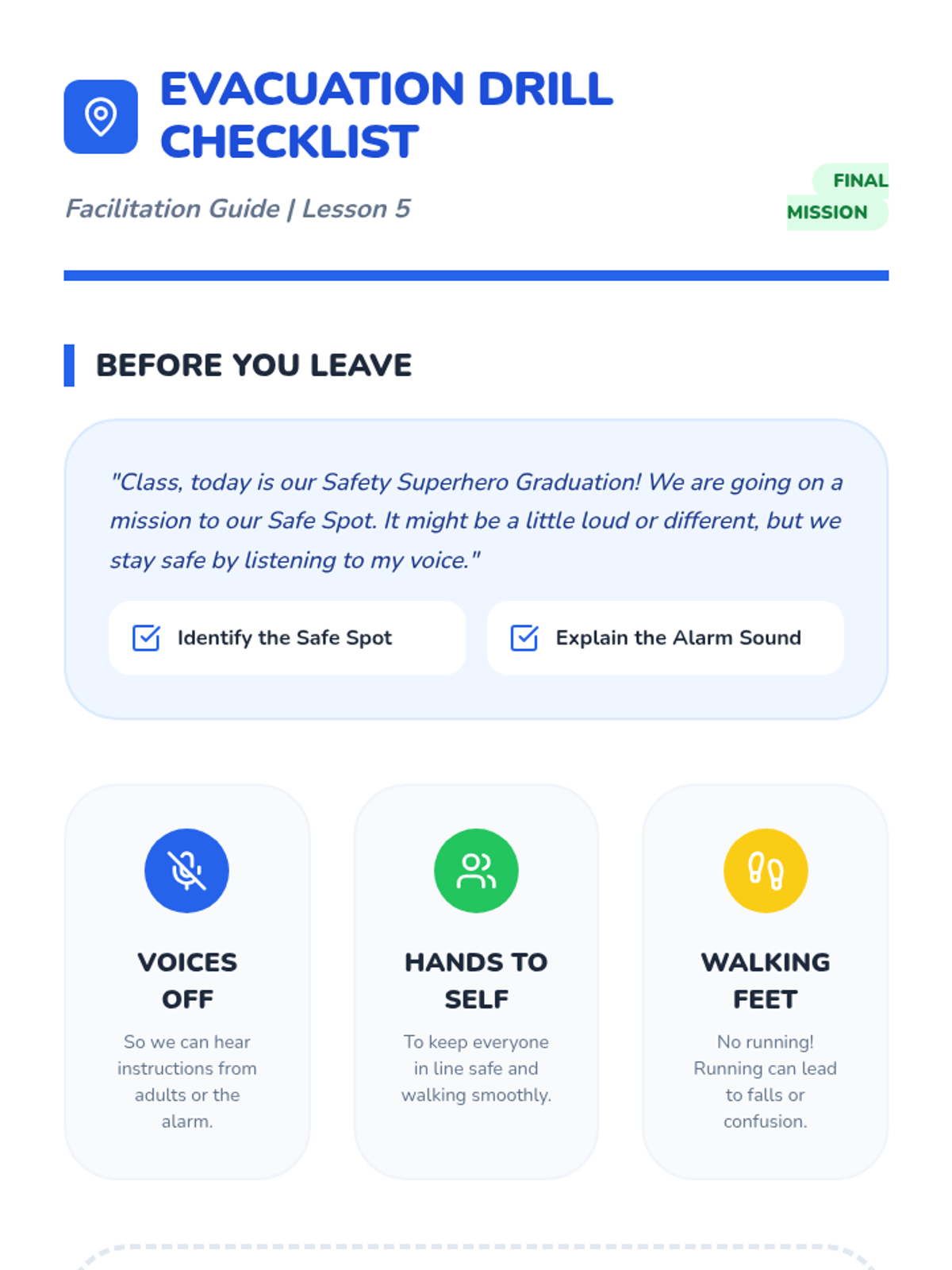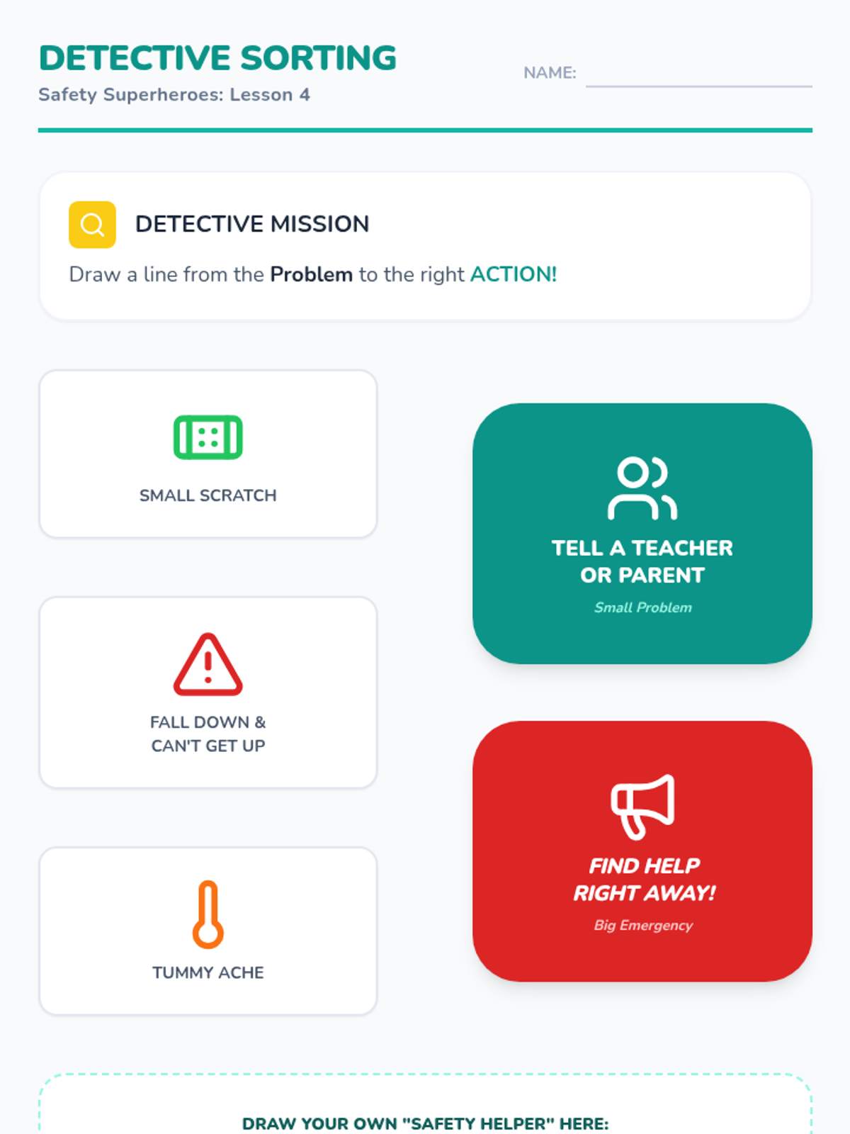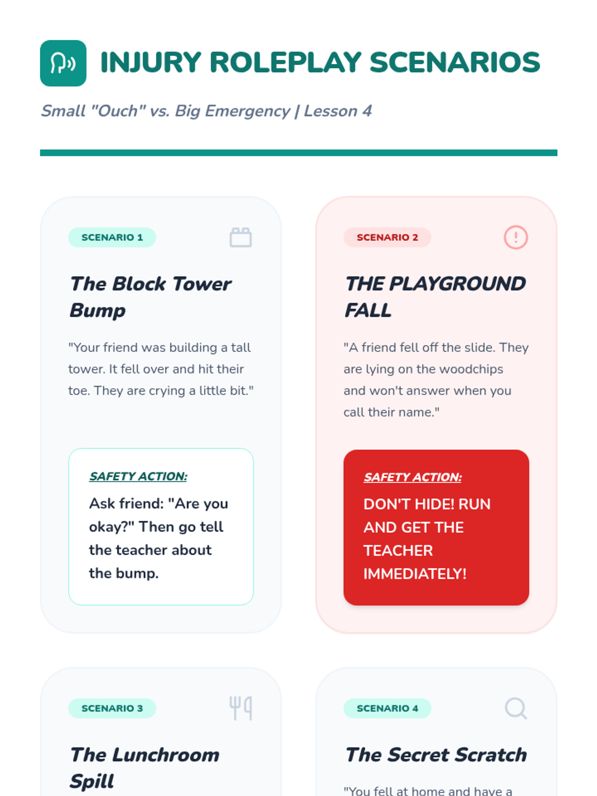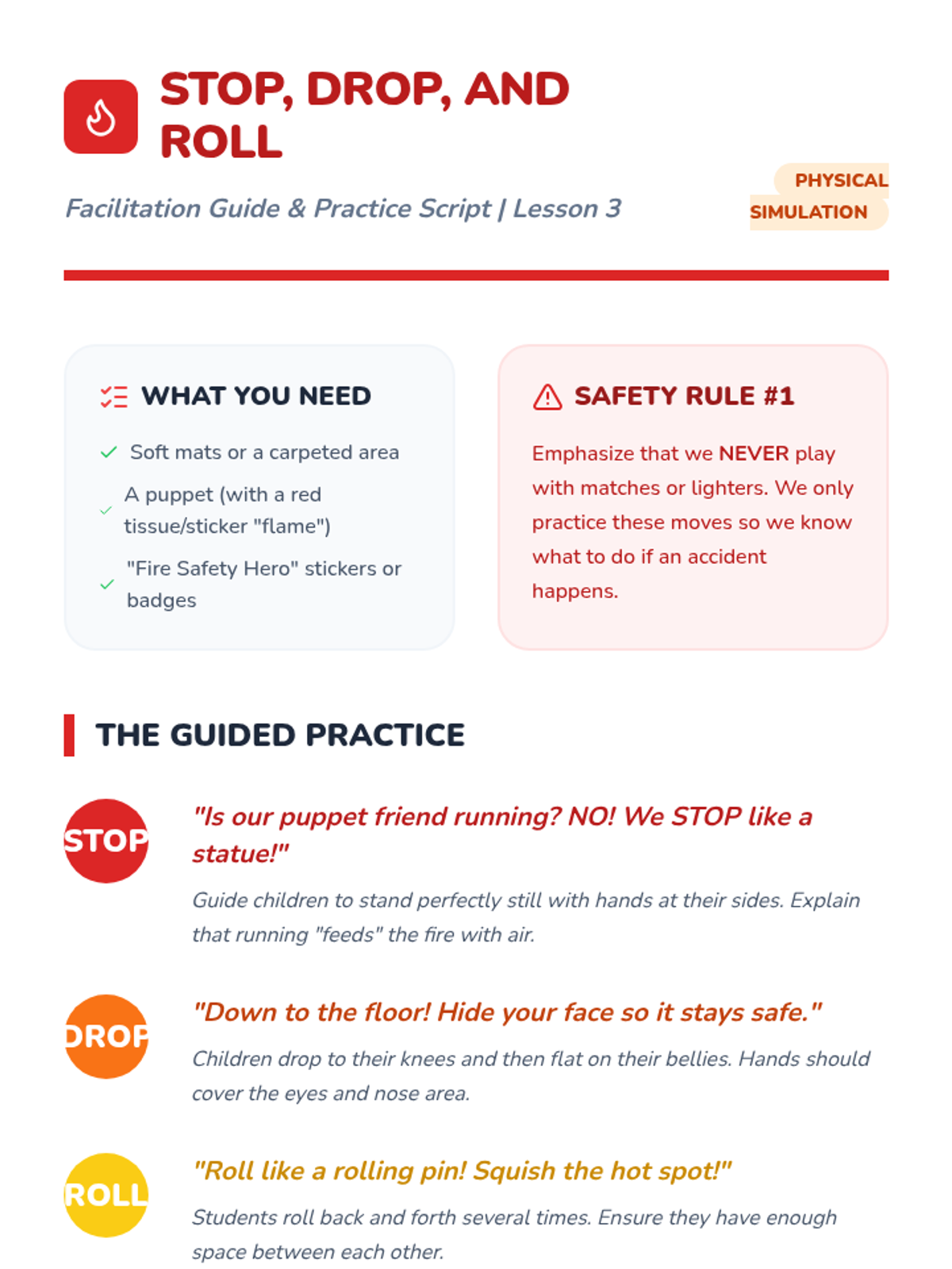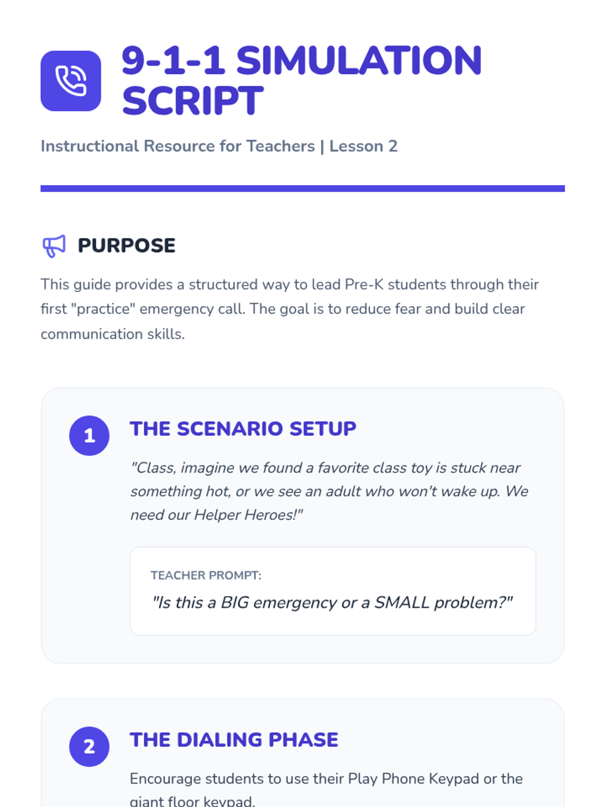 This sequence introduces Pre-K students to fundamental personal safety and emergency response through play, simulation, and community helper recognition. Students learn to identify helpers, dial 9-1-1, practice fire safety moves, and follow evacuation procedures.
