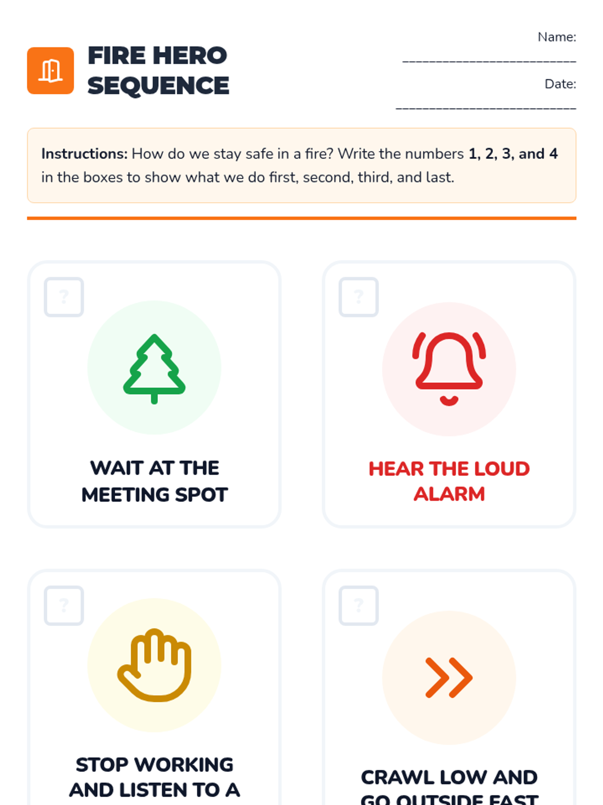 A comprehensive fire safety sequence for Pre-K students focused on hazard recognition, distinguishing tools from toys, and identifying emergency exits. Students learn through visual discrimination, role-play, and mapping to build confidence in emergency situations.