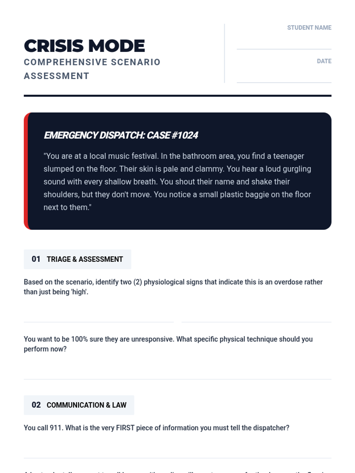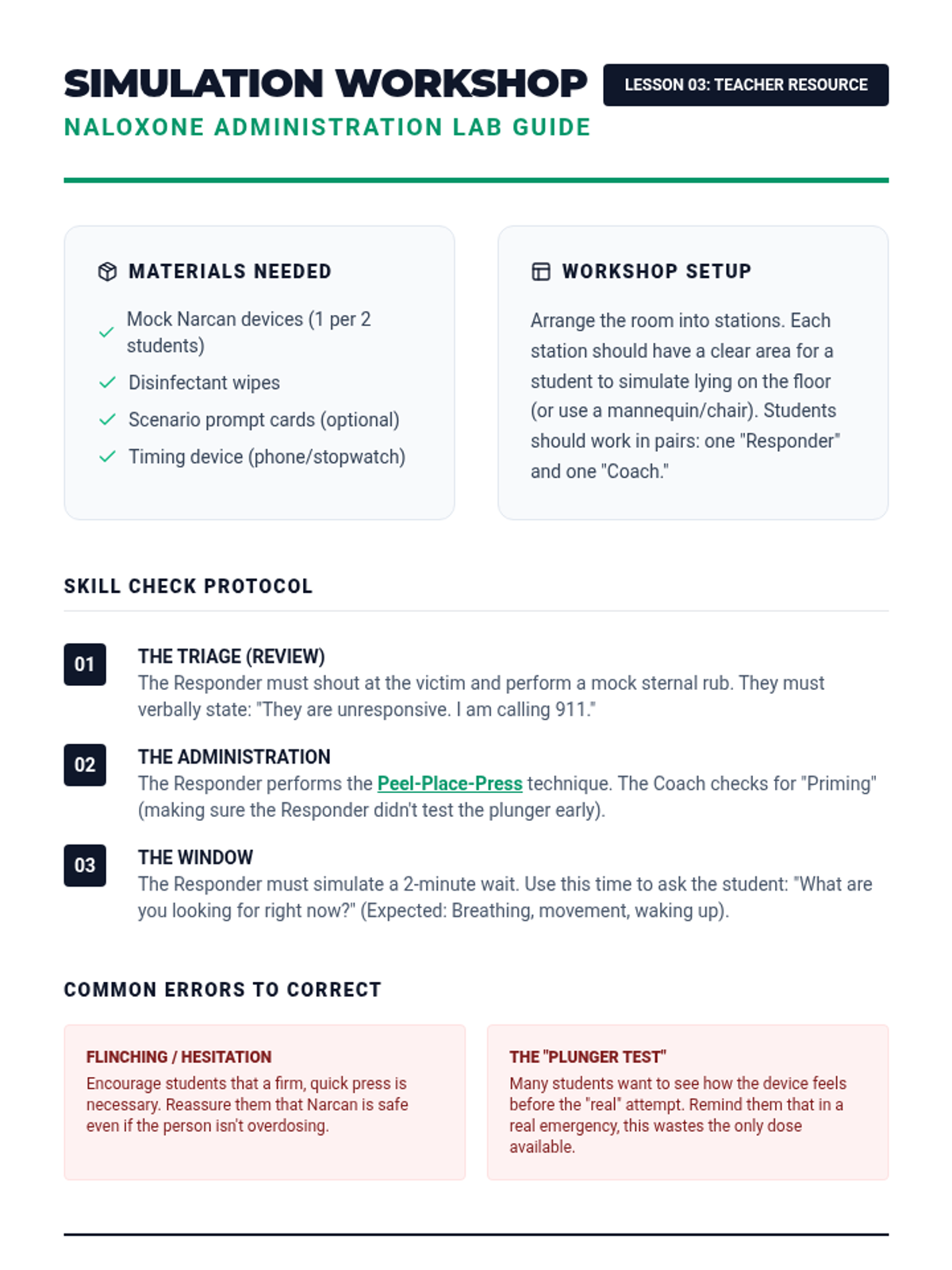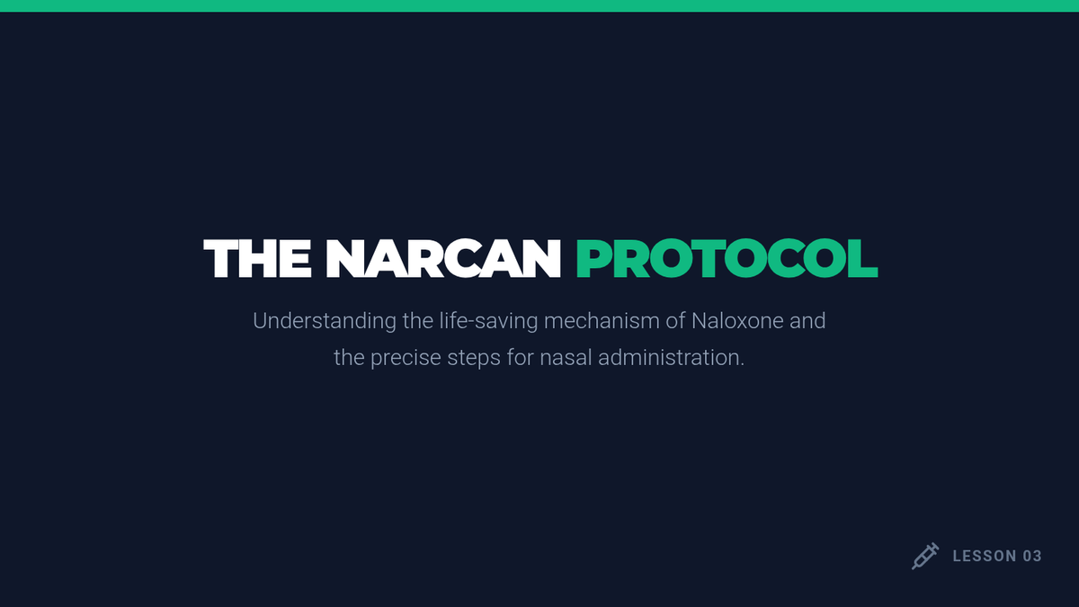 A comprehensive 12th-grade sequence focused on recognizing opioid overdoses, understanding legal protections, and mastering life-saving interventions like Naloxone administration and the recovery position.