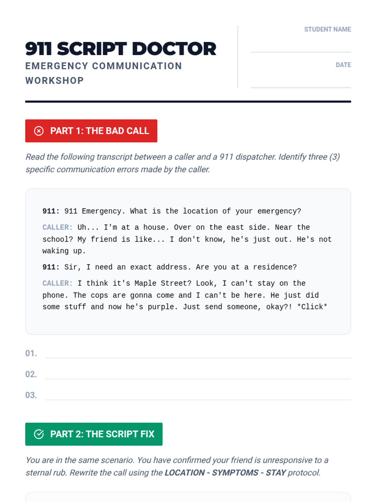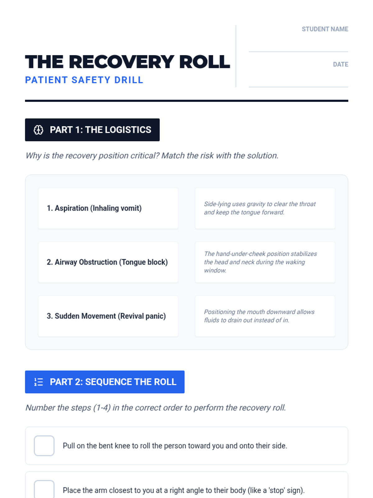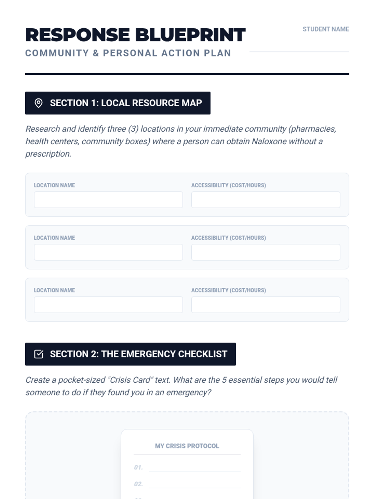 A comprehensive 12th-grade sequence focused on recognizing opioid overdoses, understanding legal protections, and mastering life-saving interventions like Naloxone administration and the recovery position.