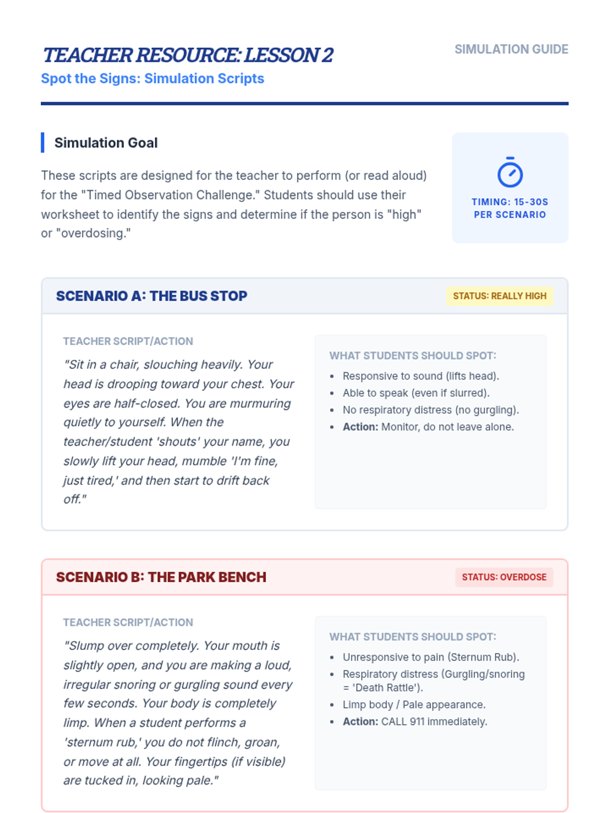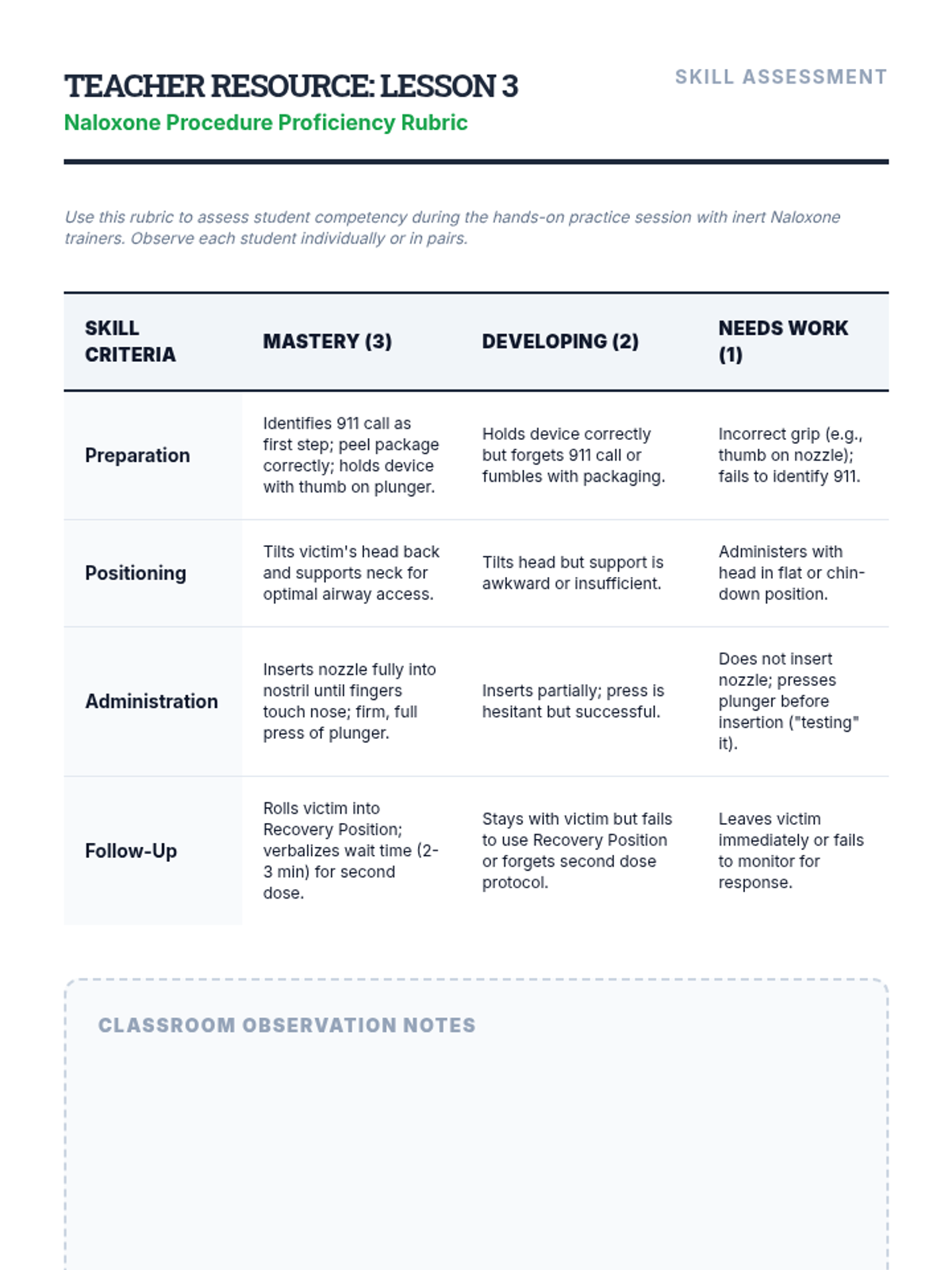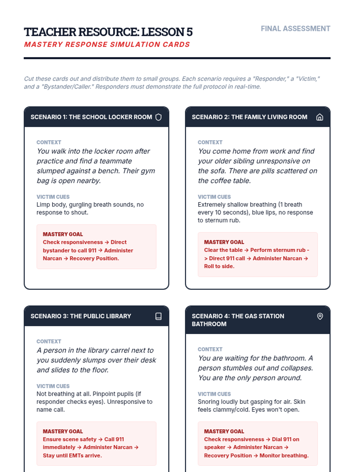 This sequence empowers 10th-grade students with actionable skills to prevent opioid misuse and respond to emergencies. It covers safe prescription management, overdose recognition, Naloxone administration, and legal protections like Good Samaritan laws, culminating in a hands-on response simulation.