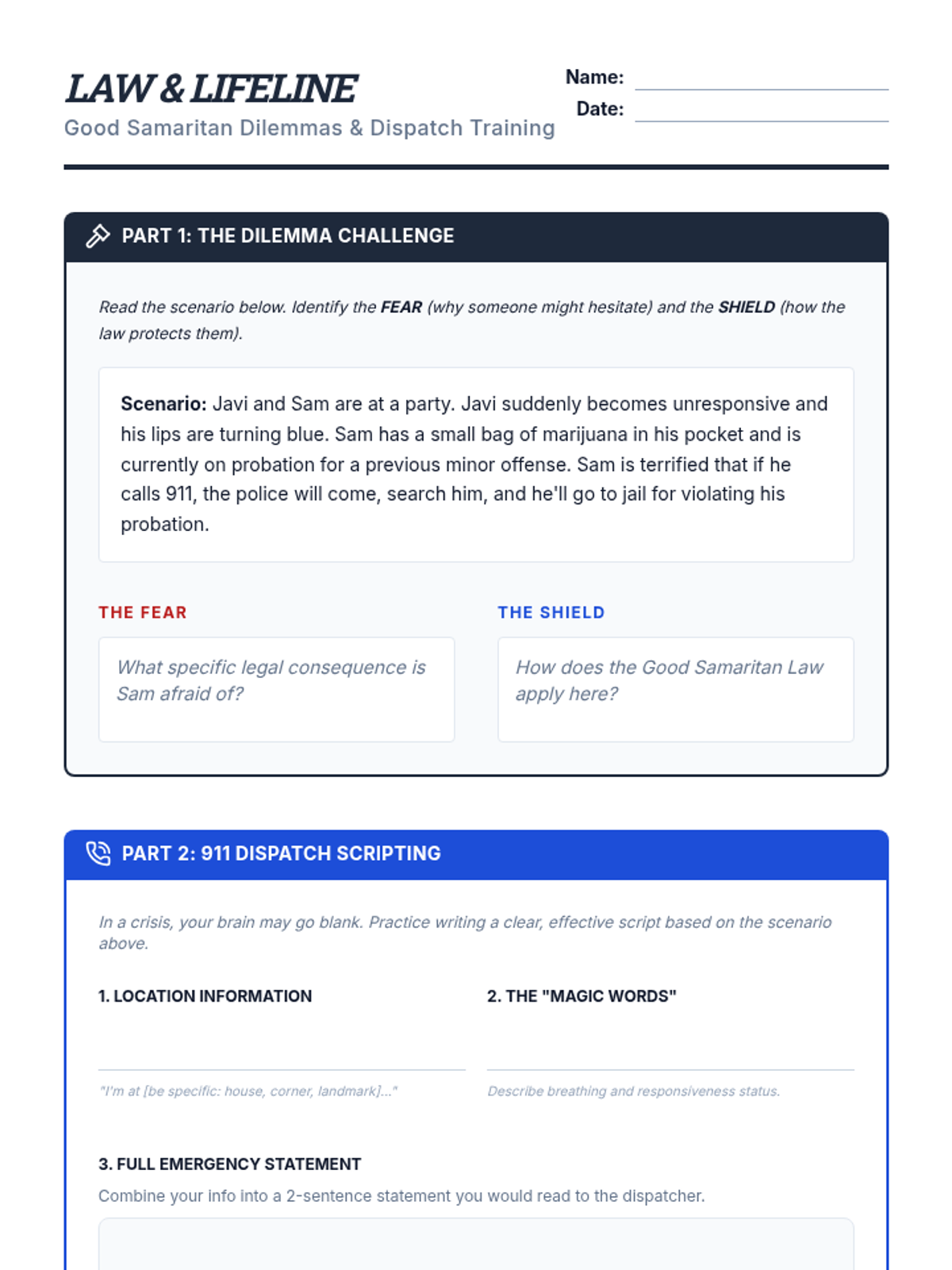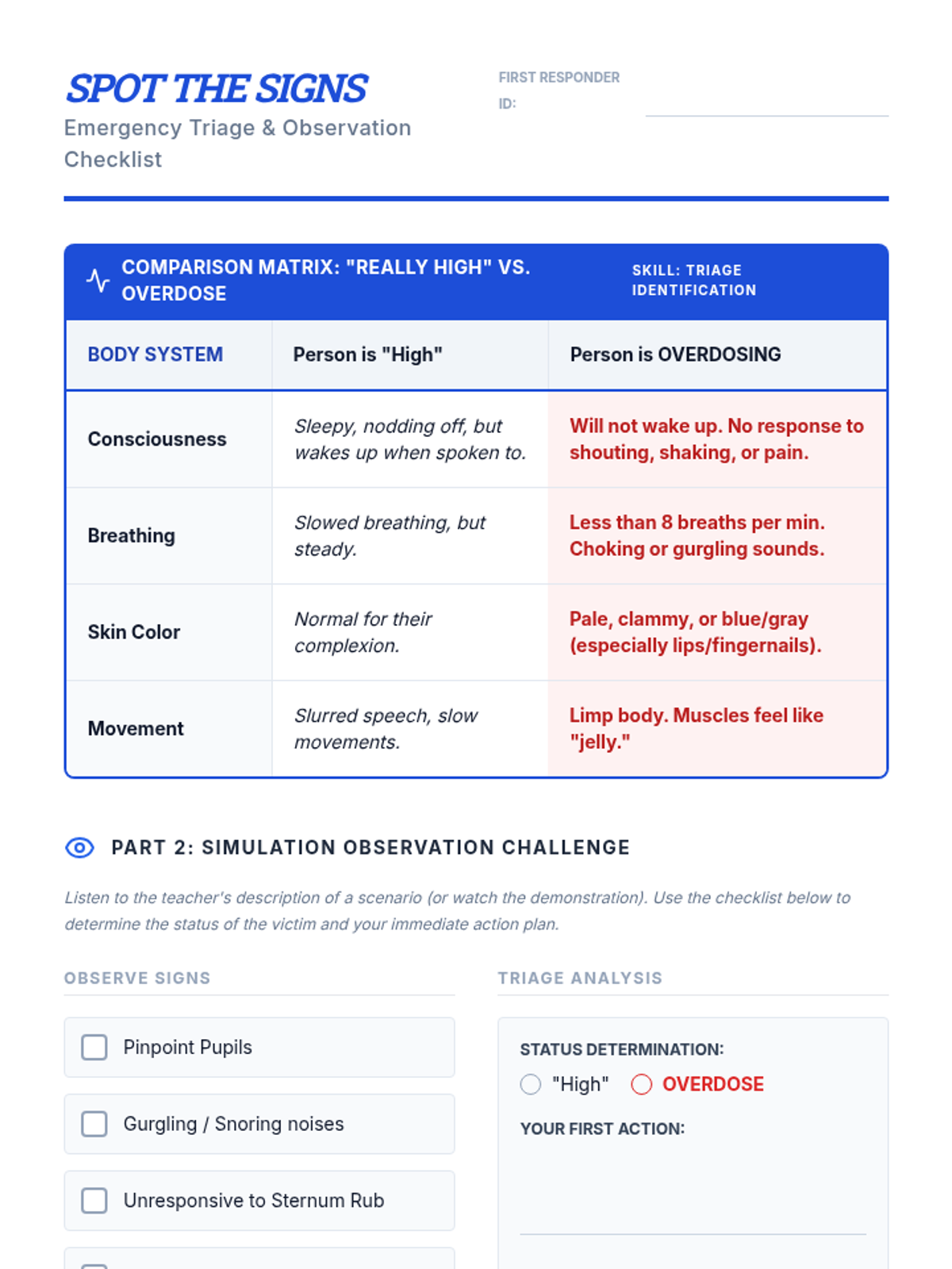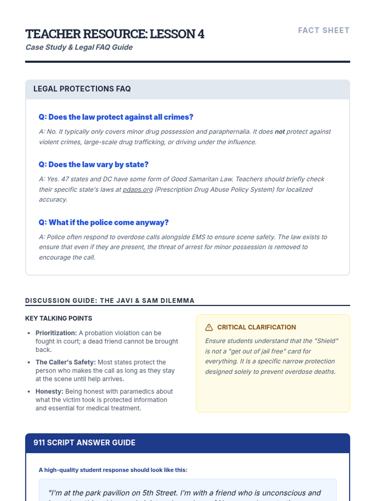 This sequence empowers 10th-grade students with actionable skills to prevent opioid misuse and respond to emergencies. It covers safe prescription management, overdose recognition, Naloxone administration, and legal protections like Good Samaritan laws, culminating in a hands-on response simulation.