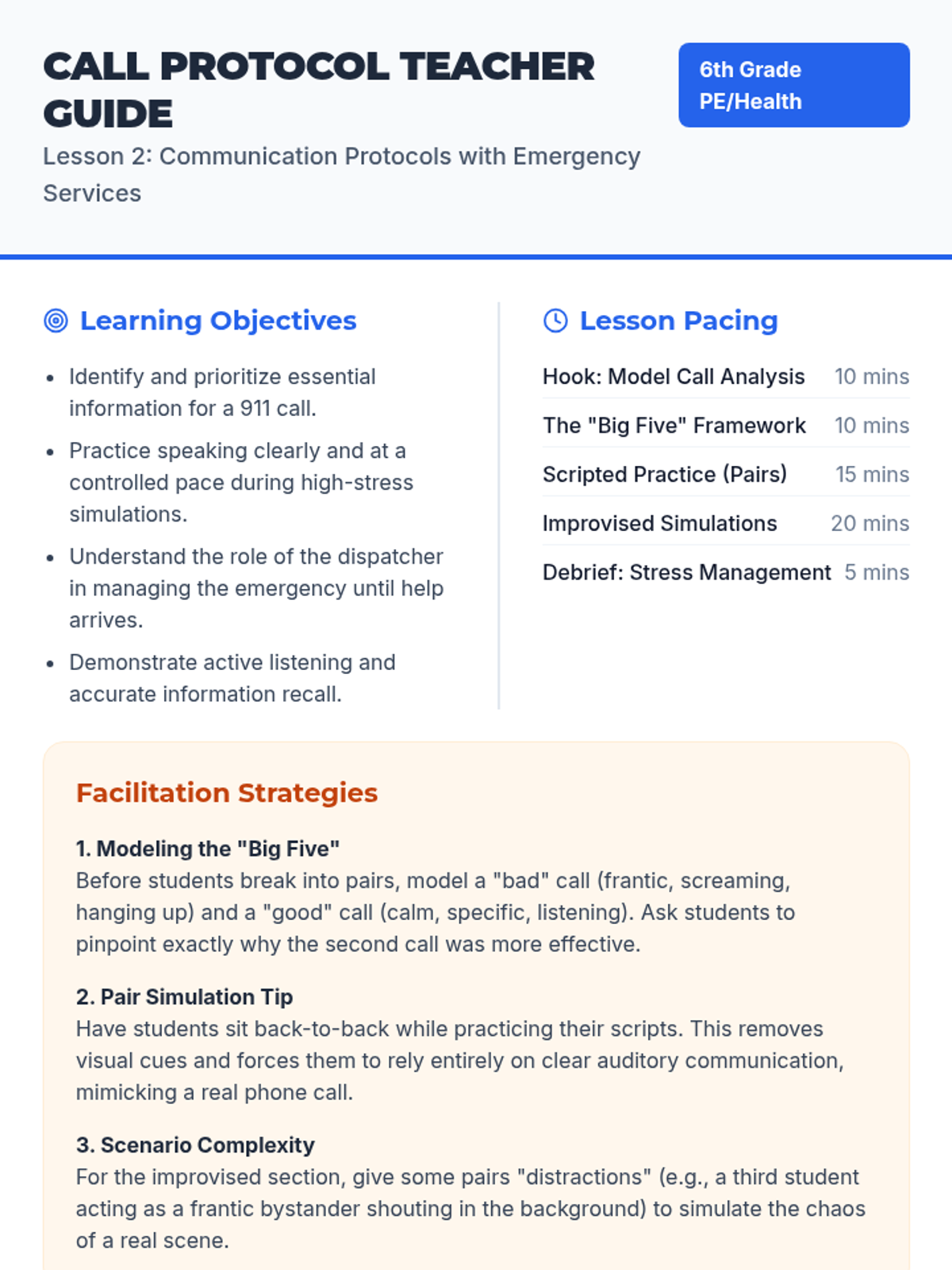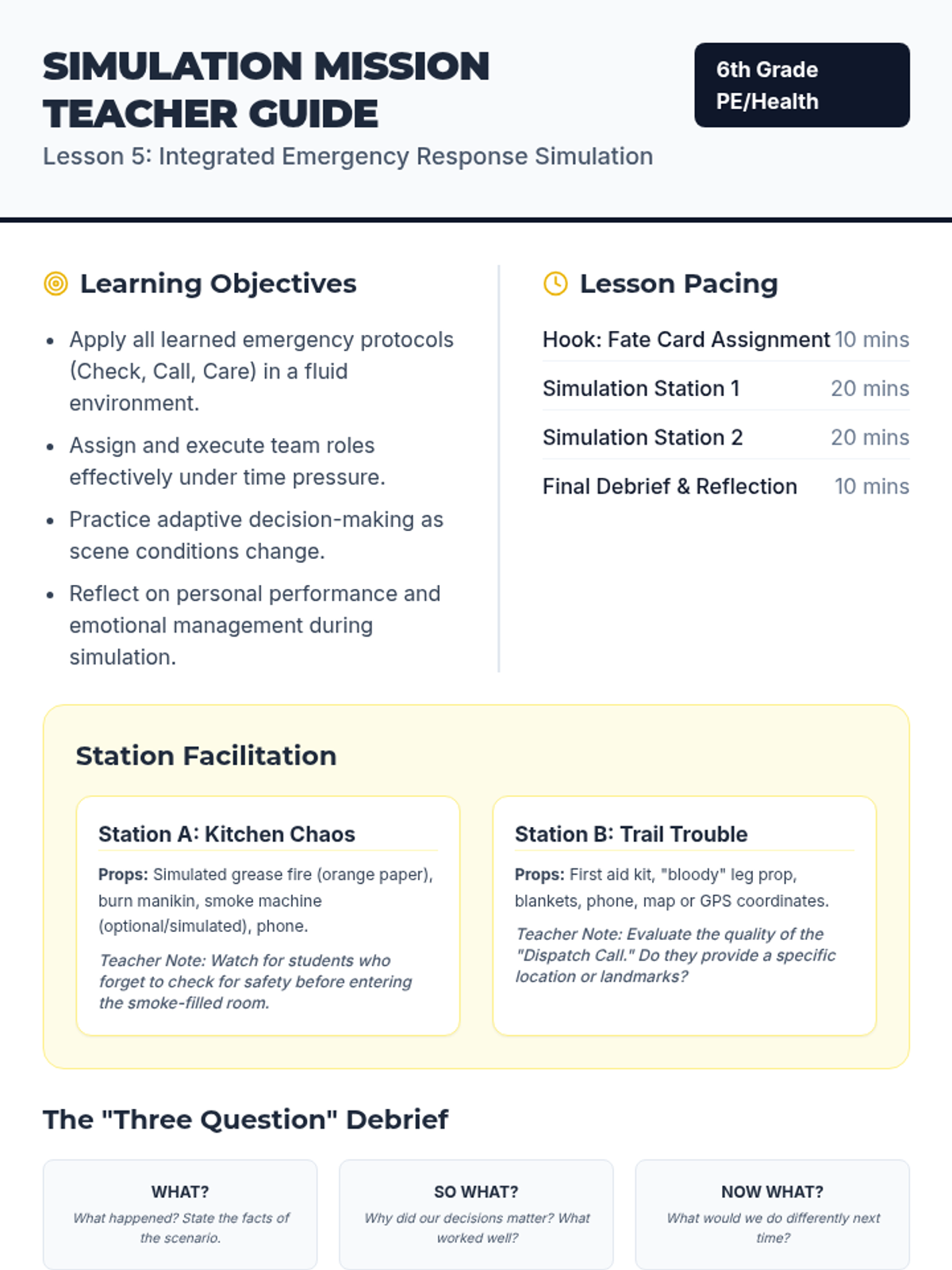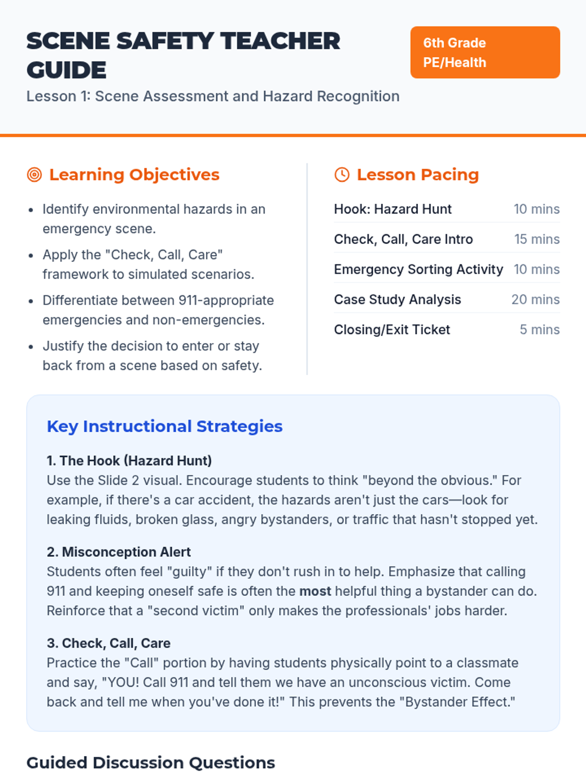 A comprehensive 5-lesson sequence for 6th graders to develop critical thinking and practical skills for emergency response, covering scene assessment, communication, first aid, and fire safety.