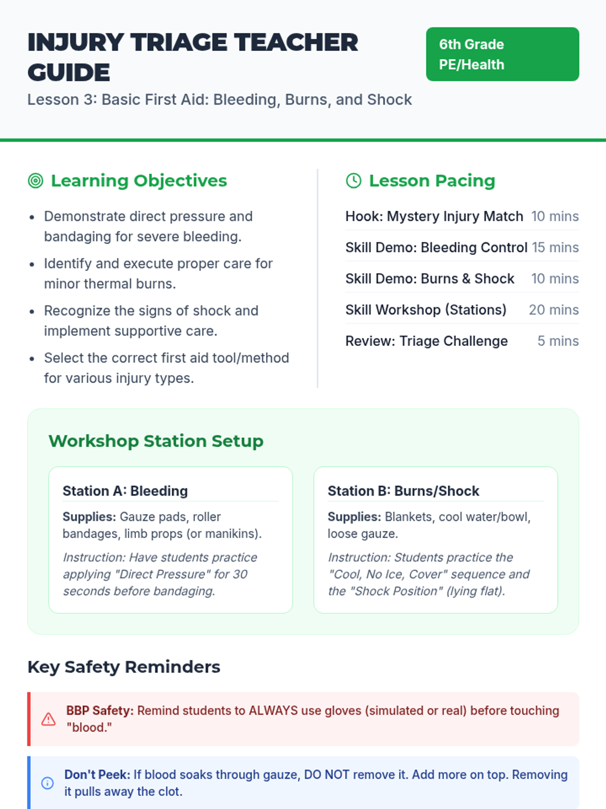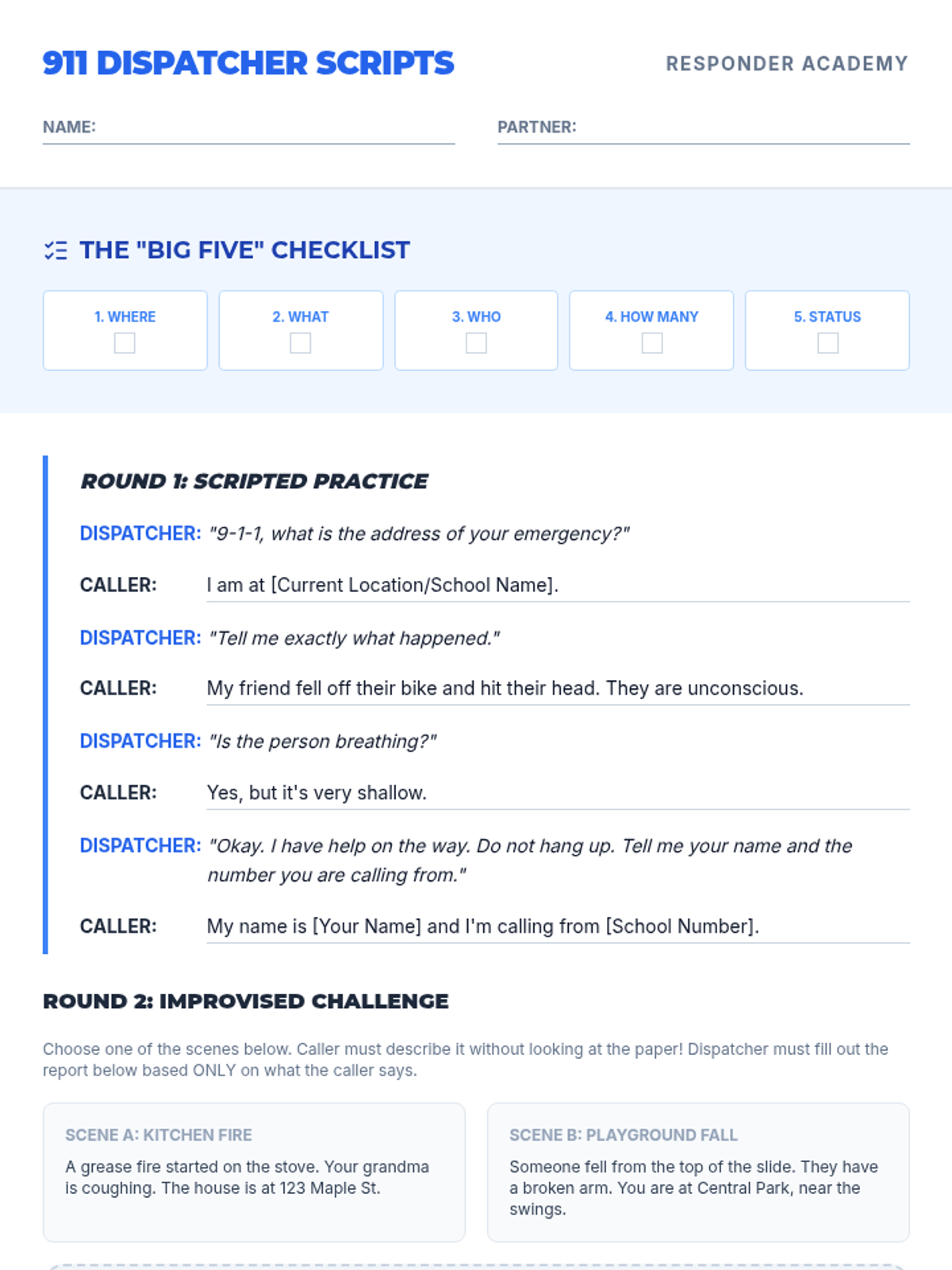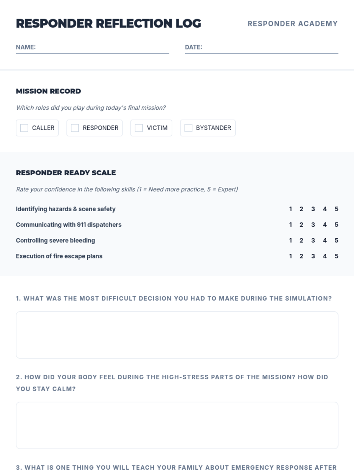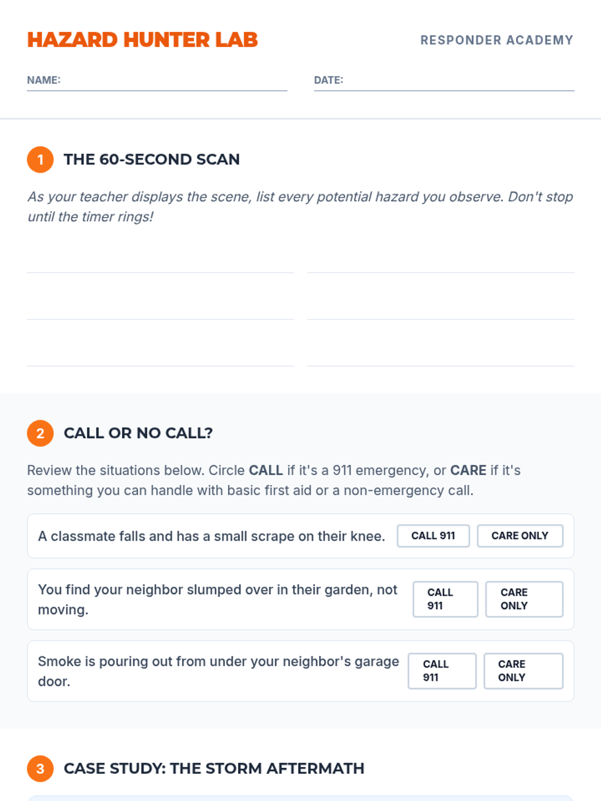 A comprehensive 5-lesson sequence for 6th graders to develop critical thinking and practical skills for emergency response, covering scene assessment, communication, first aid, and fire safety.