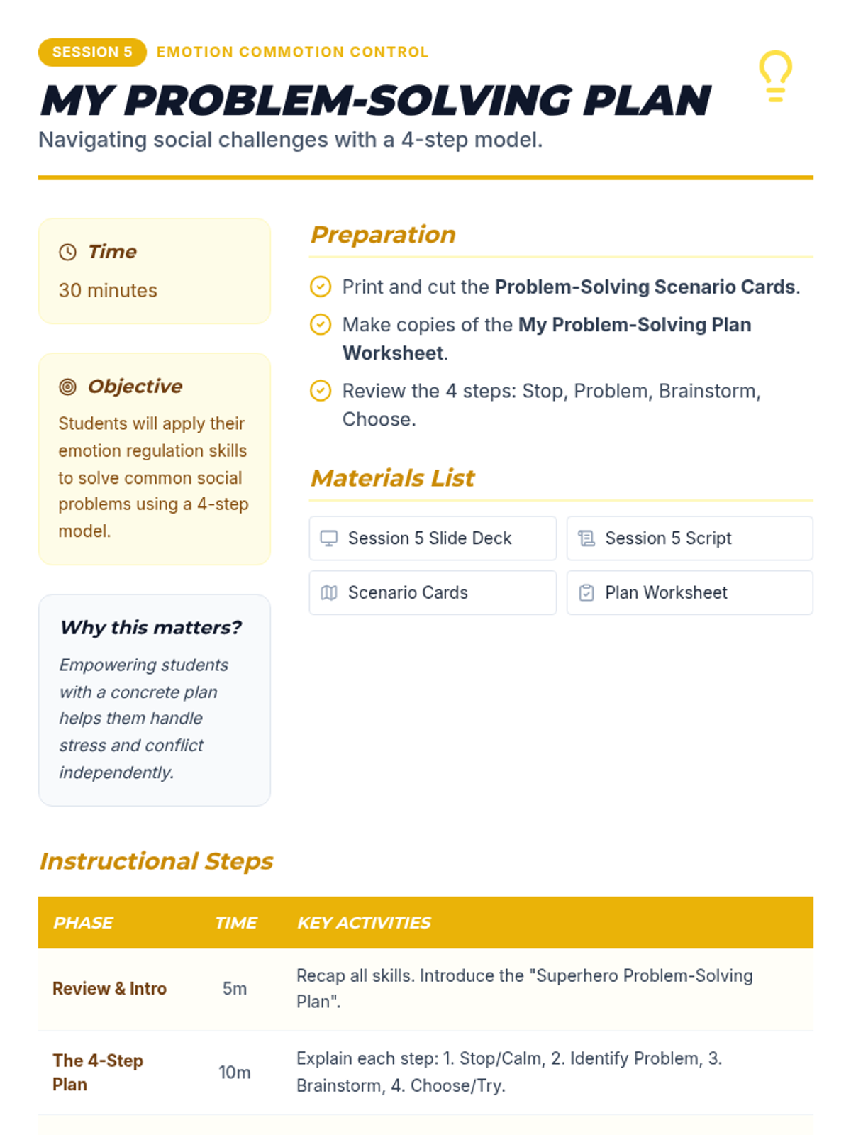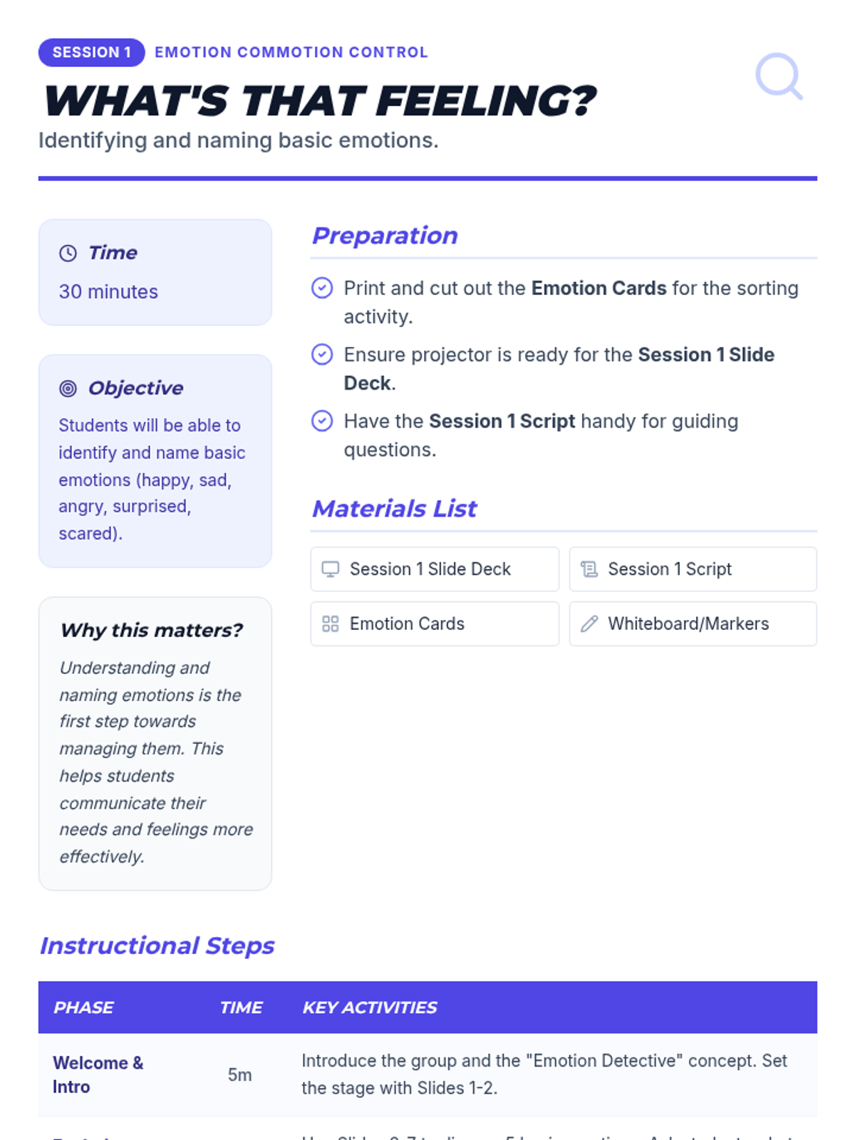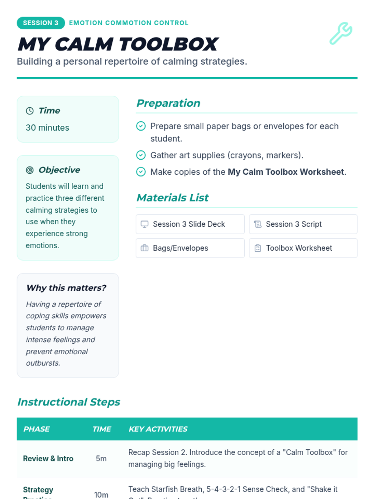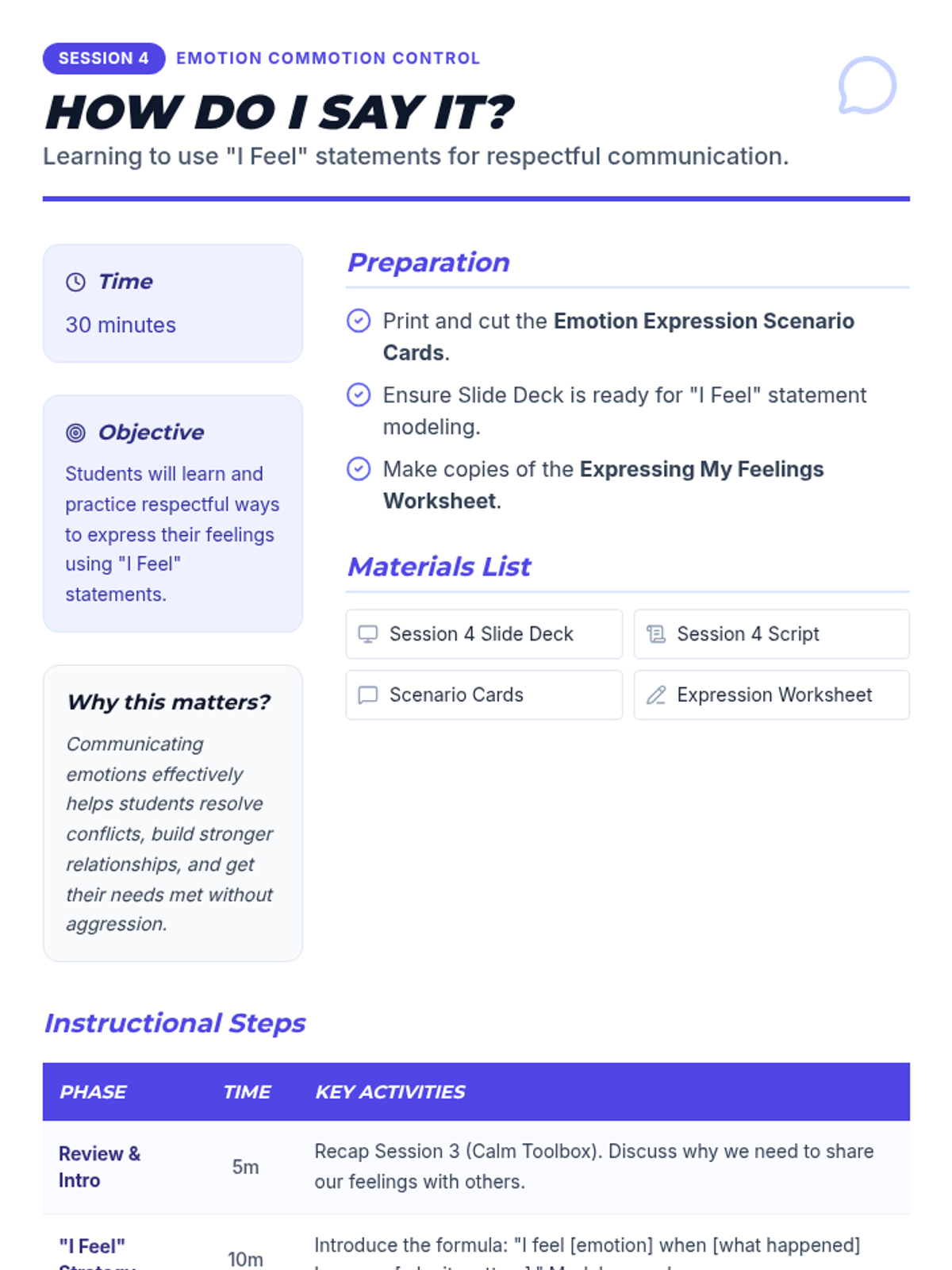 A 6-session Tier 2 social-emotional learning curriculum for 4th graders, focusing on identifying emotions, understanding triggers, developing calming strategies, and effective communication.