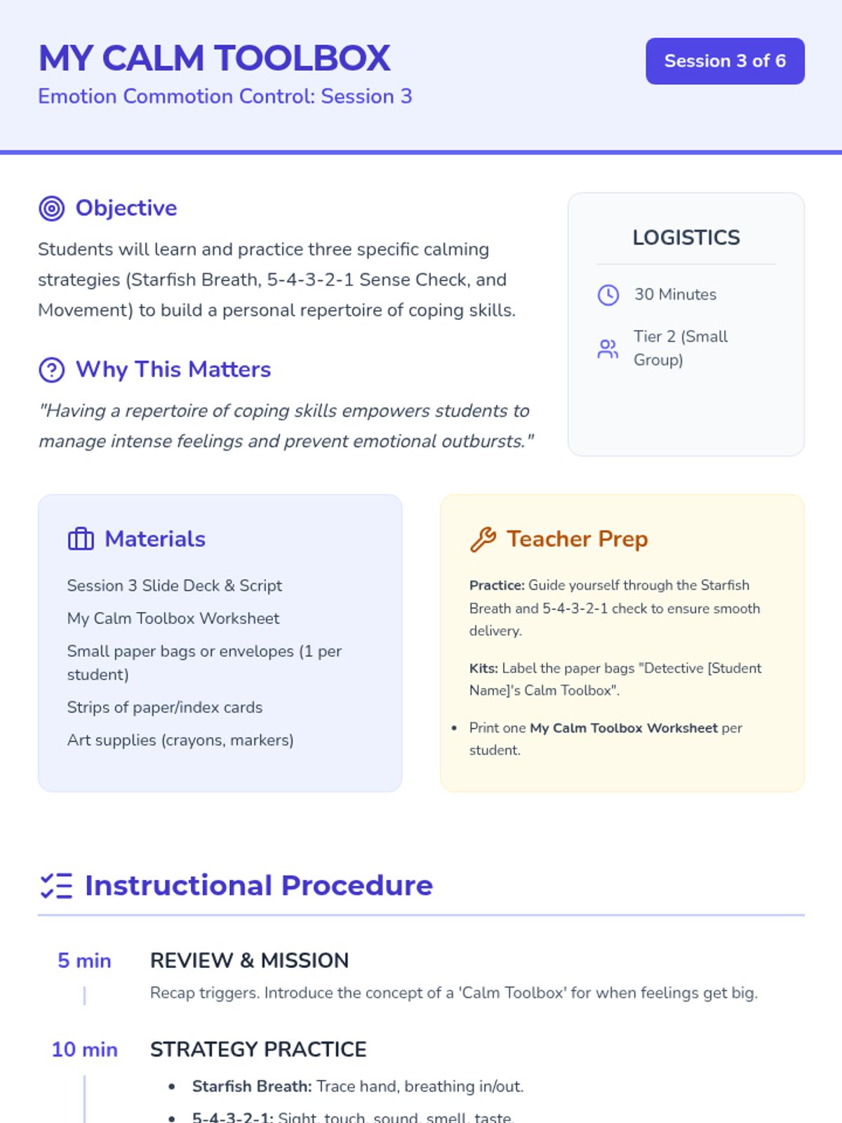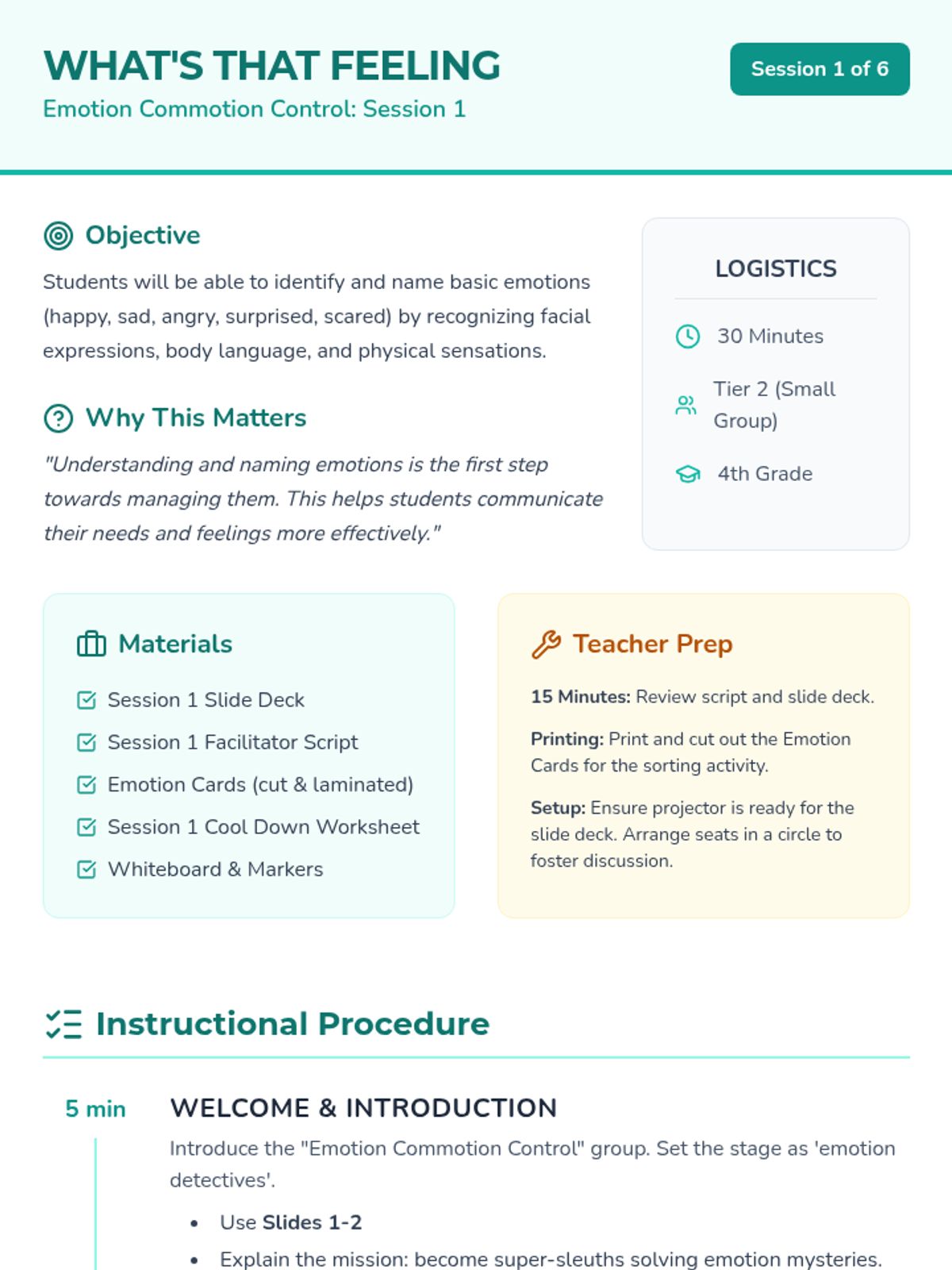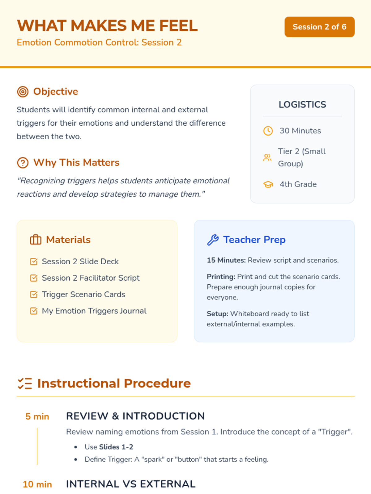 A comprehensive 6-session Tier 2 intervention curriculum for 4th-grade students focused on emotional identification, trigger awareness, calming strategies, assertive communication, and problem-solving.