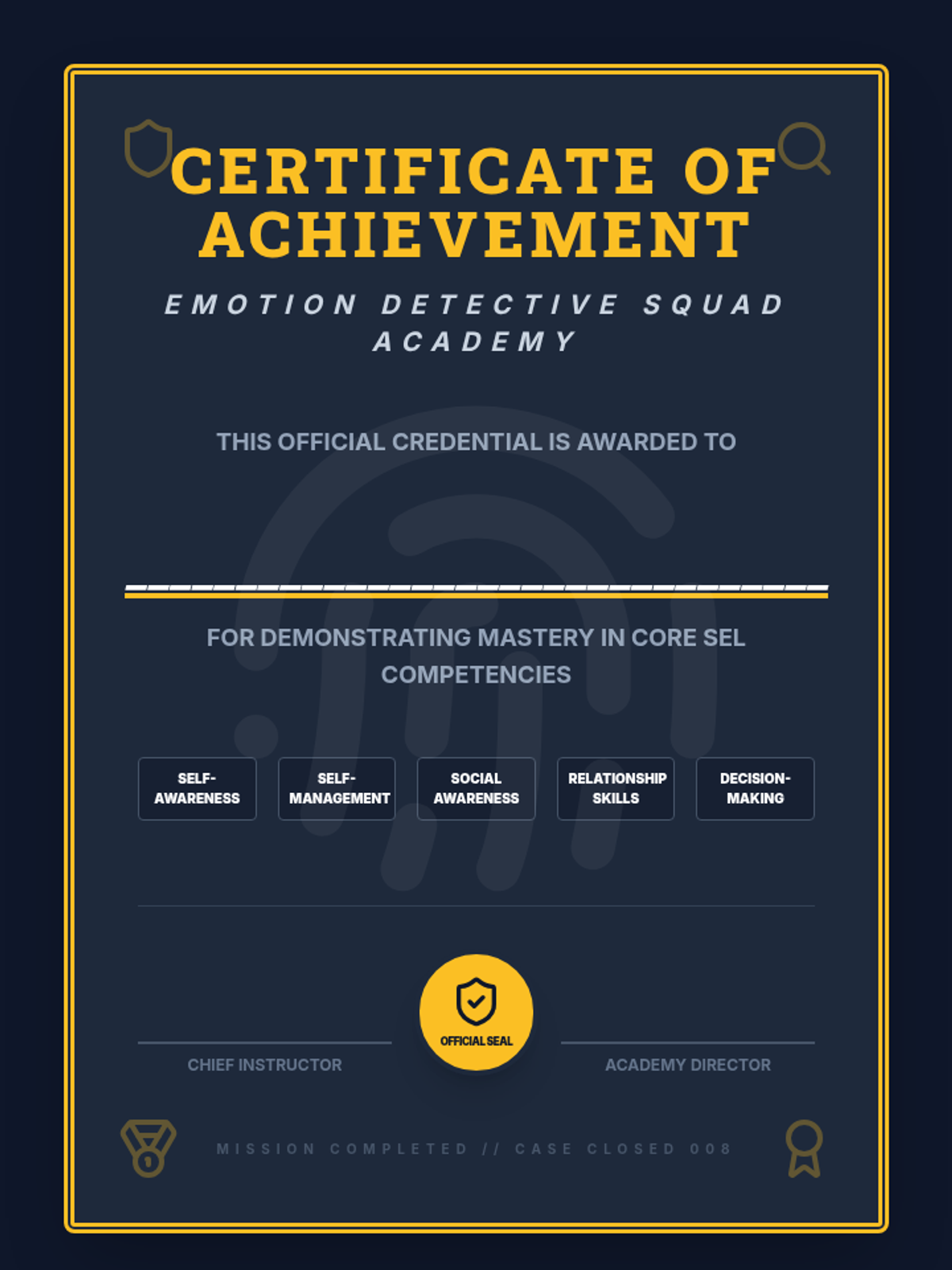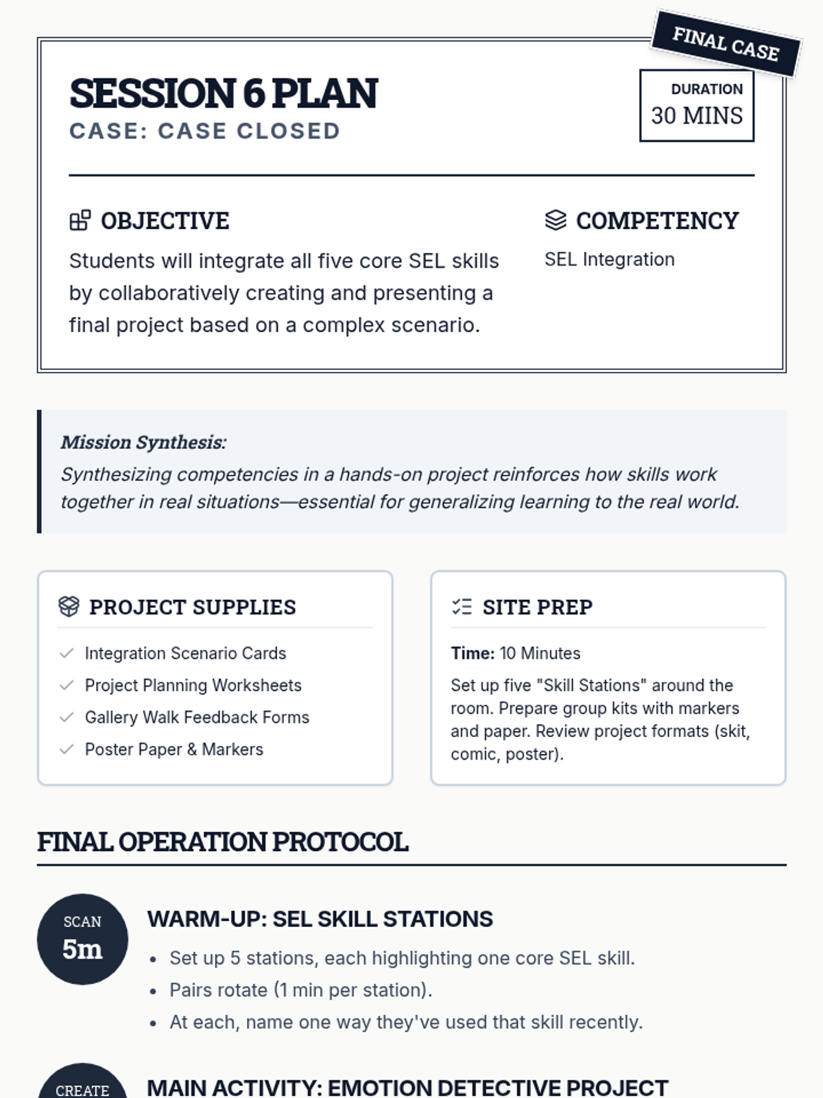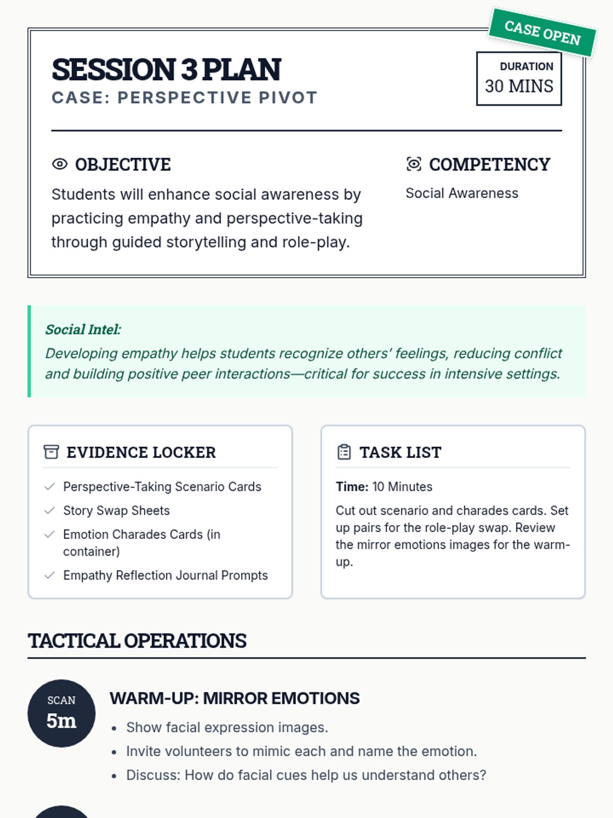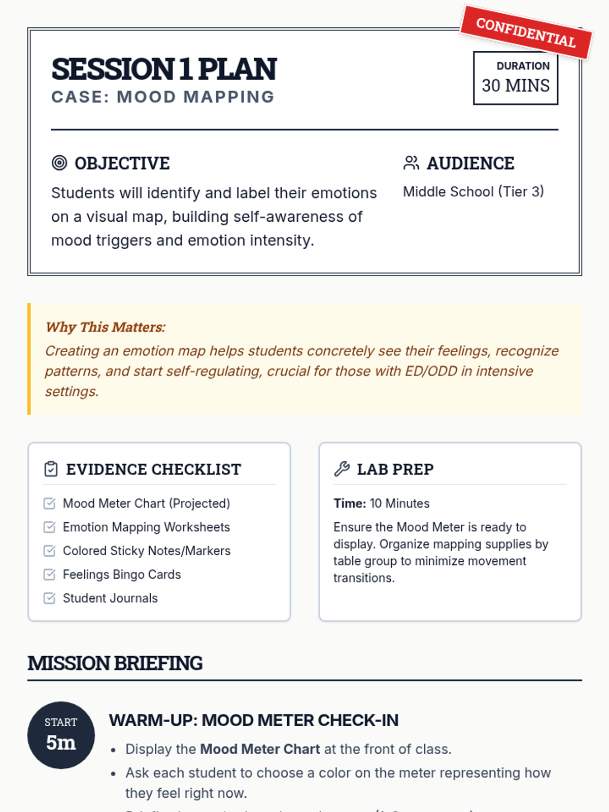 An 8-session intensive social-emotional learning program designed for middle school students with emotional disturbances and ODD, using a detective-themed approach to master self-awareness and relationship skills.
